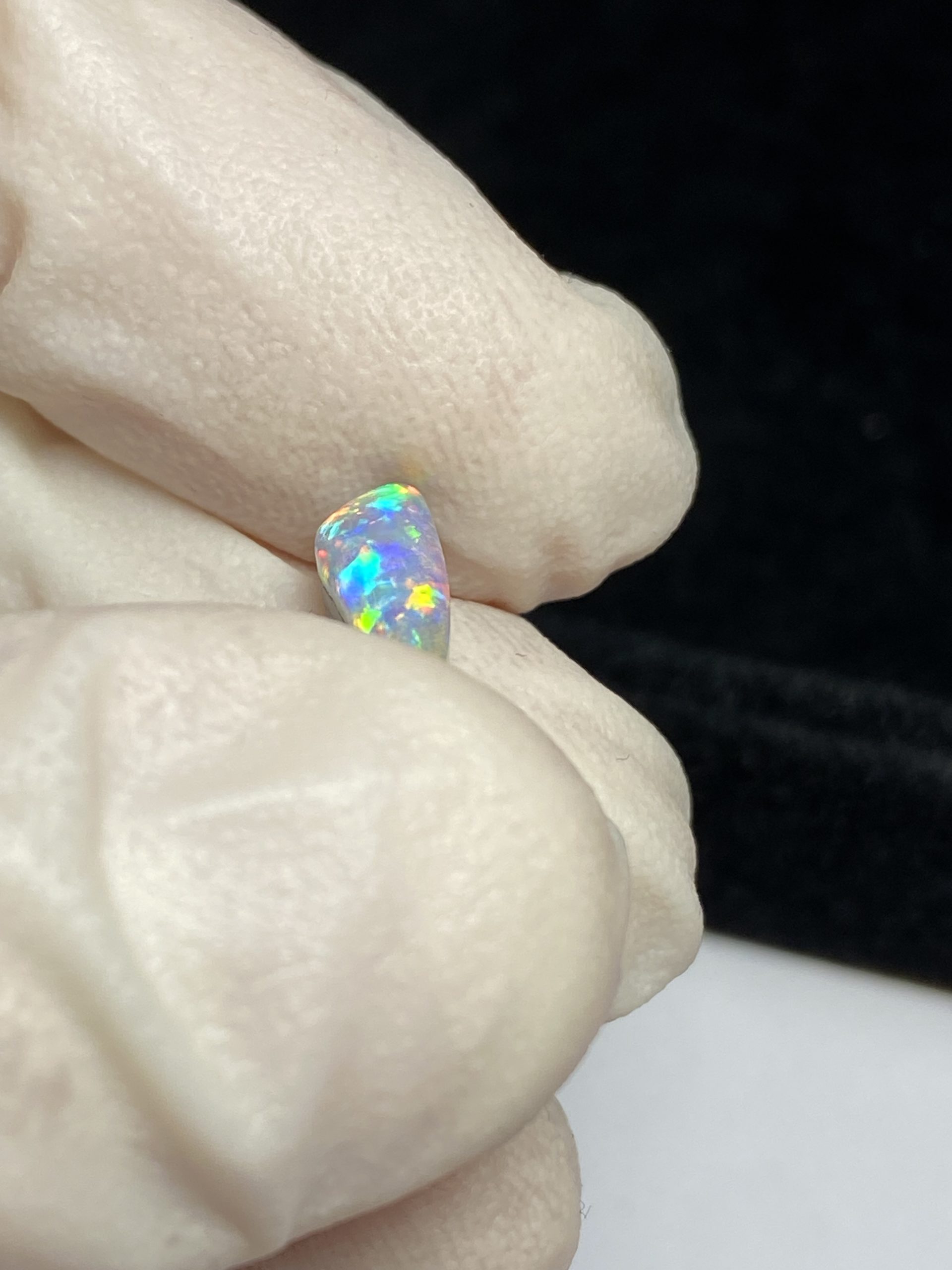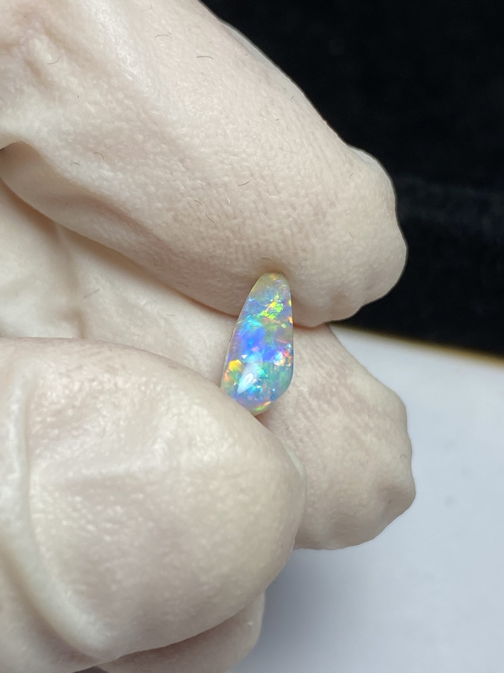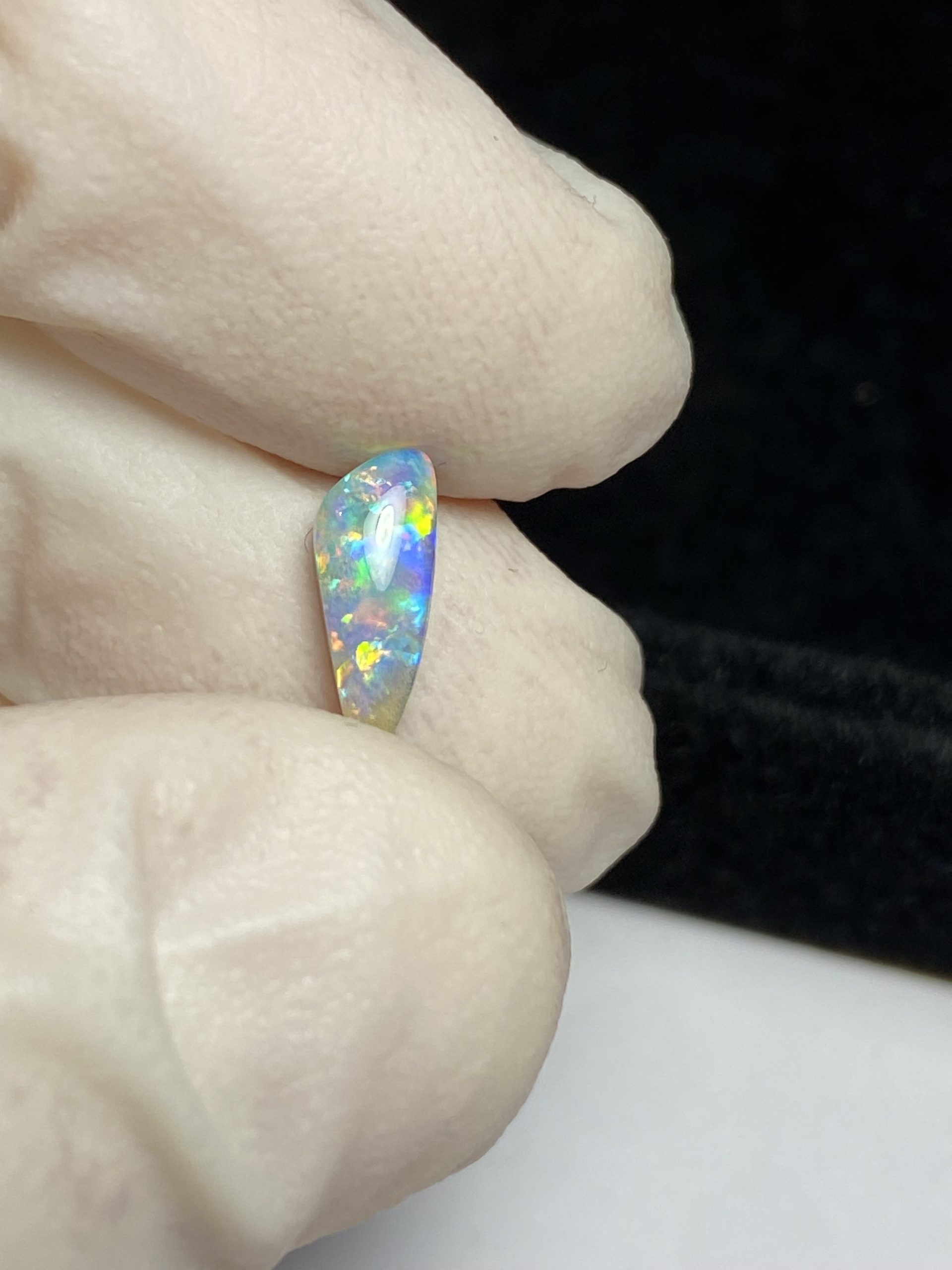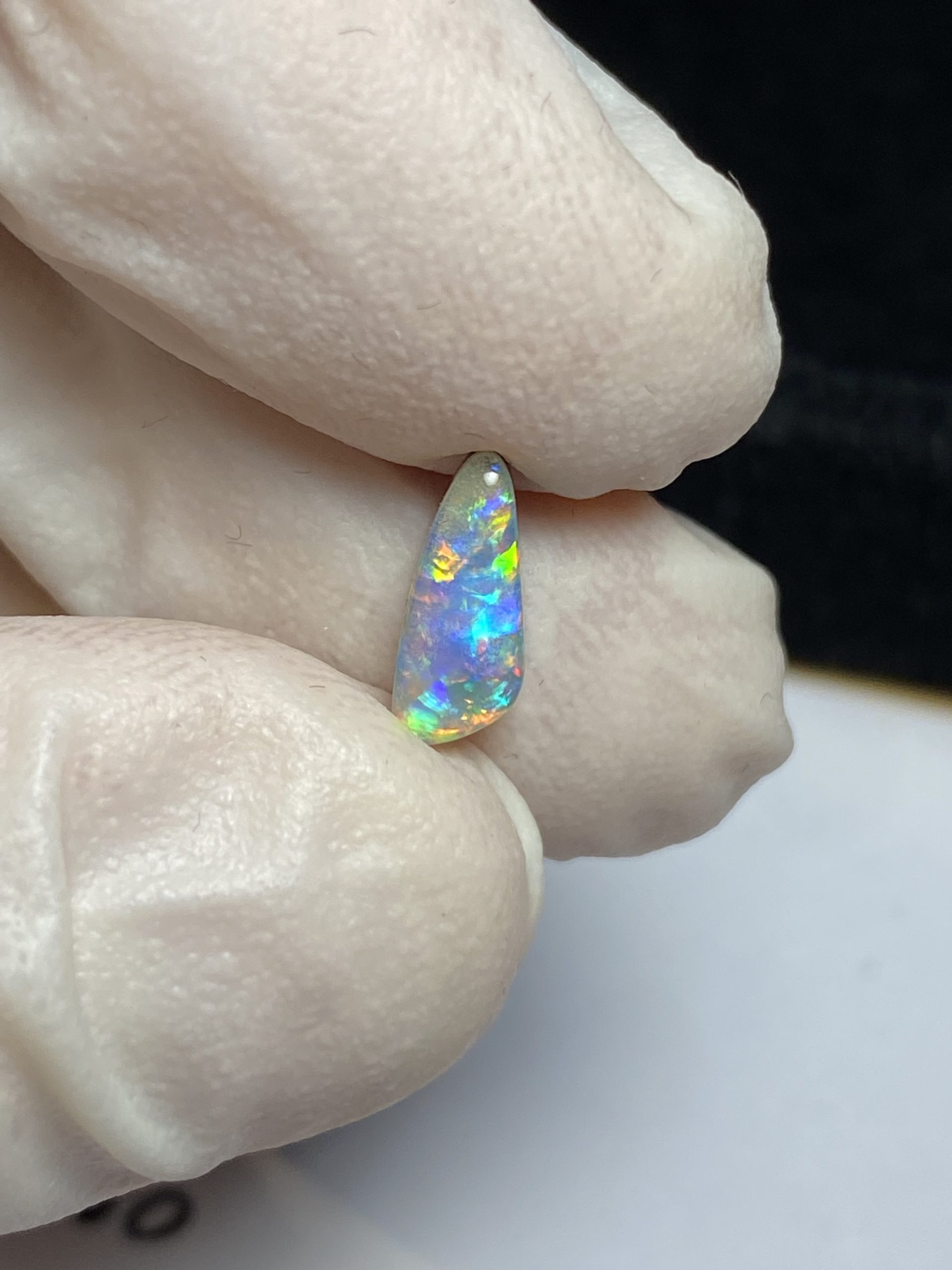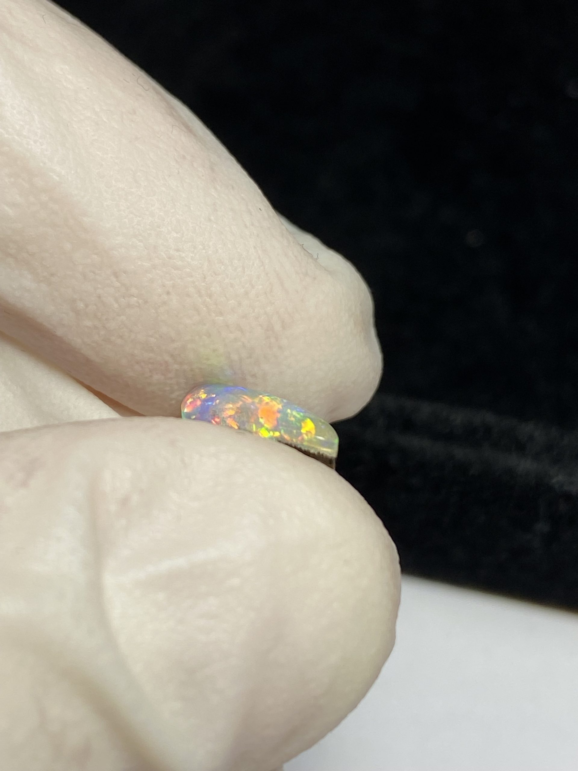 ECLAIRAGE ET COULEURS: Toutes les photos et vidéos ont été prises avec éclairage direct (sous lampe de bureau avec ampoule LED couleur « blanche froide »). Les feux de l’opale seront moins forts sans exposition au soleil ou éclairage direct. Les couleurs de l’opale varient également selon le type d’éclairage et le fond/arrière-plan. En général, le bleu sur les photos/vidéos, est plus proche du violet en réalité sous la plupart des d’éclairages.