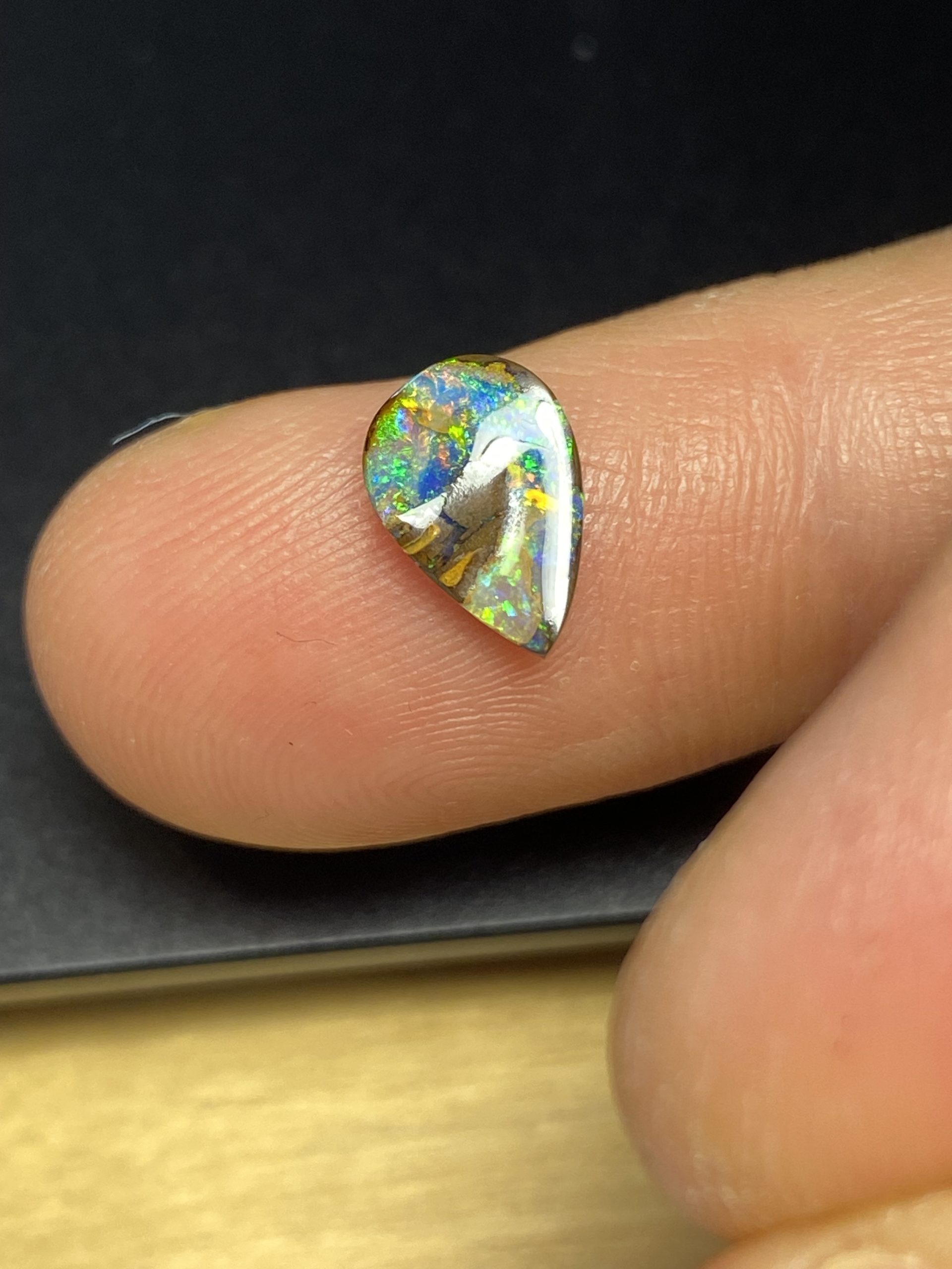 ECLAIRAGE ET COULEURS: Toutes les photos et vidéos ont été prises avec éclairage direct (sous lampe de bureau avec ampoule LED couleur « blanche froide »). Les feux de l’opale seront moins forts sans exposition au soleil ou éclairage direct. Les couleurs de l’opale varient également selon le type d’éclairage et le fond/arrière-plan. En général, le bleu sur les photos/vidéos, est plus proche du violet en réalité sous la plupart des d’éclairages.