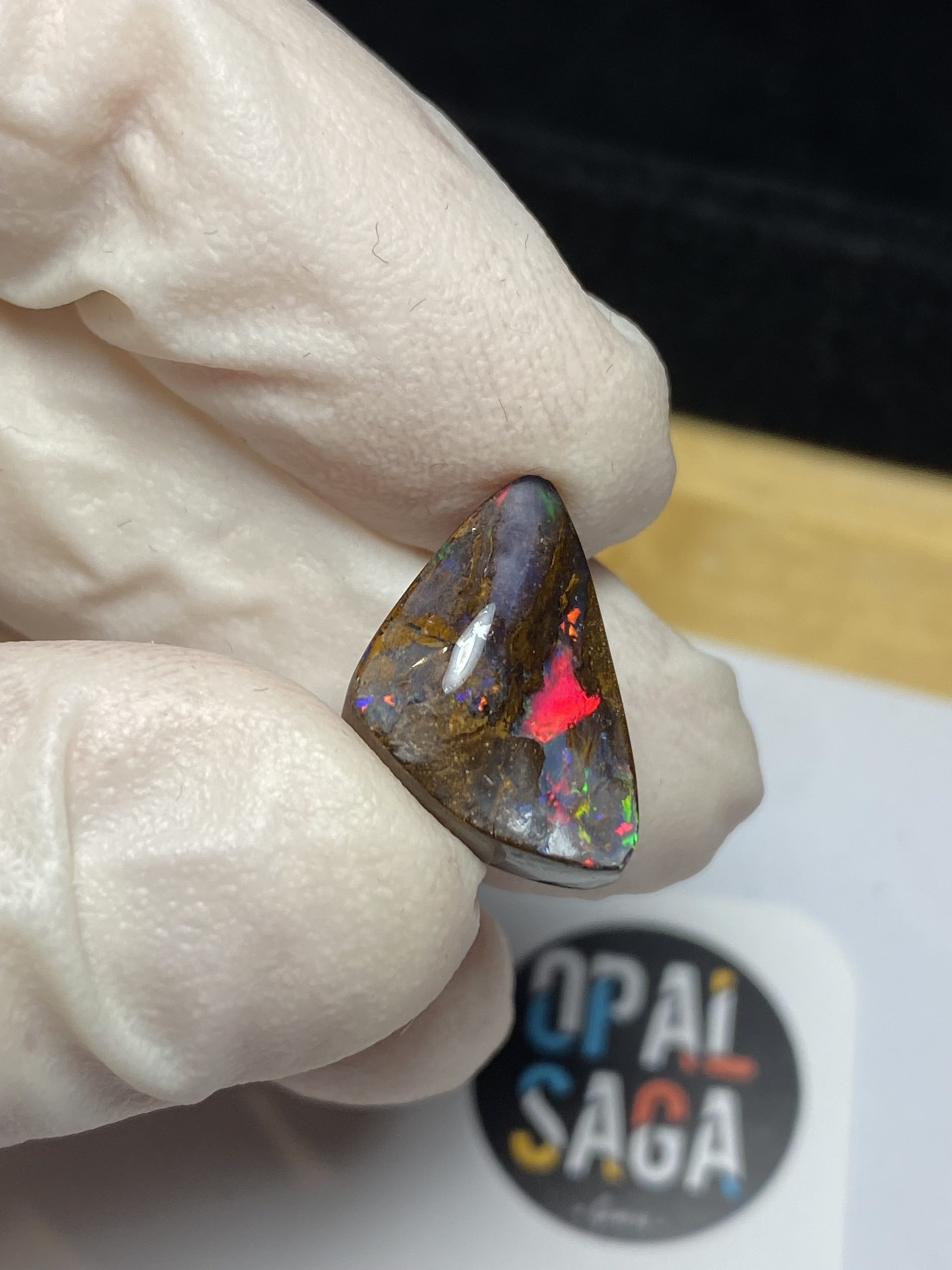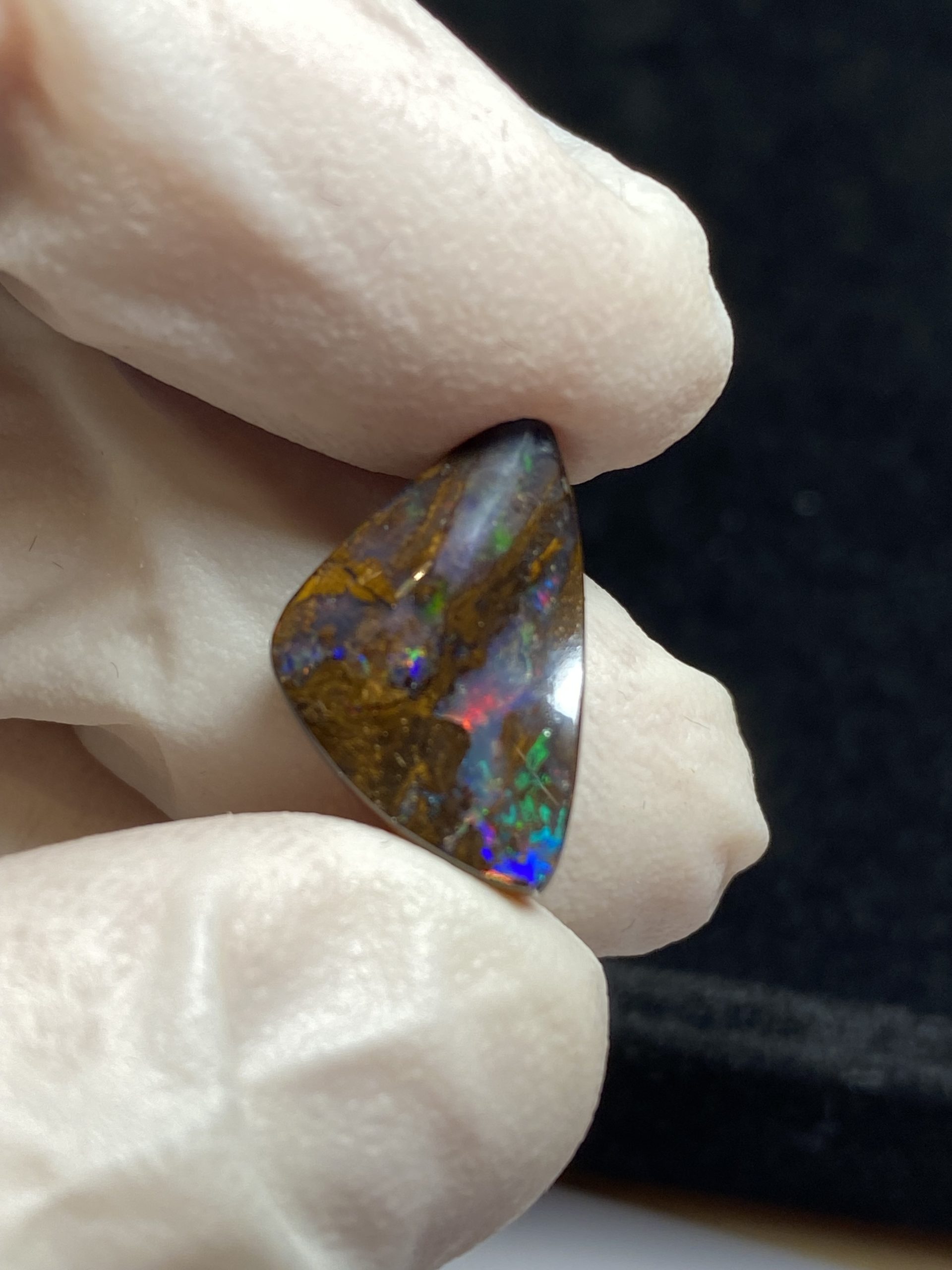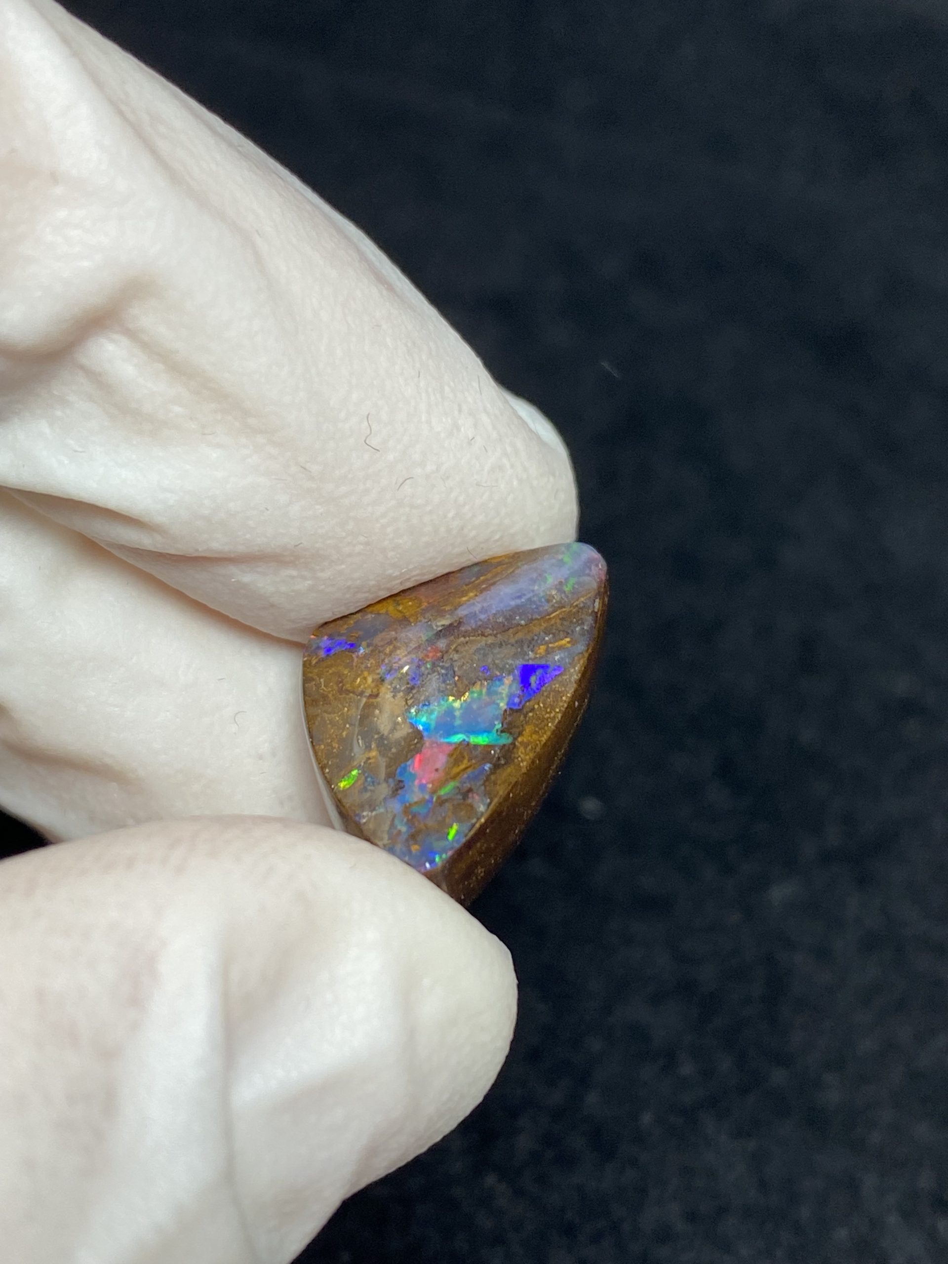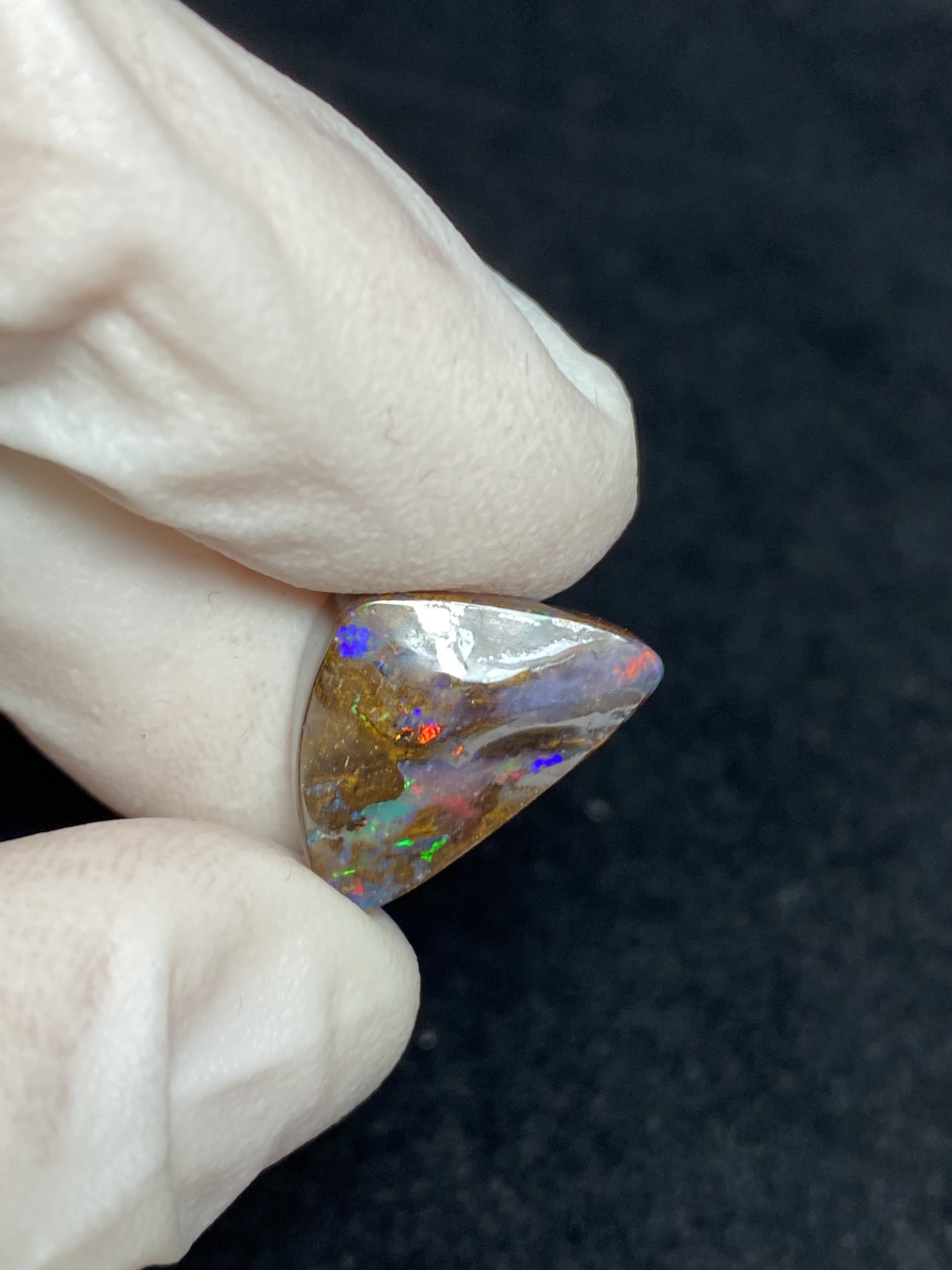 ECLAIRAGE ET COULEURS: Toutes les photos et vidéos ont été prises avec éclairage direct (sous lampe de bureau avec ampoule LED couleur « blanche froide »). Les feux de l’opale seront moins forts sans exposition au soleil ou éclairage direct. Les couleurs de l’opale varient également selon le type d’éclairage et le fond/arrière-plan. En général, le bleu sur les photos/vidéos, est plus proche du violet en réalité sous la plupart des d’éclairages.
