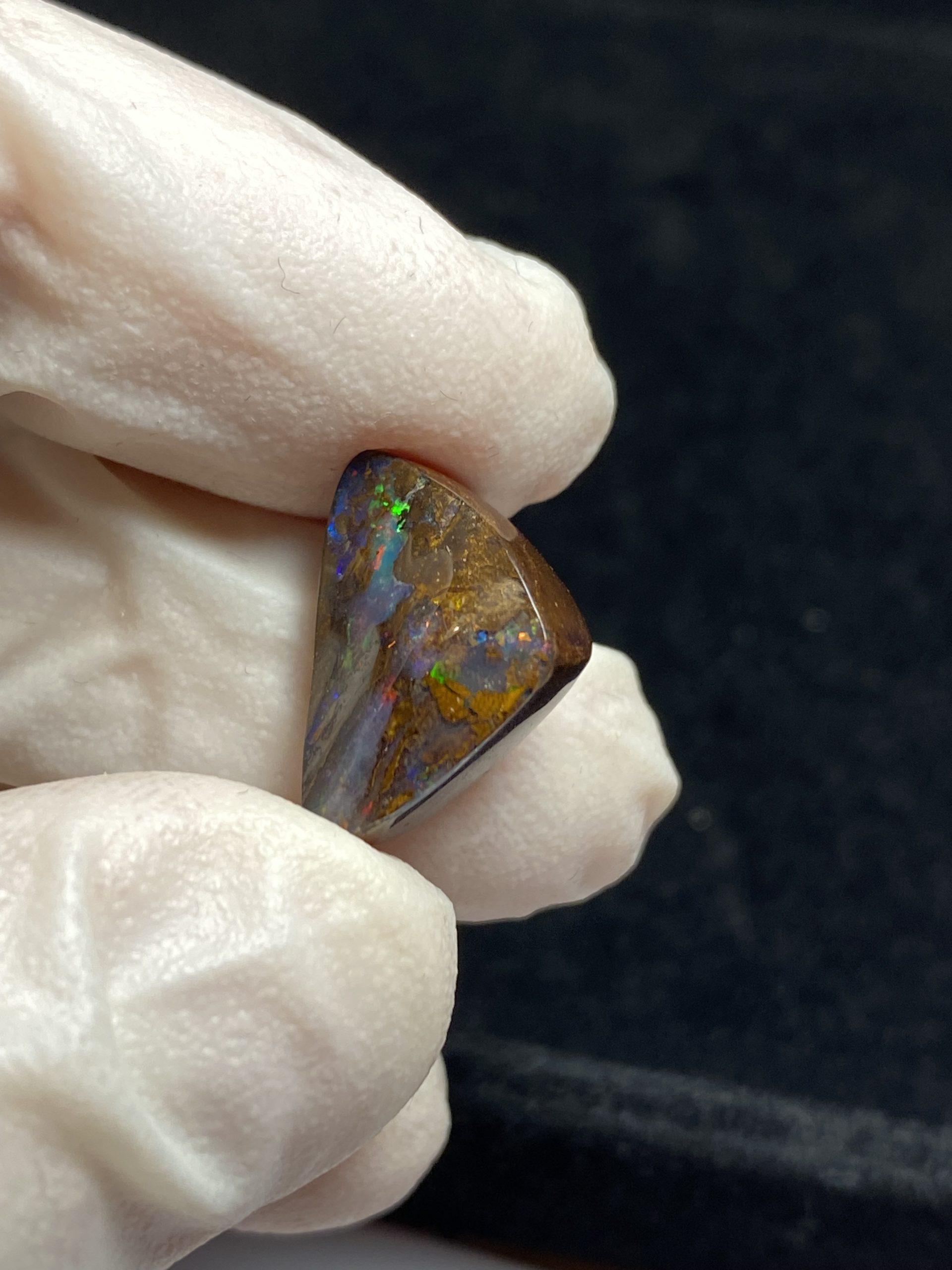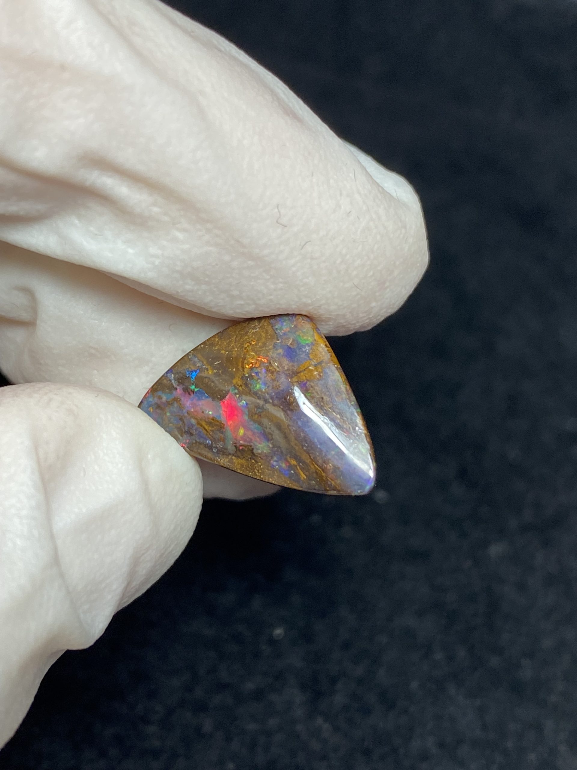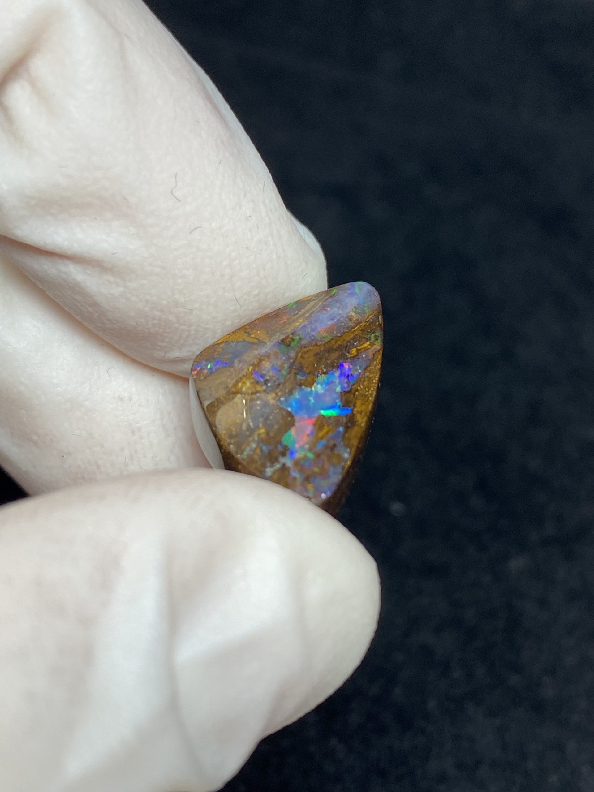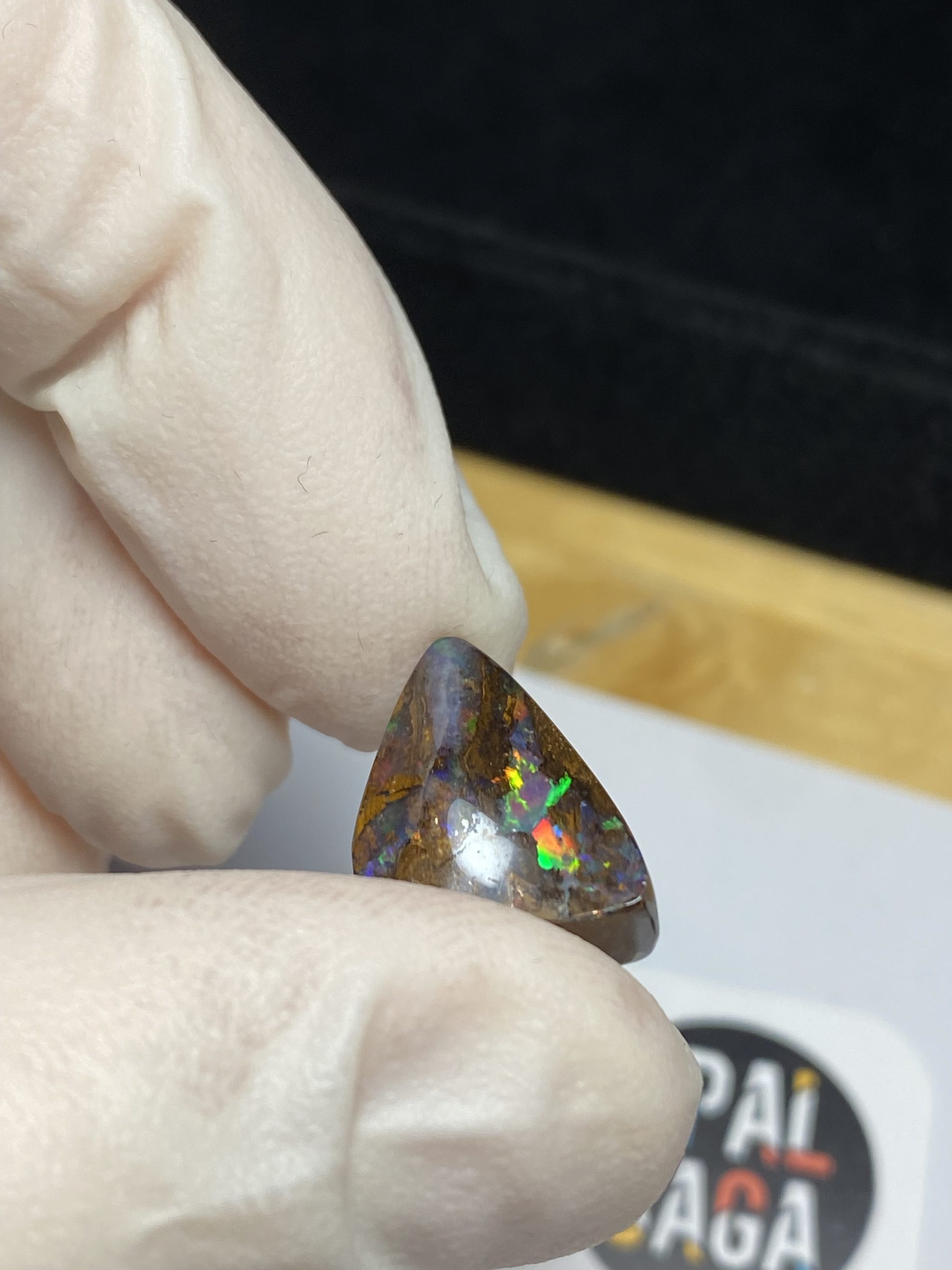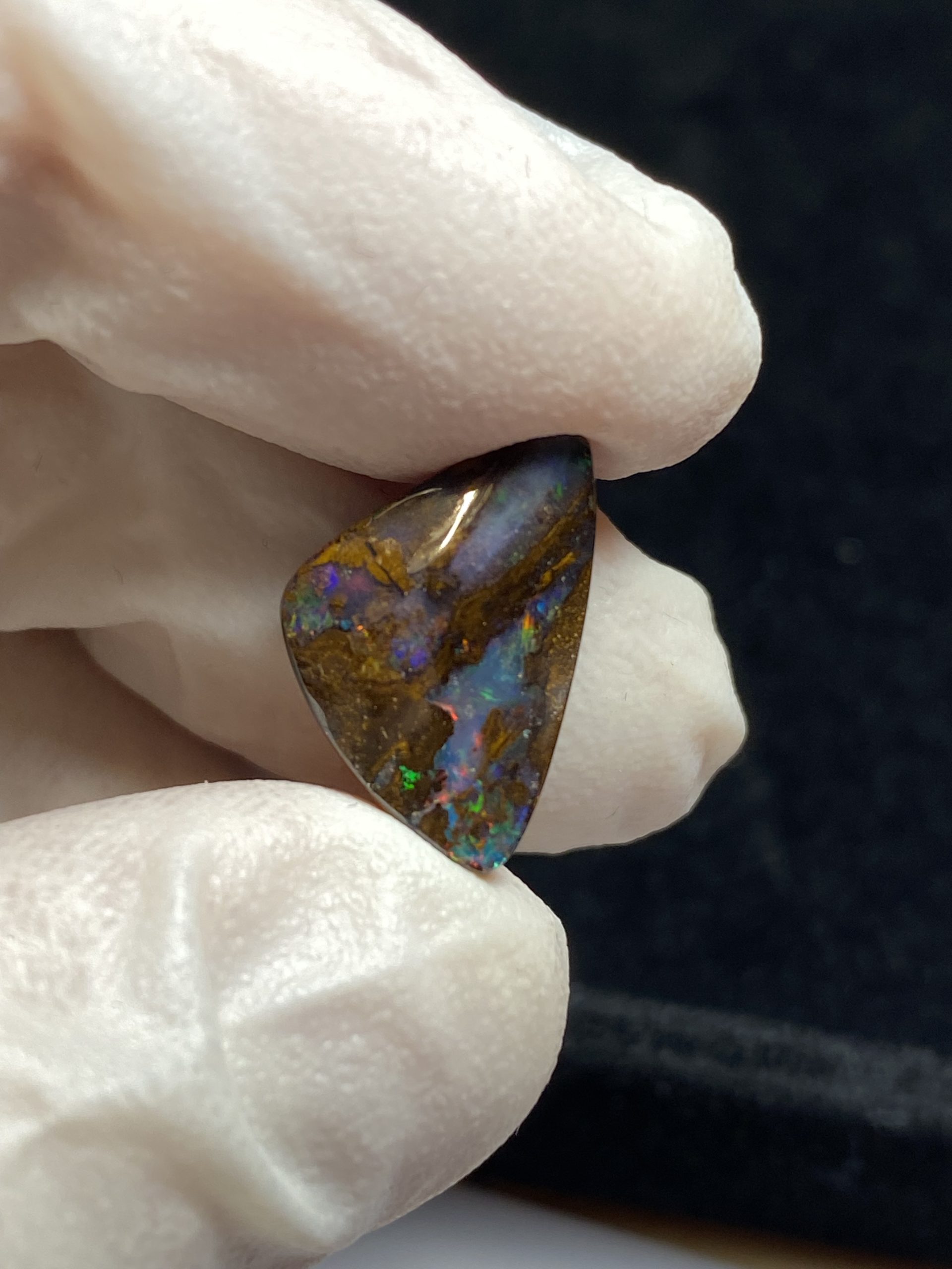 ECLAIRAGE ET COULEURS: Toutes les photos et vidéos ont été prises avec éclairage direct (sous lampe de bureau avec ampoule LED couleur « blanche froide »). Les feux de l’opale seront moins forts sans exposition au soleil ou éclairage direct. Les couleurs de l’opale varient également selon le type d’éclairage et le fond/arrière-plan. En général, le bleu sur les photos/vidéos, est plus proche du violet en réalité sous la plupart des d’éclairages.