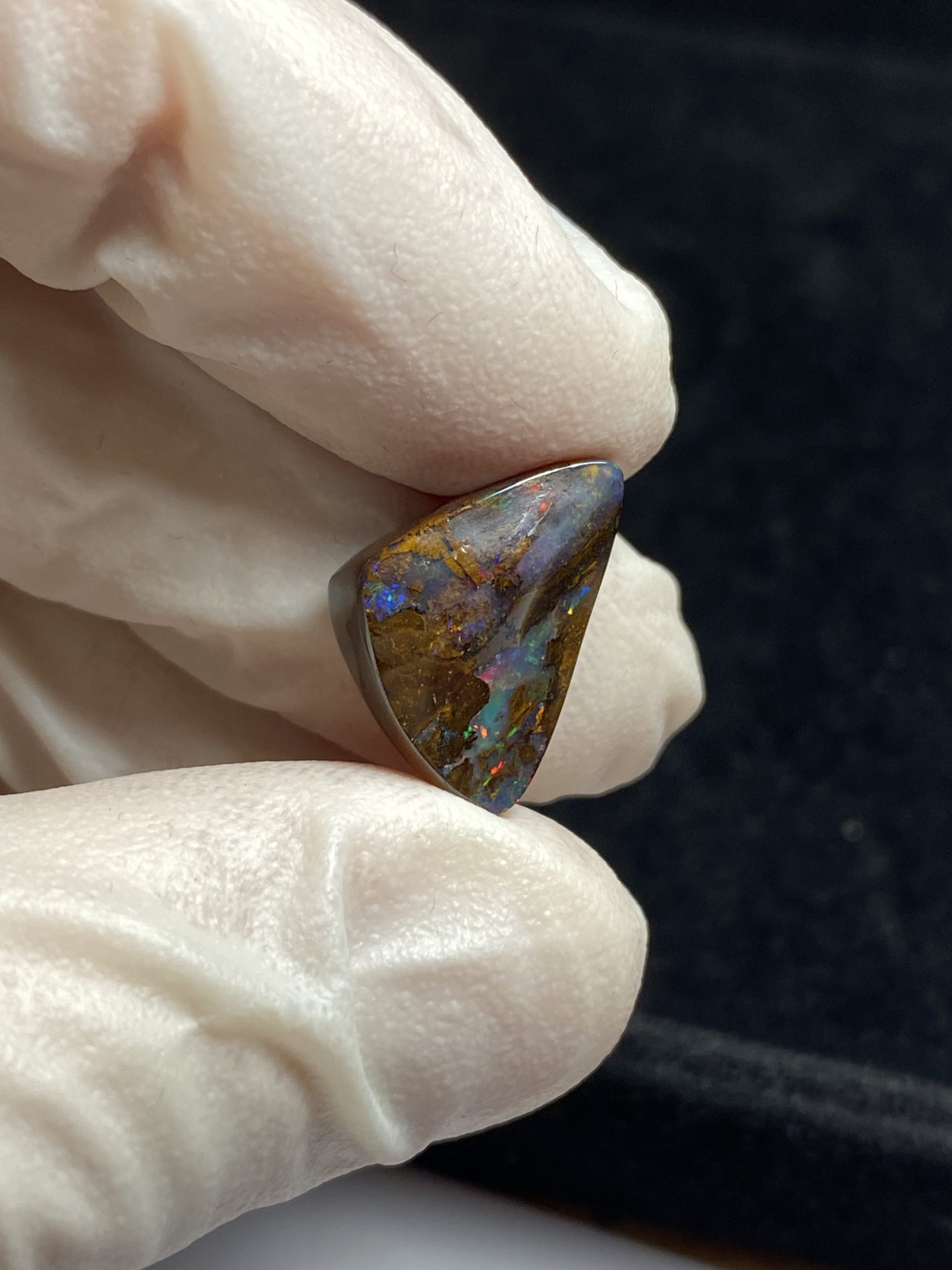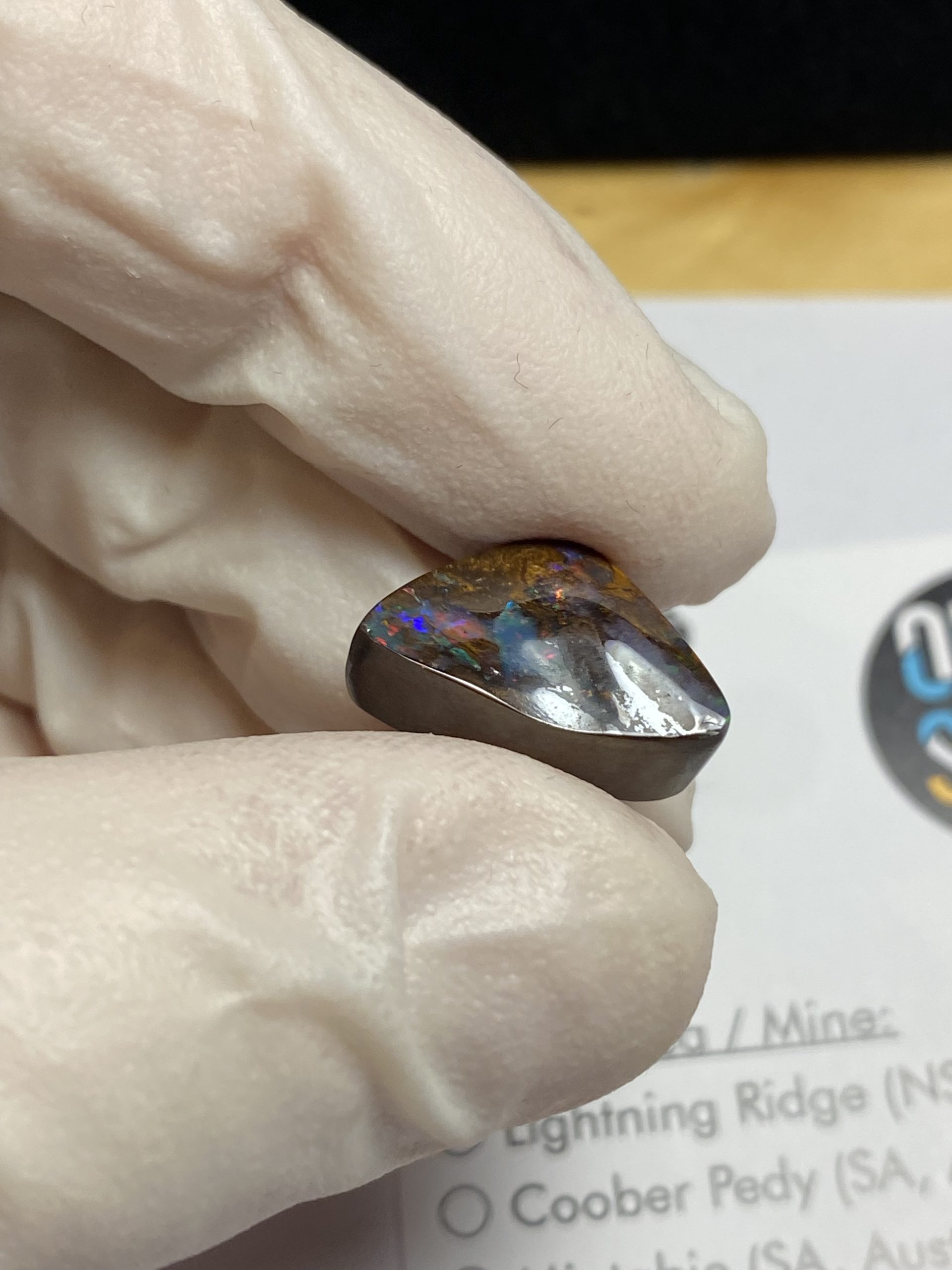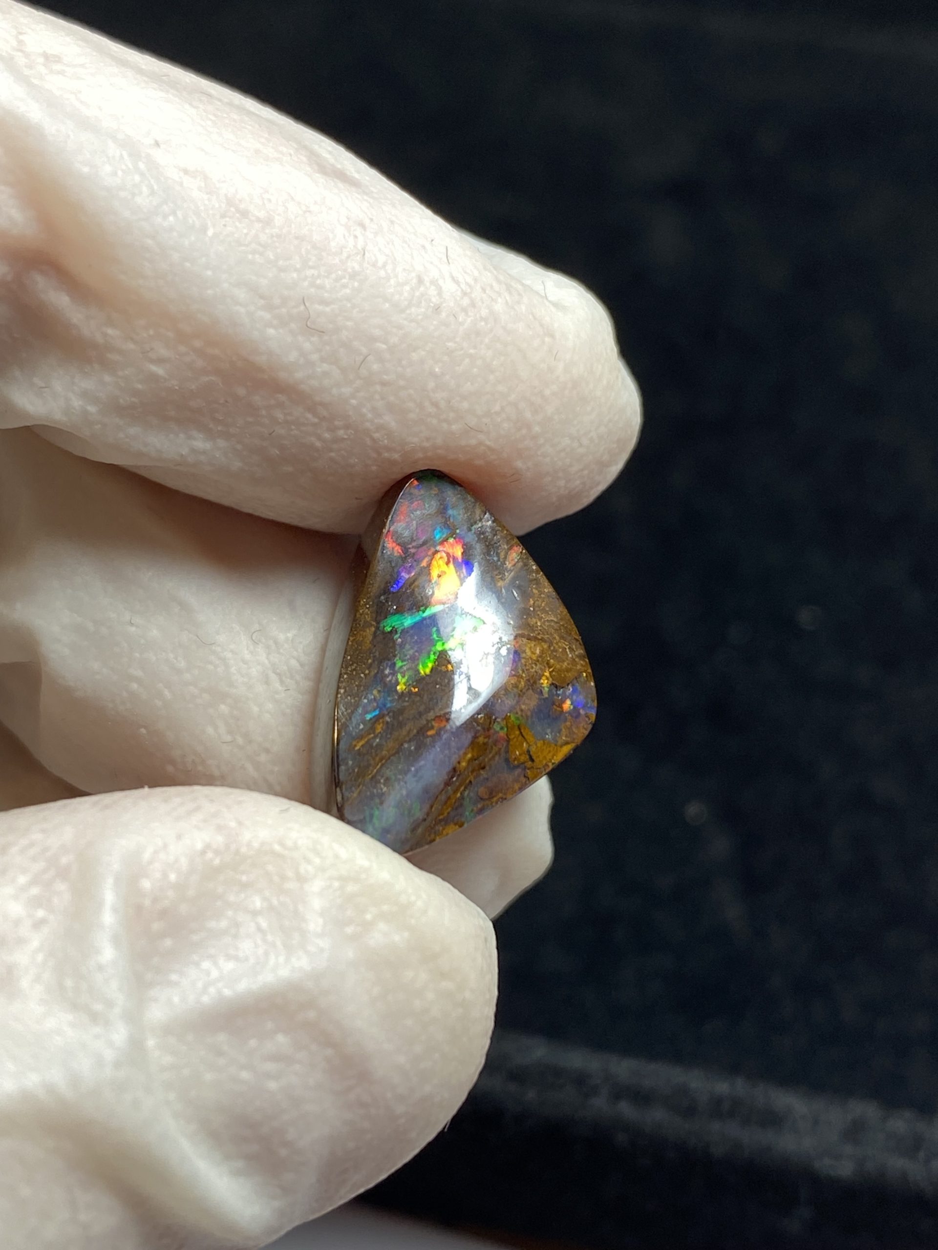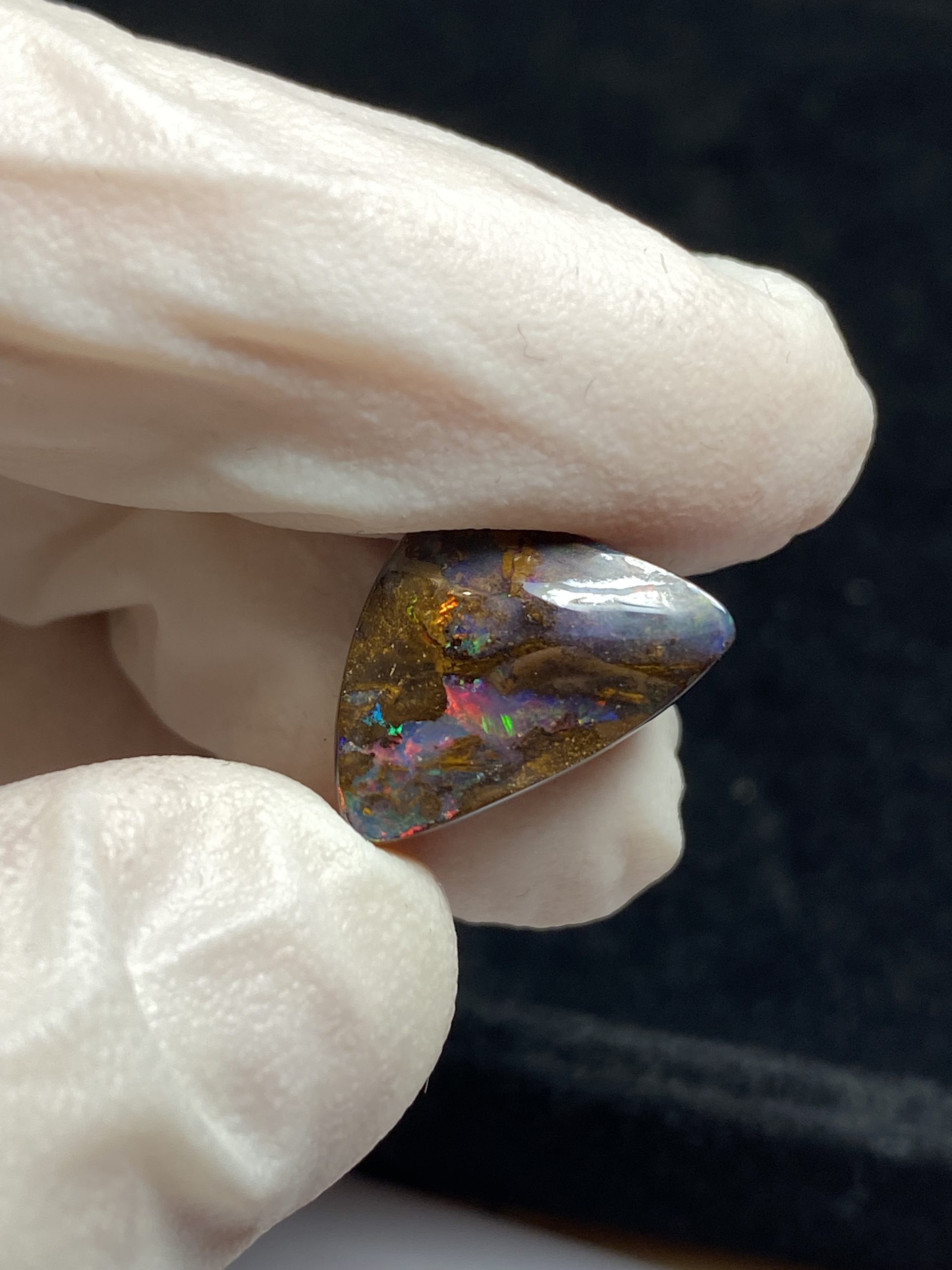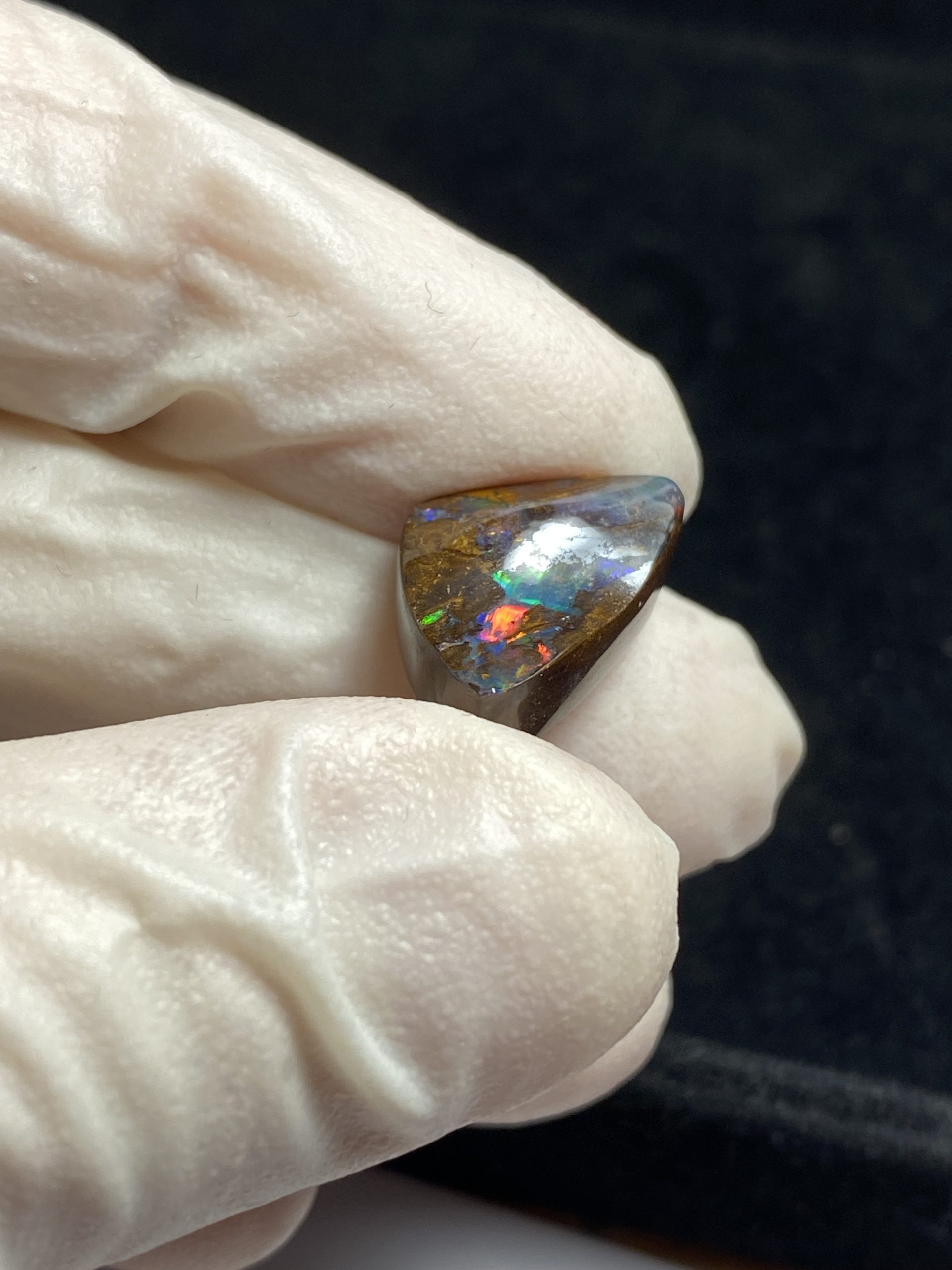 ECLAIRAGE ET COULEURS: Toutes les photos et vidéos ont été prises avec éclairage direct (sous lampe de bureau avec ampoule LED couleur « blanche froide »). Les feux de l’opale seront moins forts sans exposition au soleil ou éclairage direct. Les couleurs de l’opale varient également selon le type d’éclairage et le fond/arrière-plan. En général, le bleu sur les photos/vidéos, est plus proche du violet en réalité sous la plupart des d’éclairages.