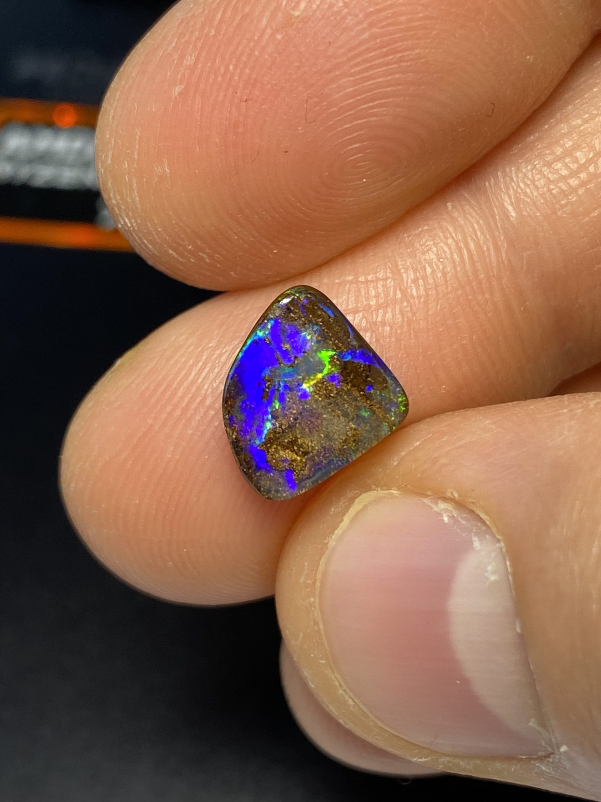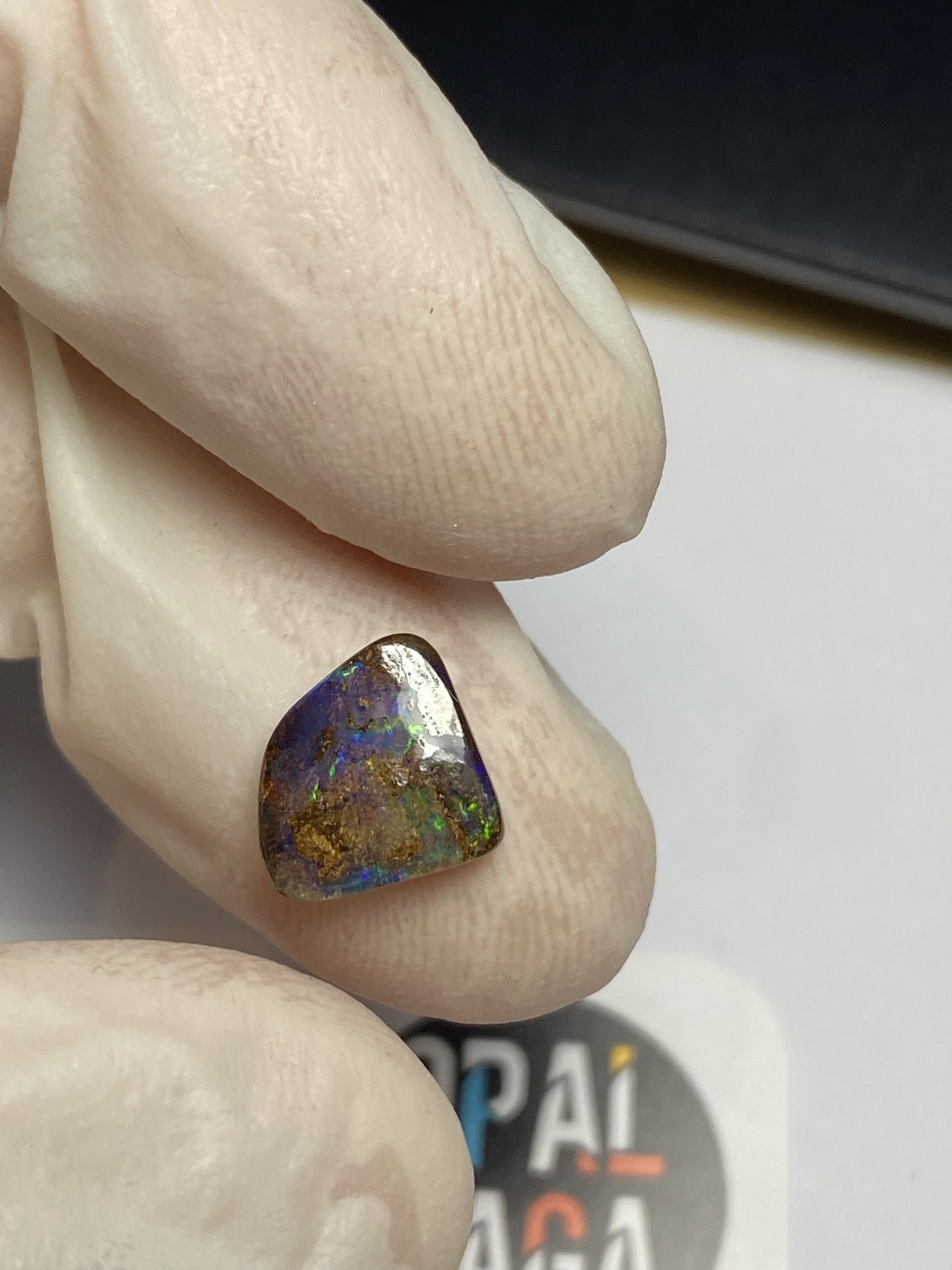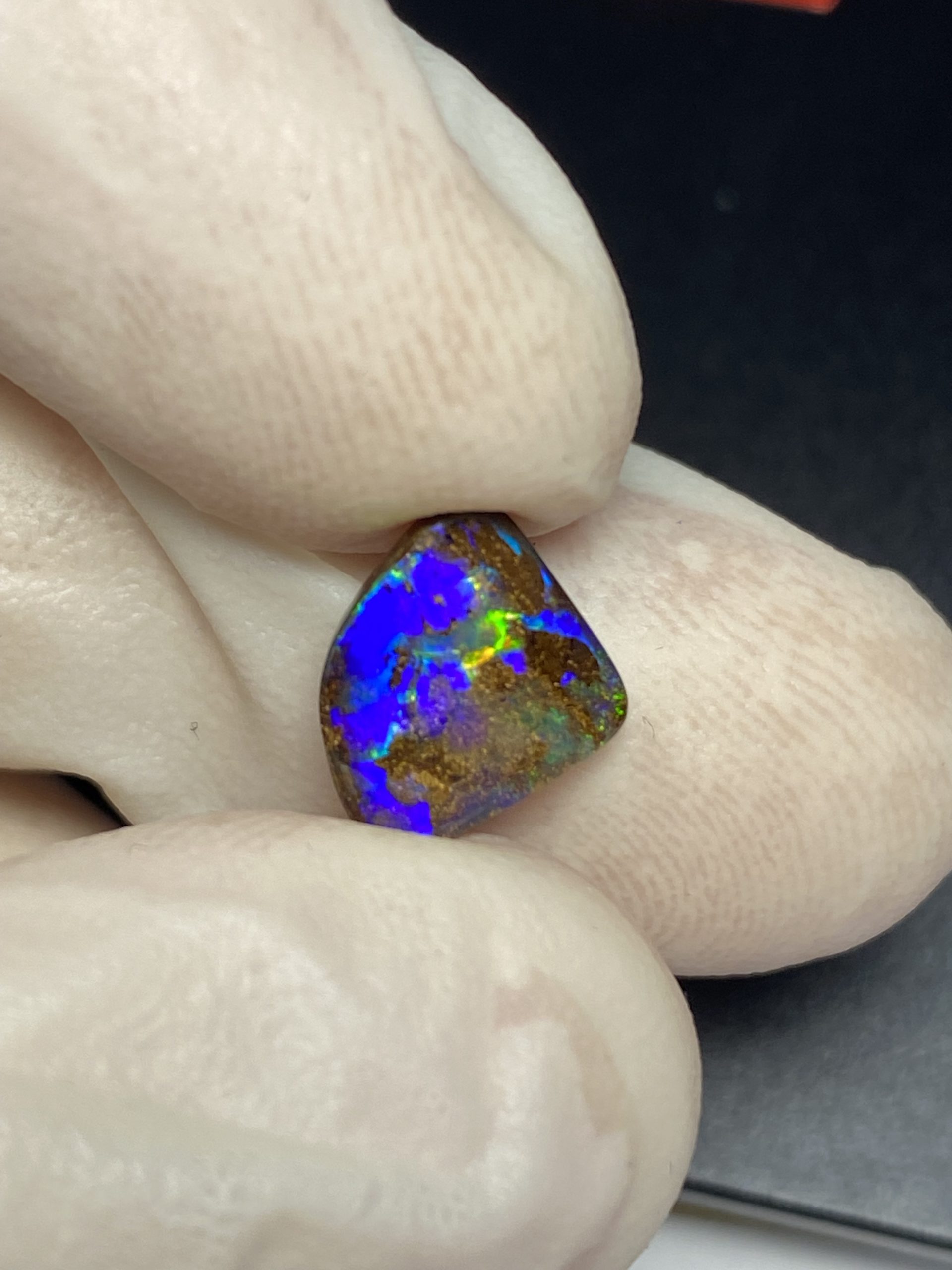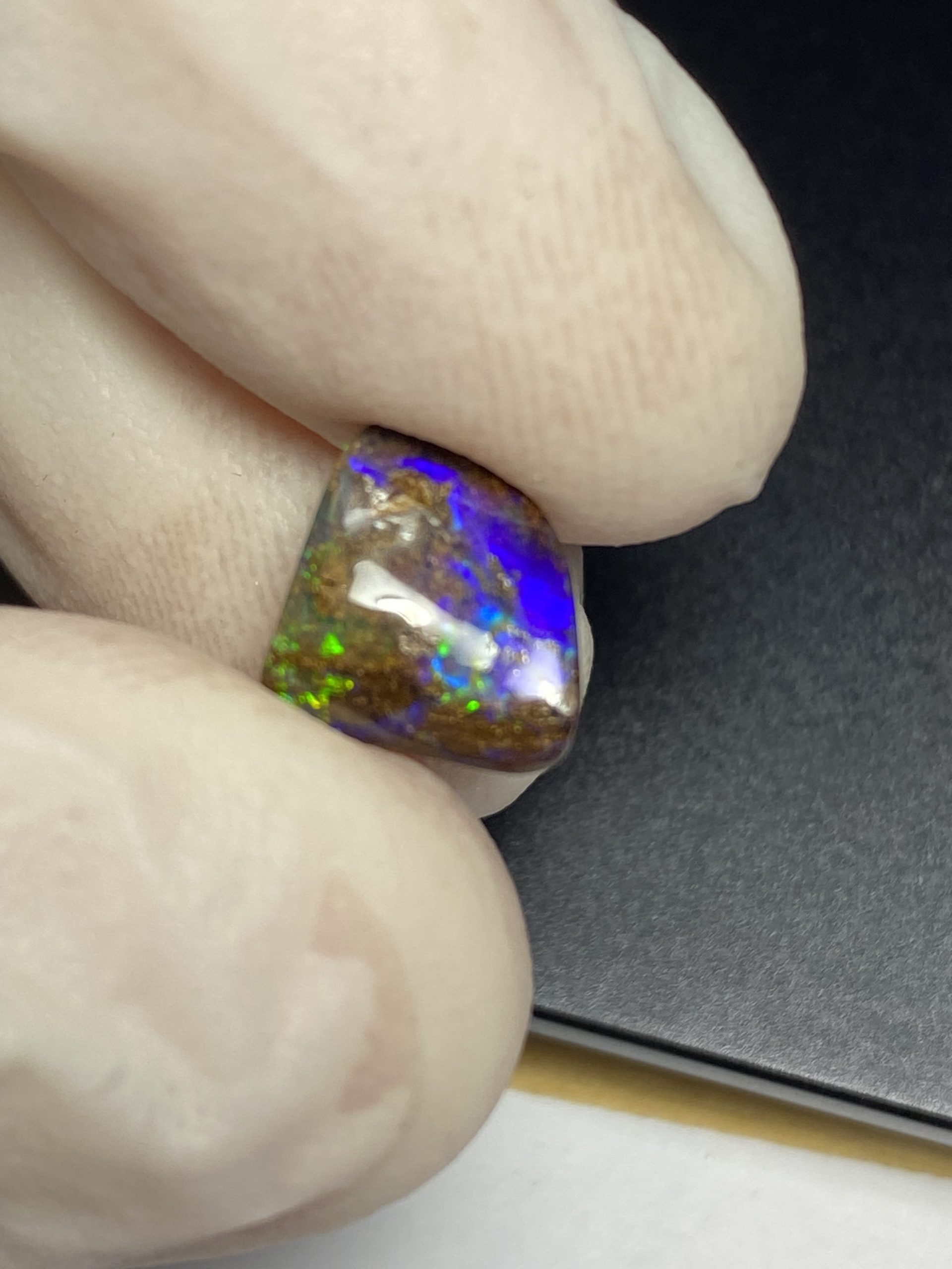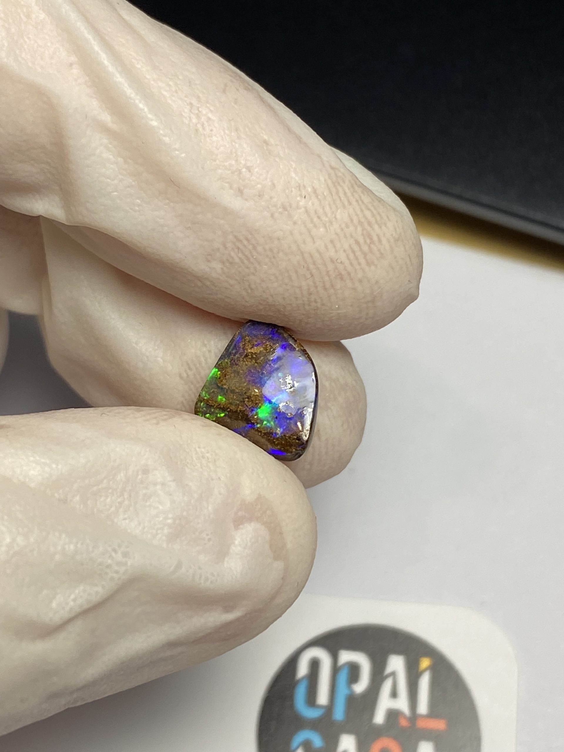 ECLAIRAGE ET COULEURS: Toutes les photos et vidéos ont été prises avec éclairage direct (sous lampe de bureau avec ampoule LED couleur « blanche froide »). Les feux de l’opale seront moins forts sans exposition au soleil ou éclairage direct. Les couleurs de l’opale varient également selon le type d’éclairage et le fond/arrière-plan. En général, le bleu sur les photos/vidéos, est plus proche du violet en réalité sous la plupart des d’éclairages.