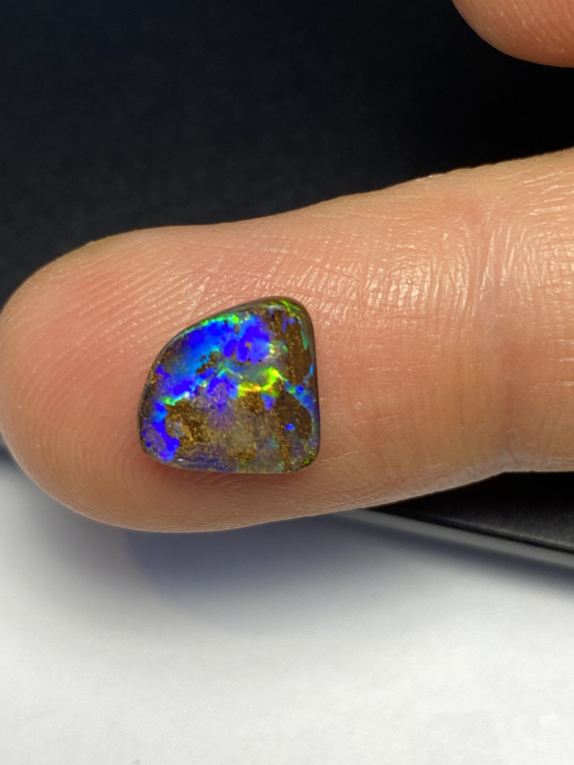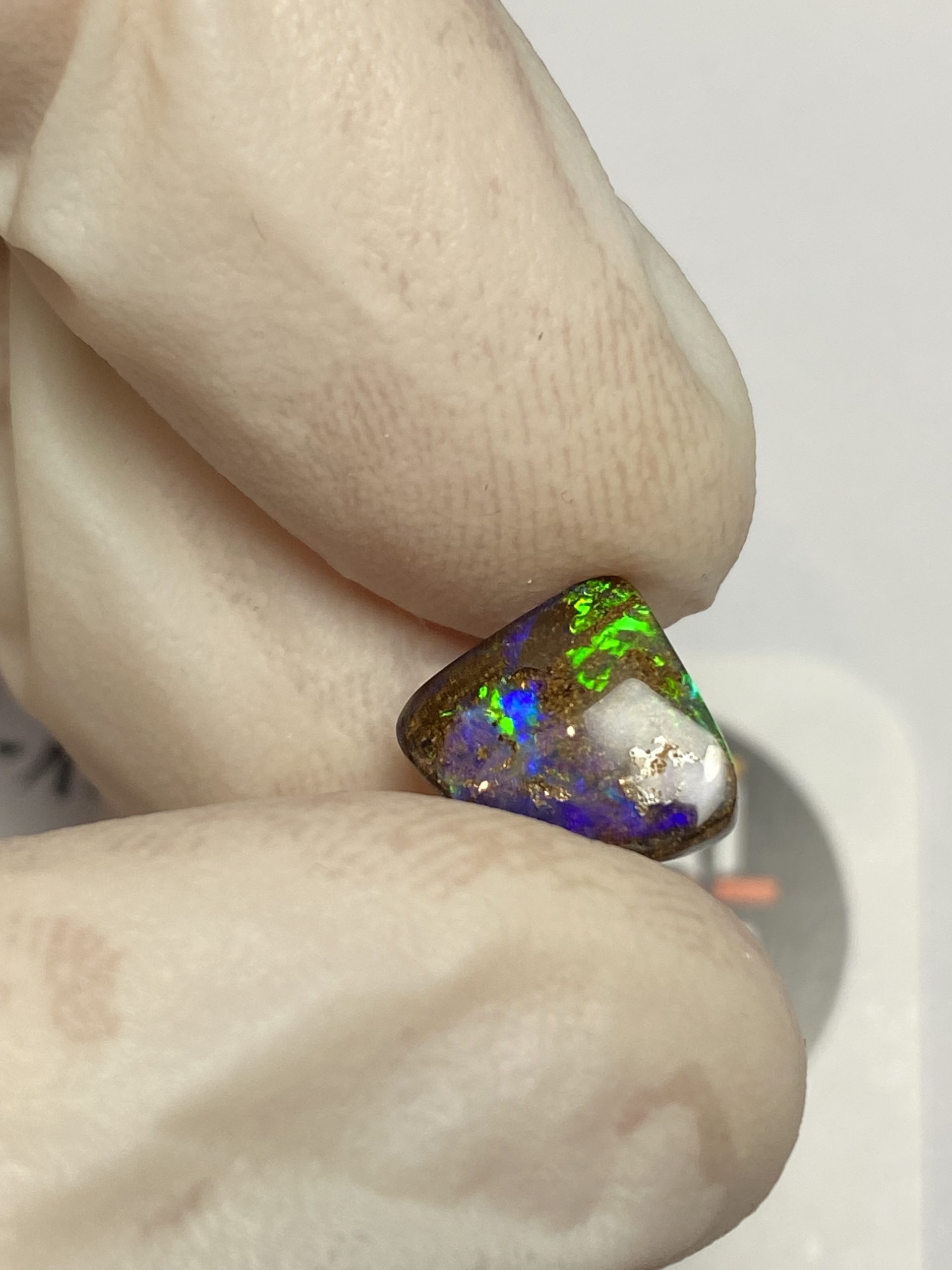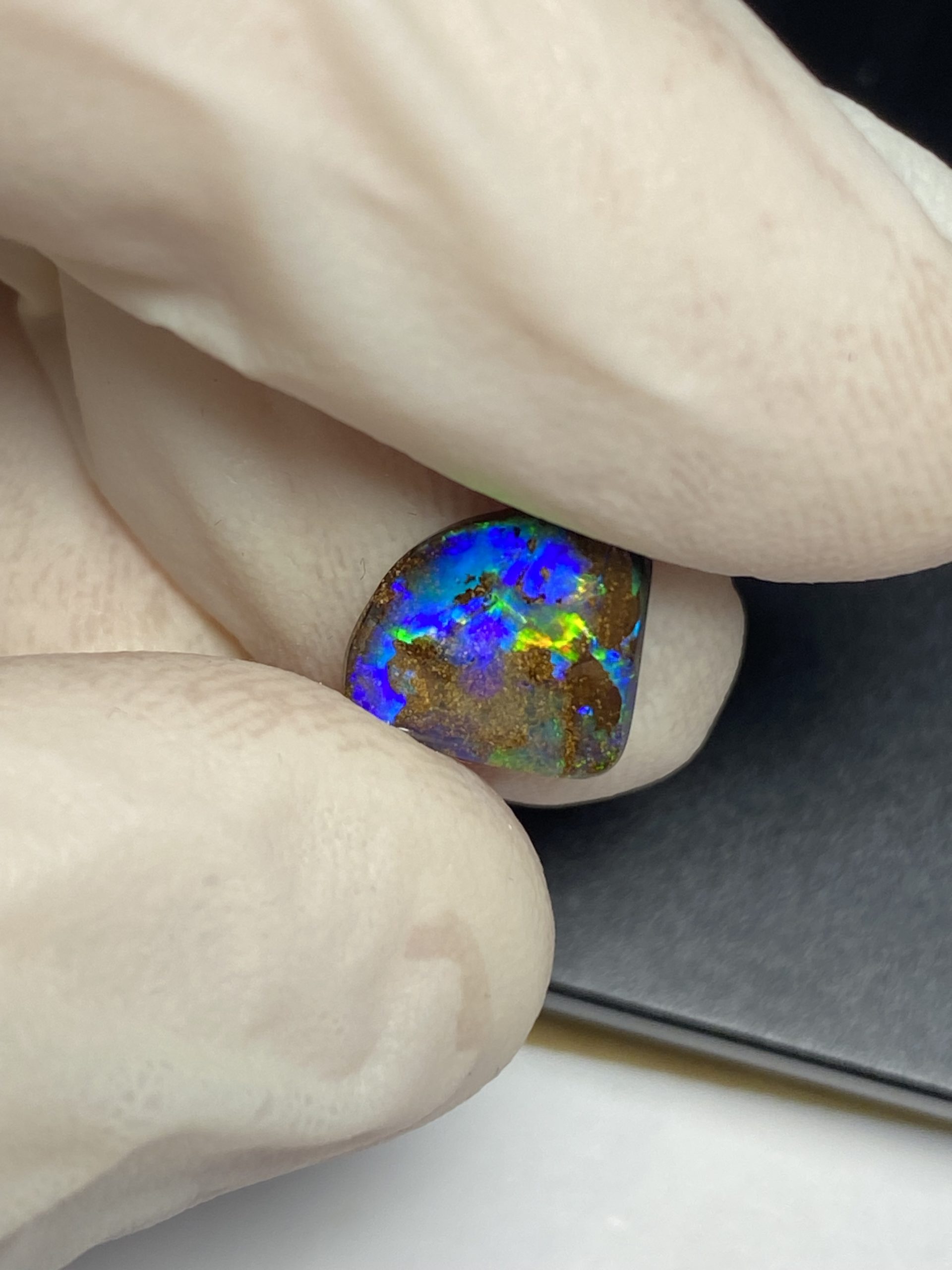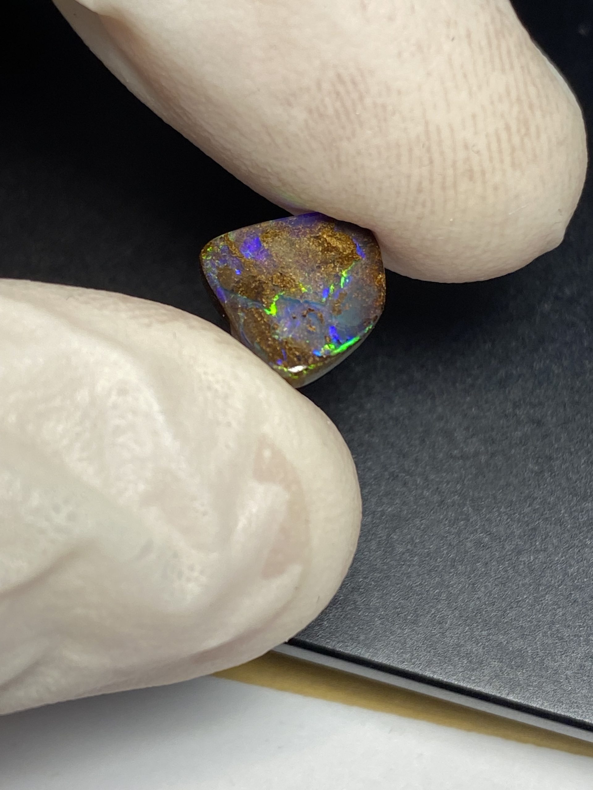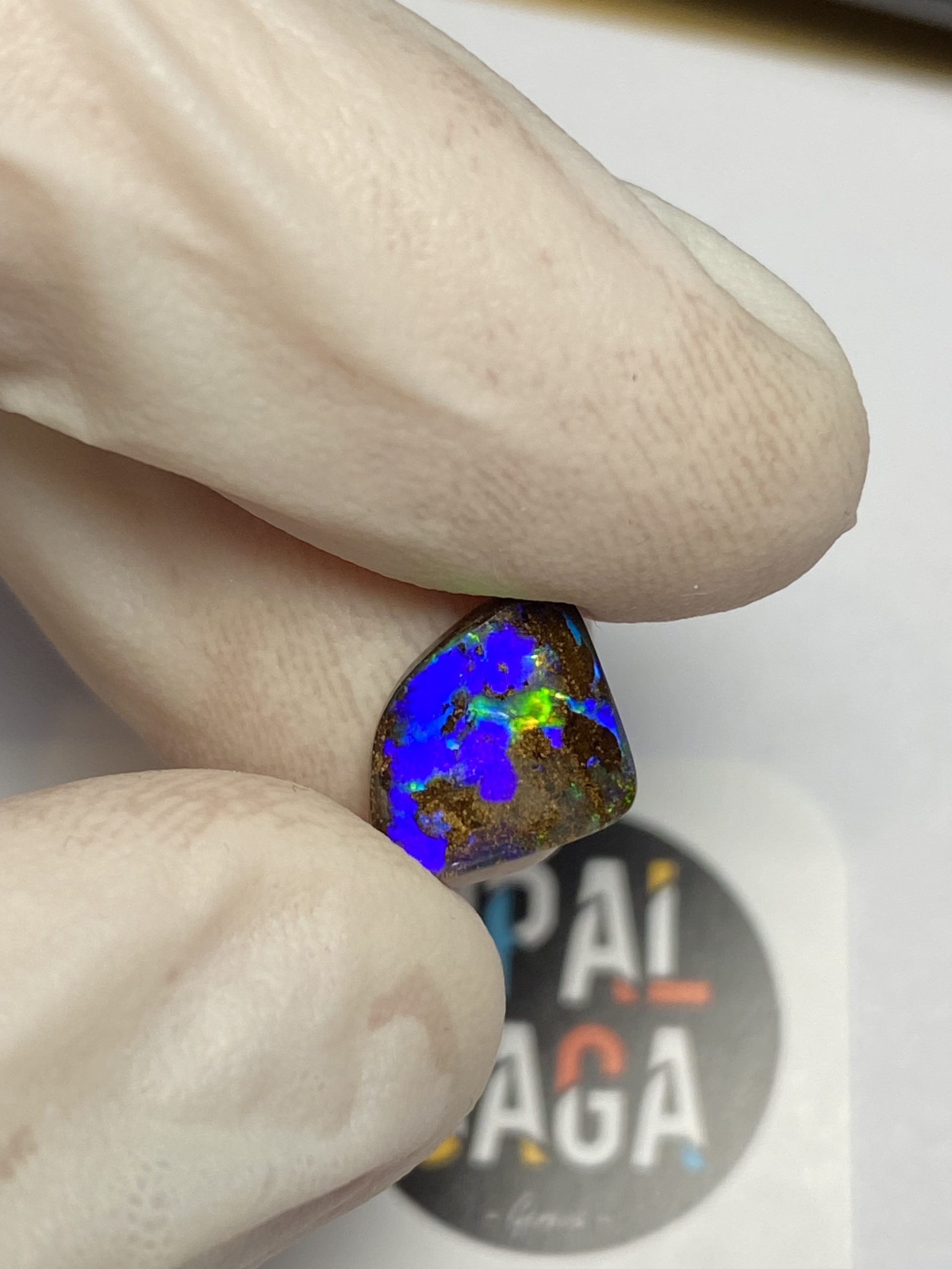 ECLAIRAGE ET COULEURS: Toutes les photos et vidéos ont été prises avec éclairage direct (sous lampe de bureau avec ampoule LED couleur « blanche froide »). Les feux de l’opale seront moins forts sans exposition au soleil ou éclairage direct. Les couleurs de l’opale varient également selon le type d’éclairage et le fond/arrière-plan. En général, le bleu sur les photos/vidéos, est plus proche du violet en réalité sous la plupart des d’éclairages.