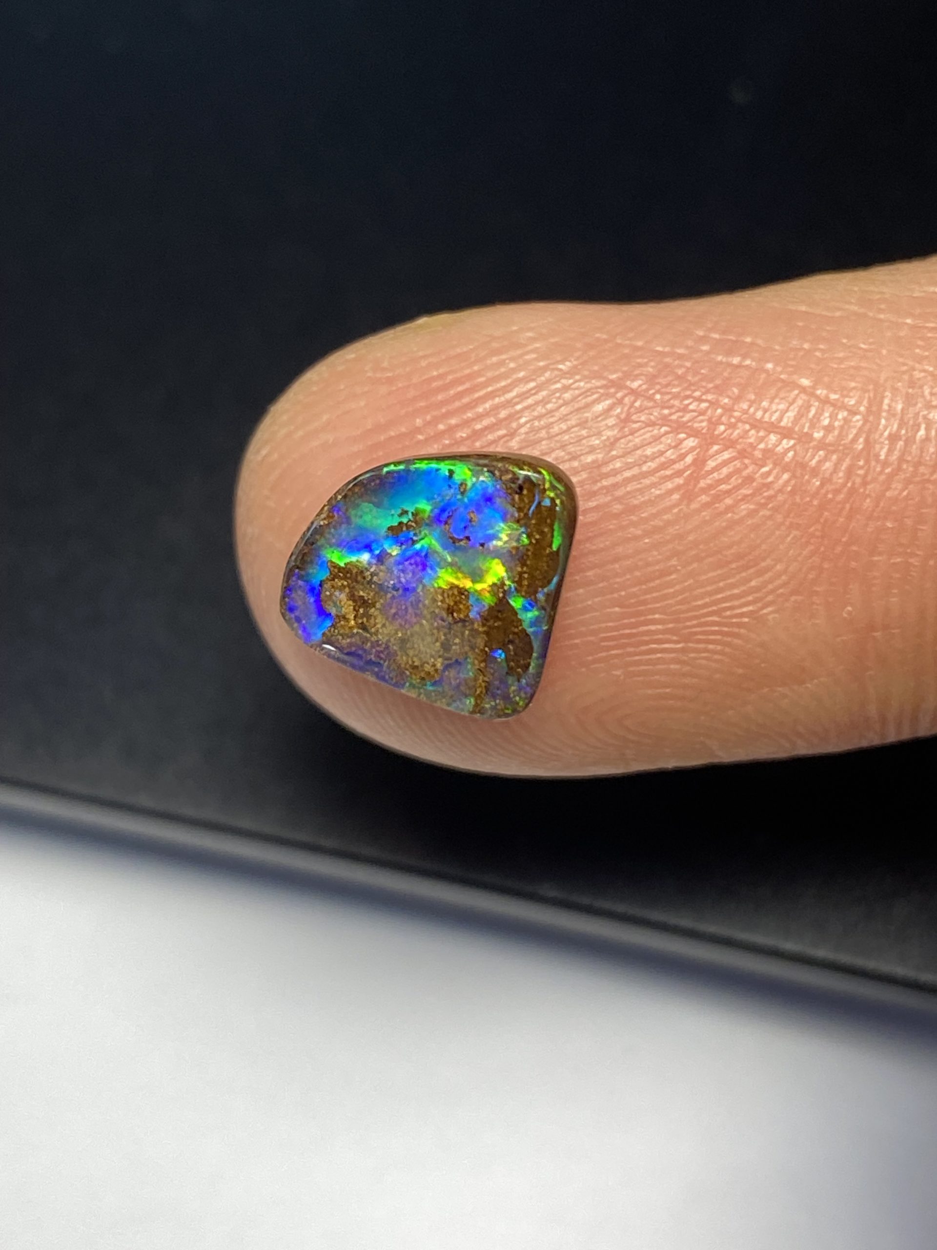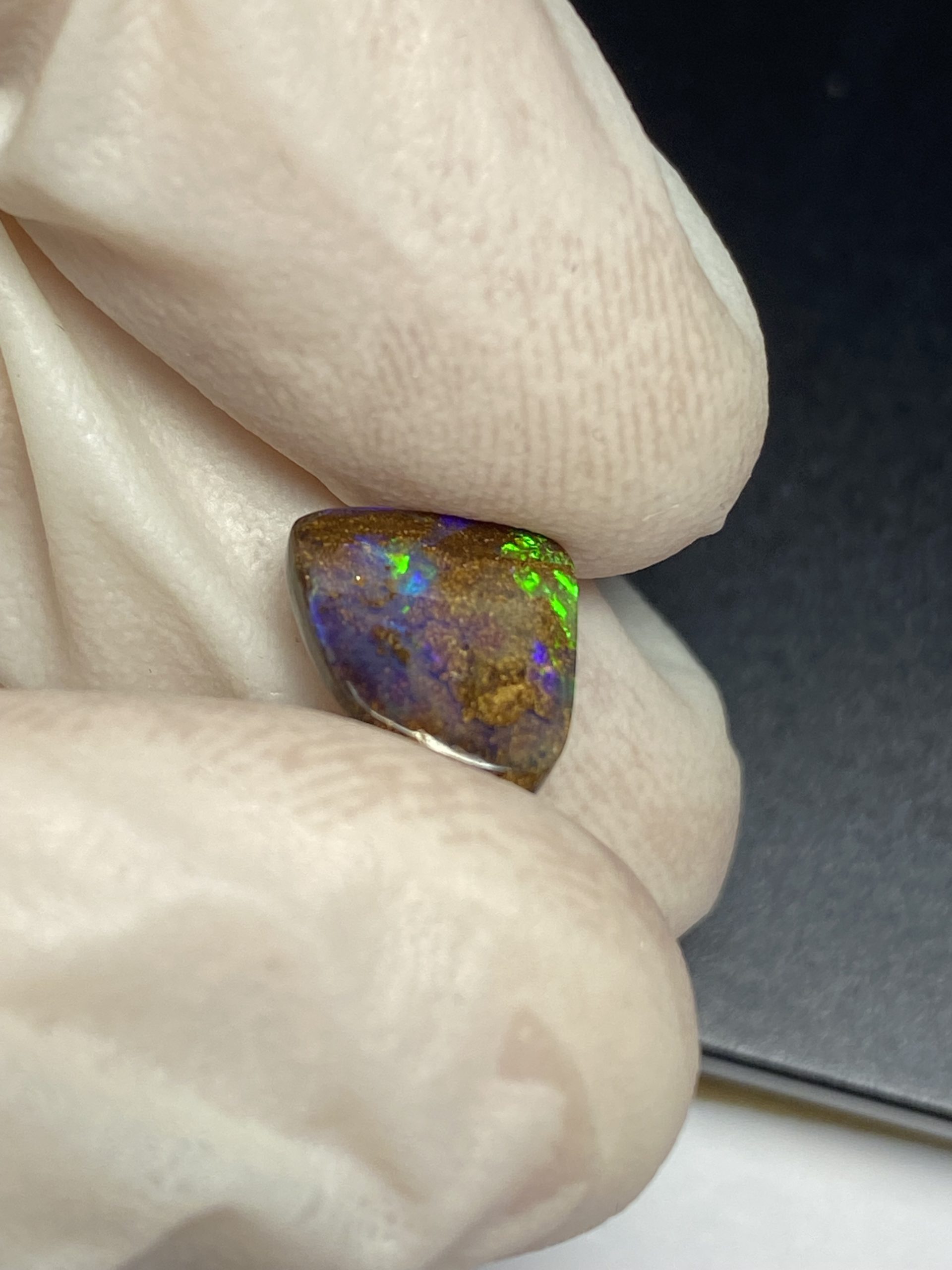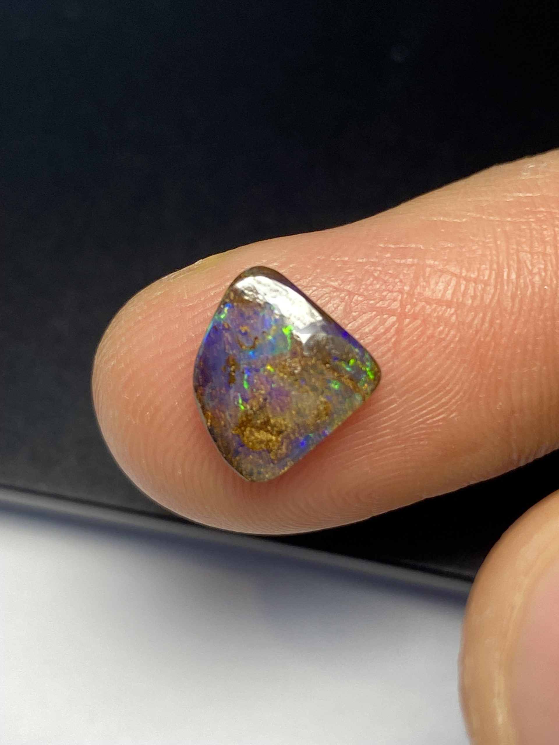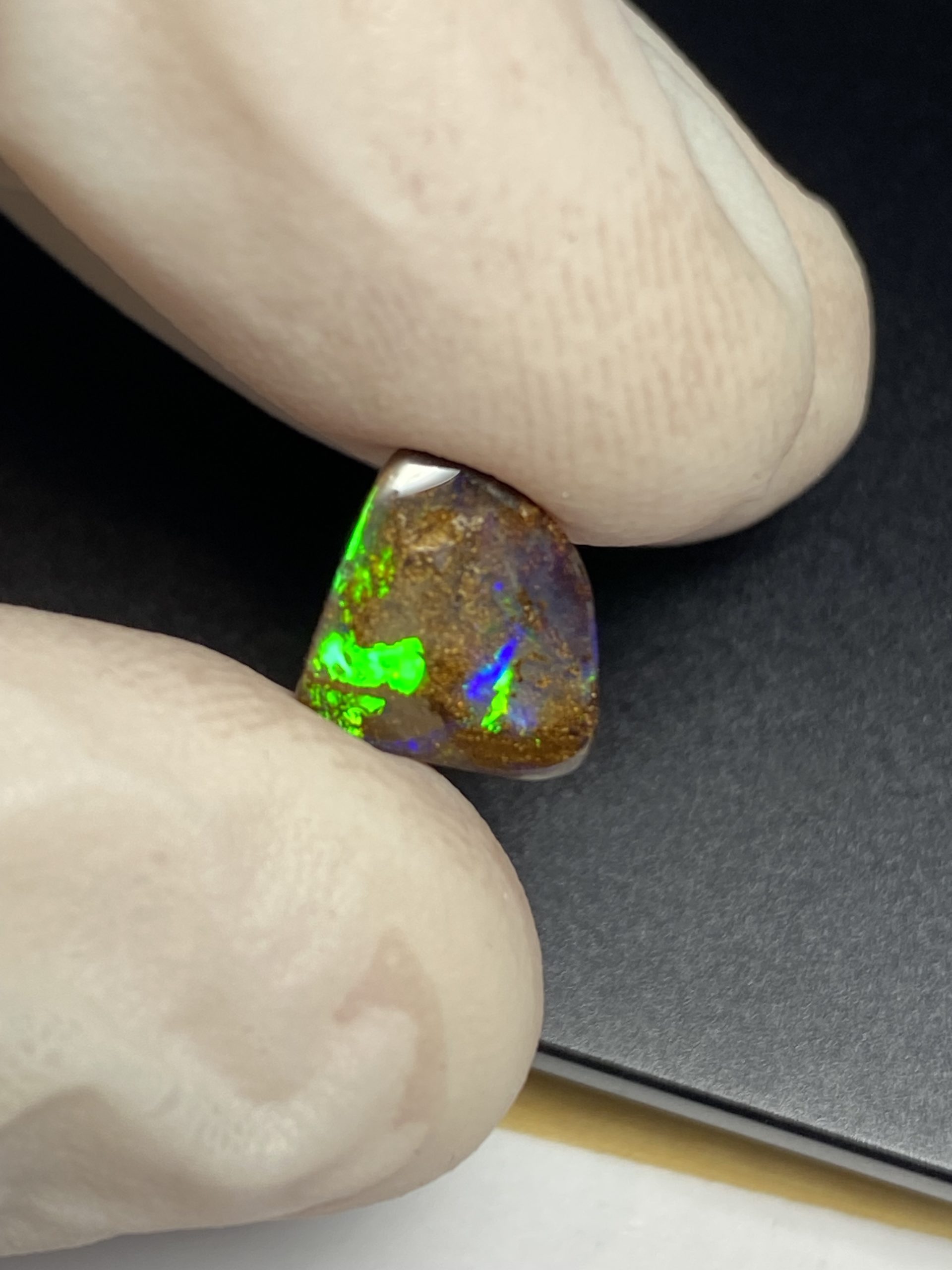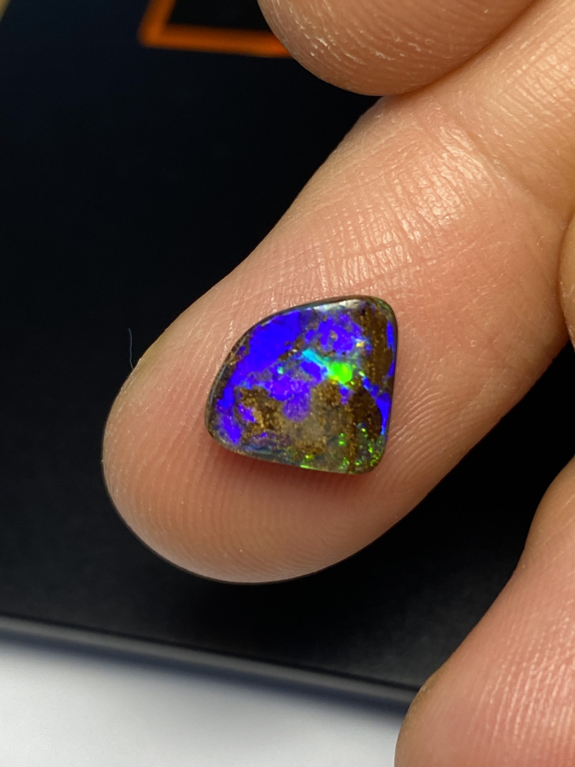 ECLAIRAGE ET COULEURS: Toutes les photos et vidéos ont été prises avec éclairage direct (sous lampe de bureau avec ampoule LED couleur « blanche froide »). Les feux de l’opale seront moins forts sans exposition au soleil ou éclairage direct. Les couleurs de l’opale varient également selon le type d’éclairage et le fond/arrière-plan. En général, le bleu sur les photos/vidéos, est plus proche du violet en réalité sous la plupart des d’éclairages.