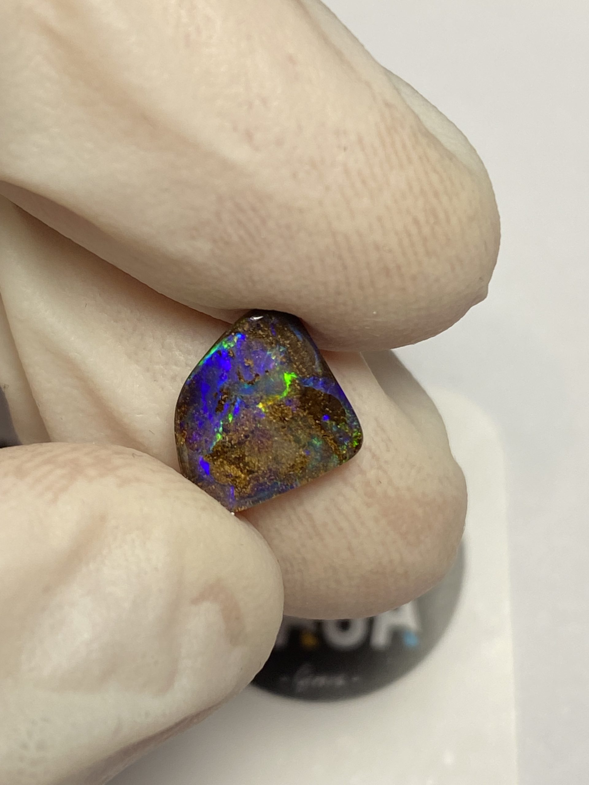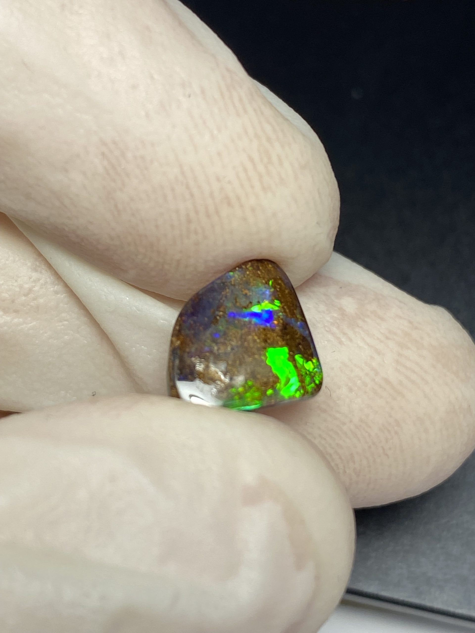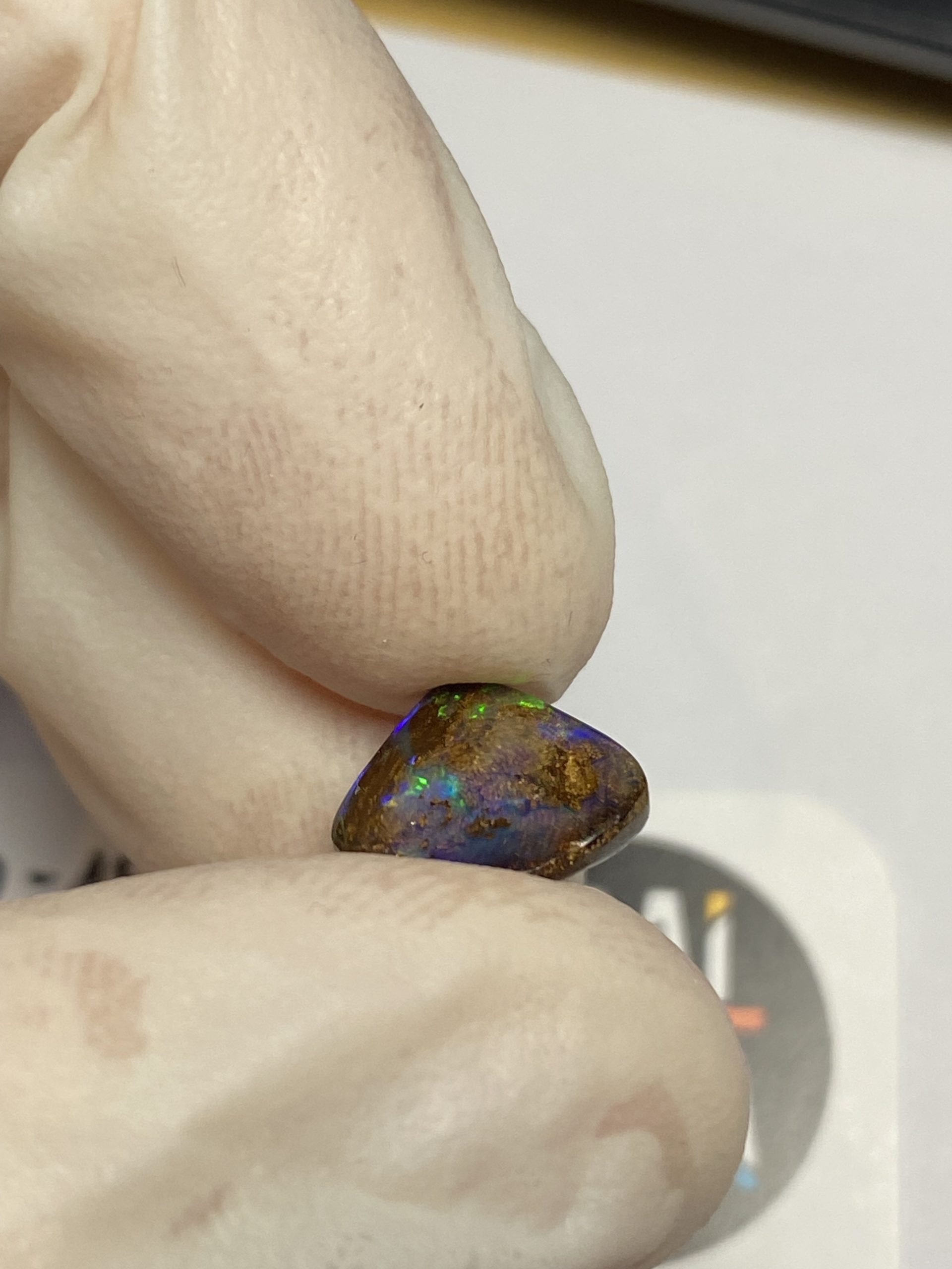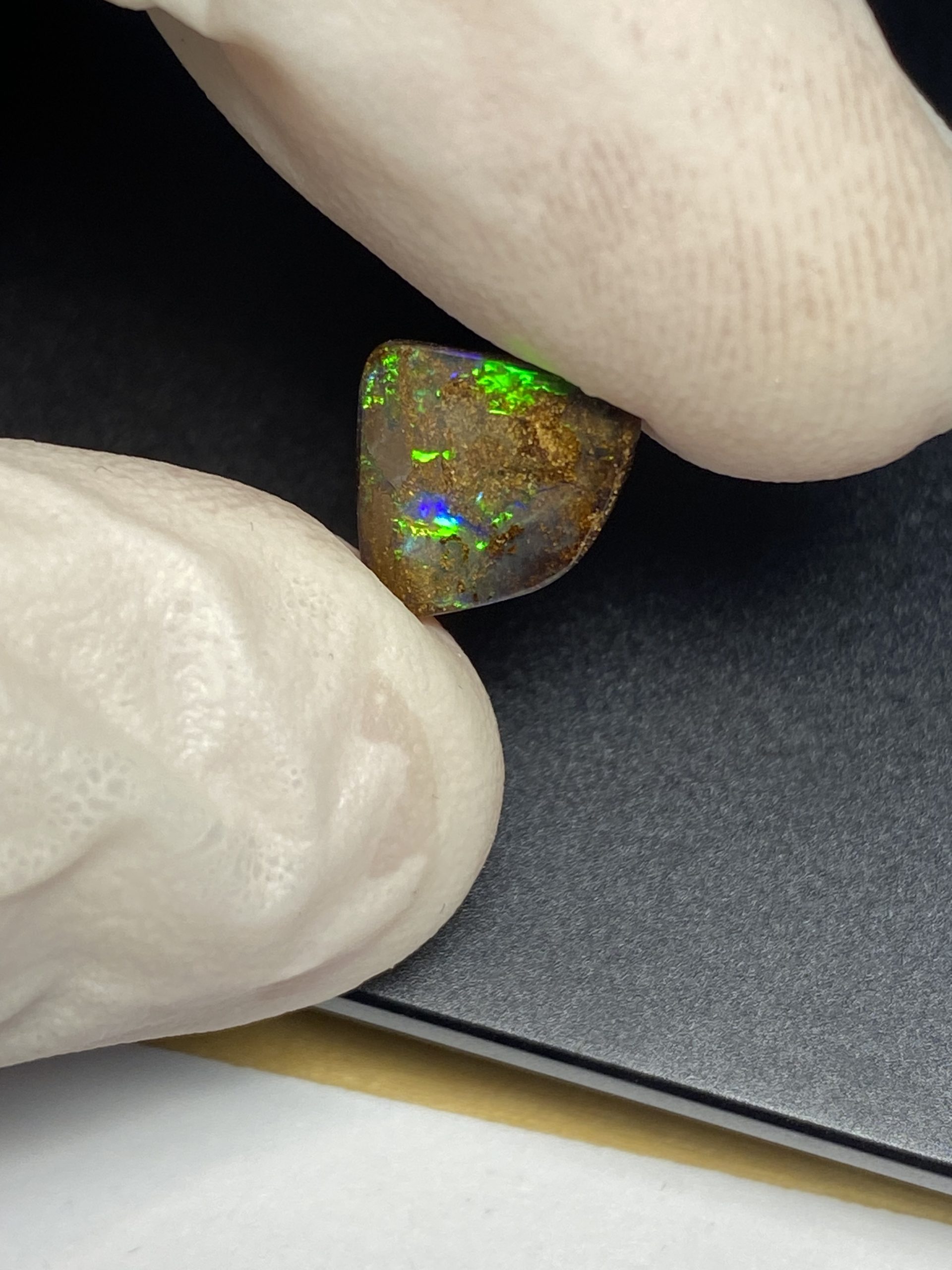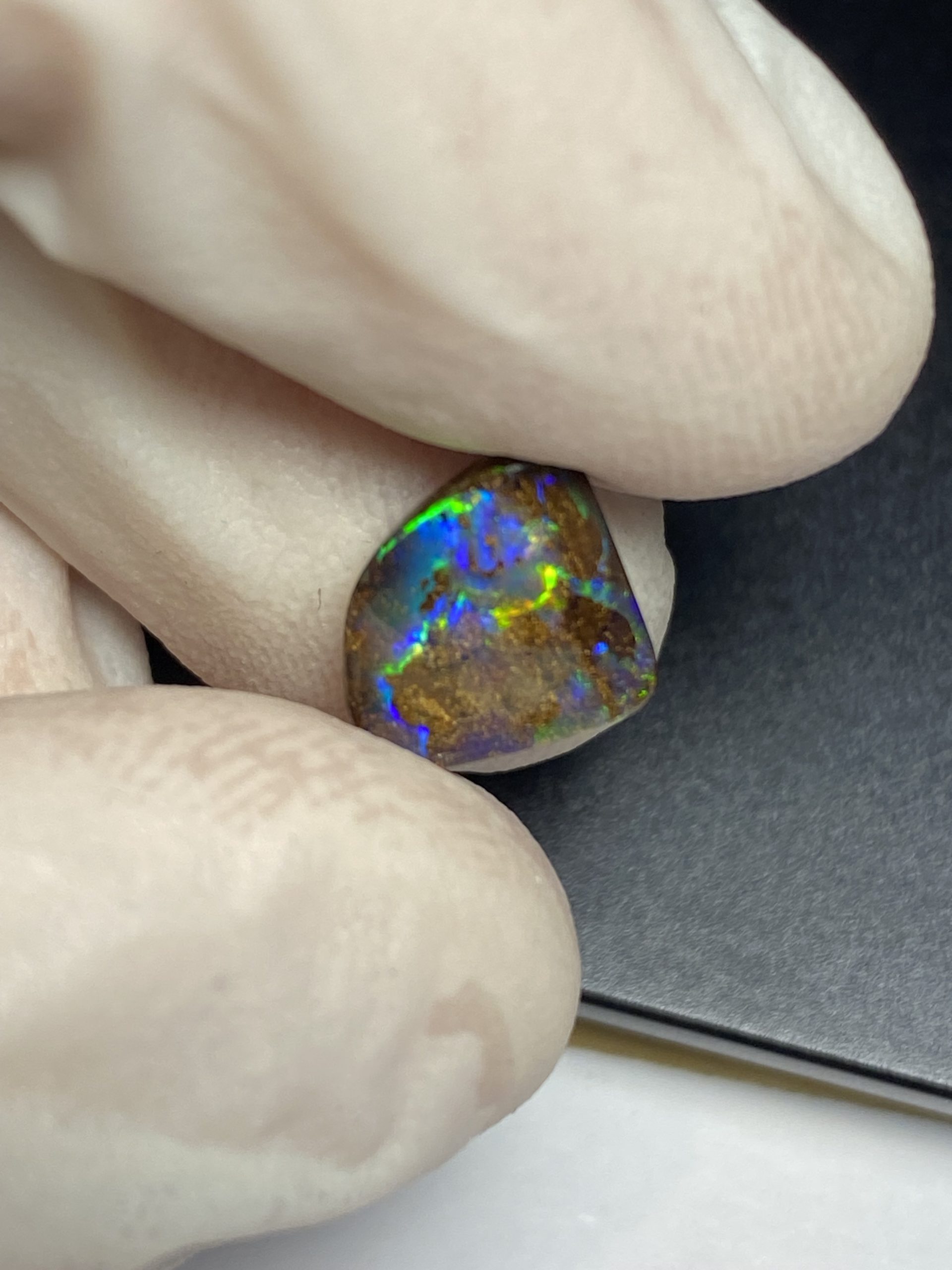 ECLAIRAGE ET COULEURS: Toutes les photos et vidéos ont été prises avec éclairage direct (sous lampe de bureau avec ampoule LED couleur « blanche froide »). Les feux de l’opale seront moins forts sans exposition au soleil ou éclairage direct. Les couleurs de l’opale varient également selon le type d’éclairage et le fond/arrière-plan. En général, le bleu sur les photos/vidéos, est plus proche du violet en réalité sous la plupart des d’éclairages.