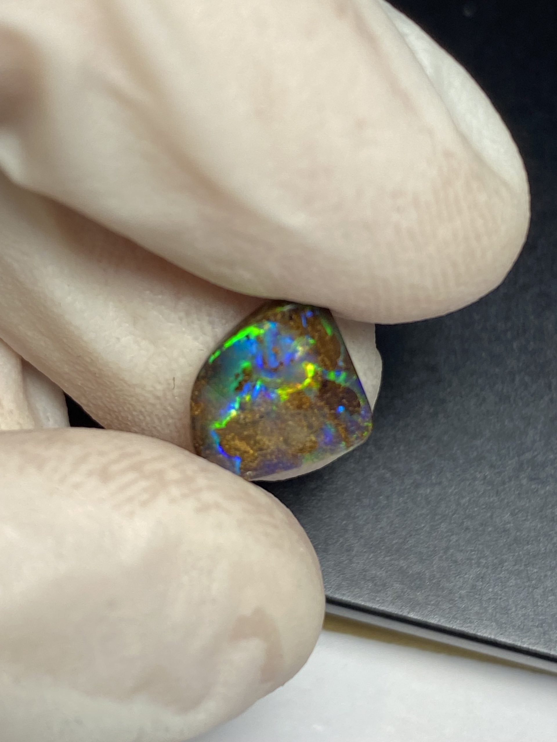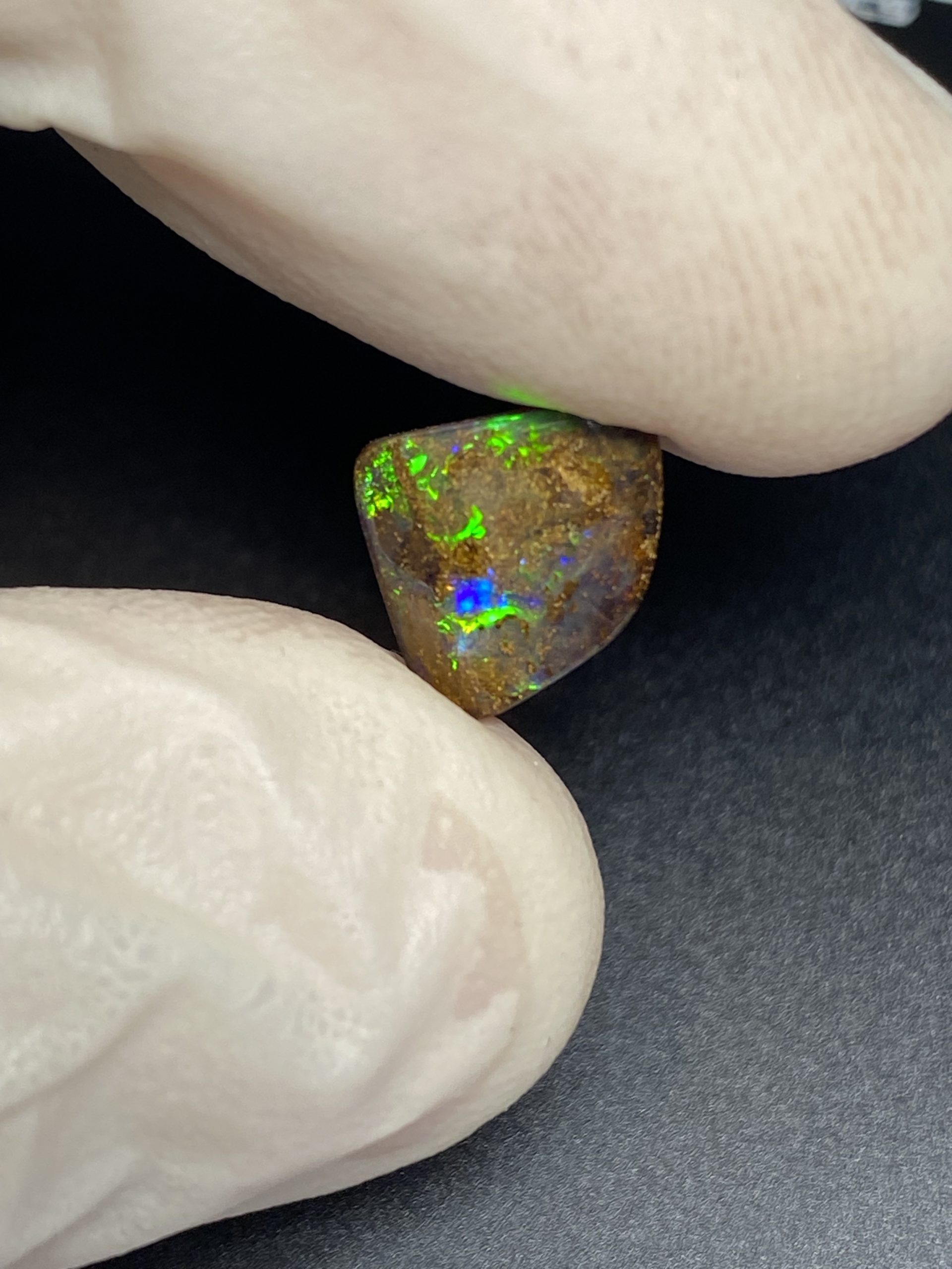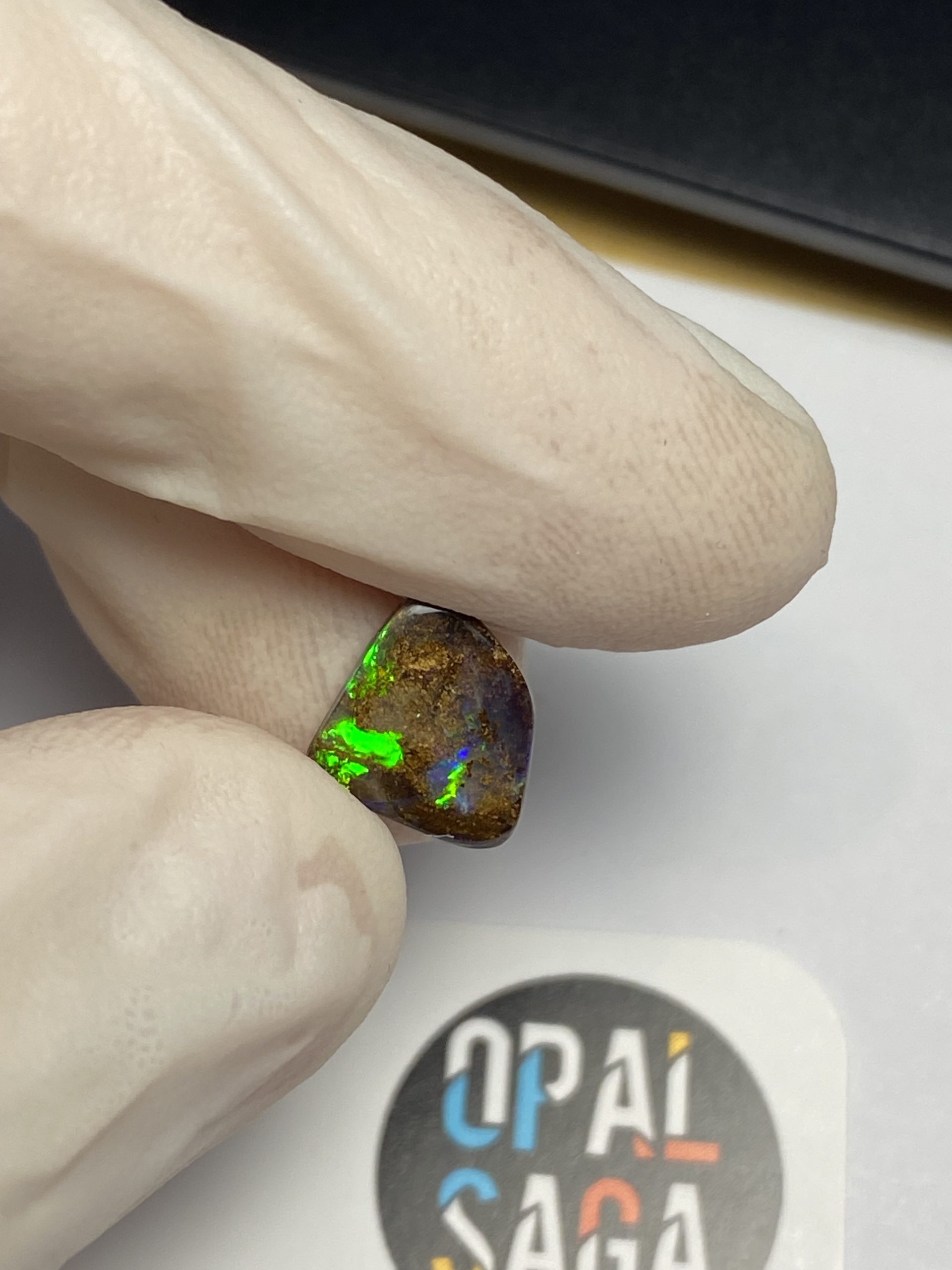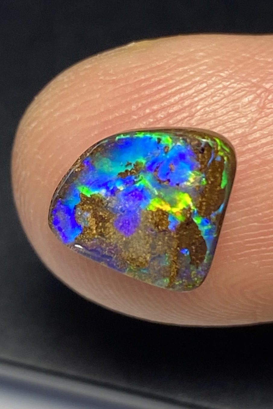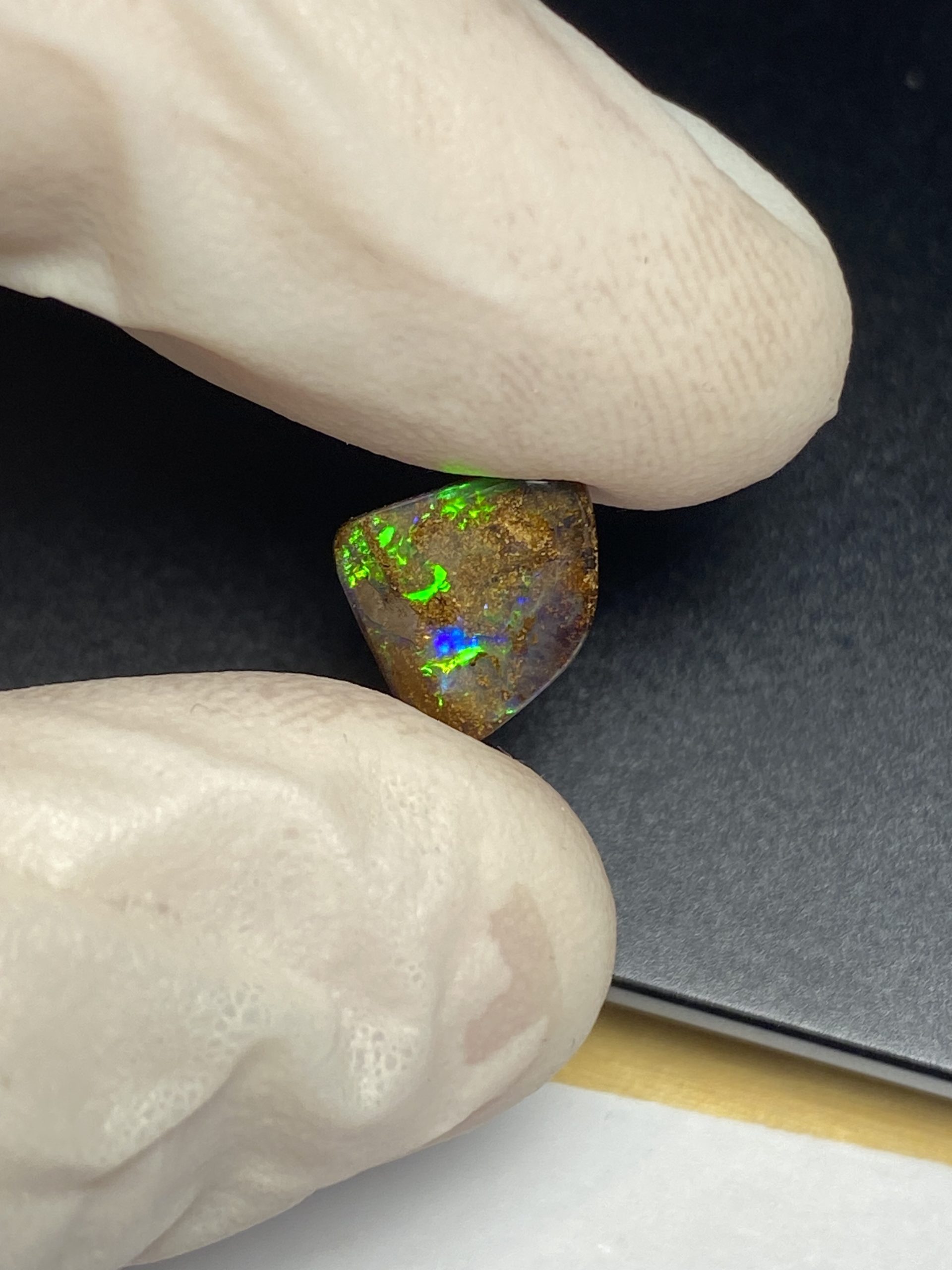 ECLAIRAGE ET COULEURS: Toutes les photos et vidéos ont été prises avec éclairage direct (sous lampe de bureau avec ampoule LED couleur « blanche froide »). Les feux de l’opale seront moins forts sans exposition au soleil ou éclairage direct. Les couleurs de l’opale varient également selon le type d’éclairage et le fond/arrière-plan. En général, le bleu sur les photos/vidéos, est plus proche du violet en réalité sous la plupart des d’éclairages.