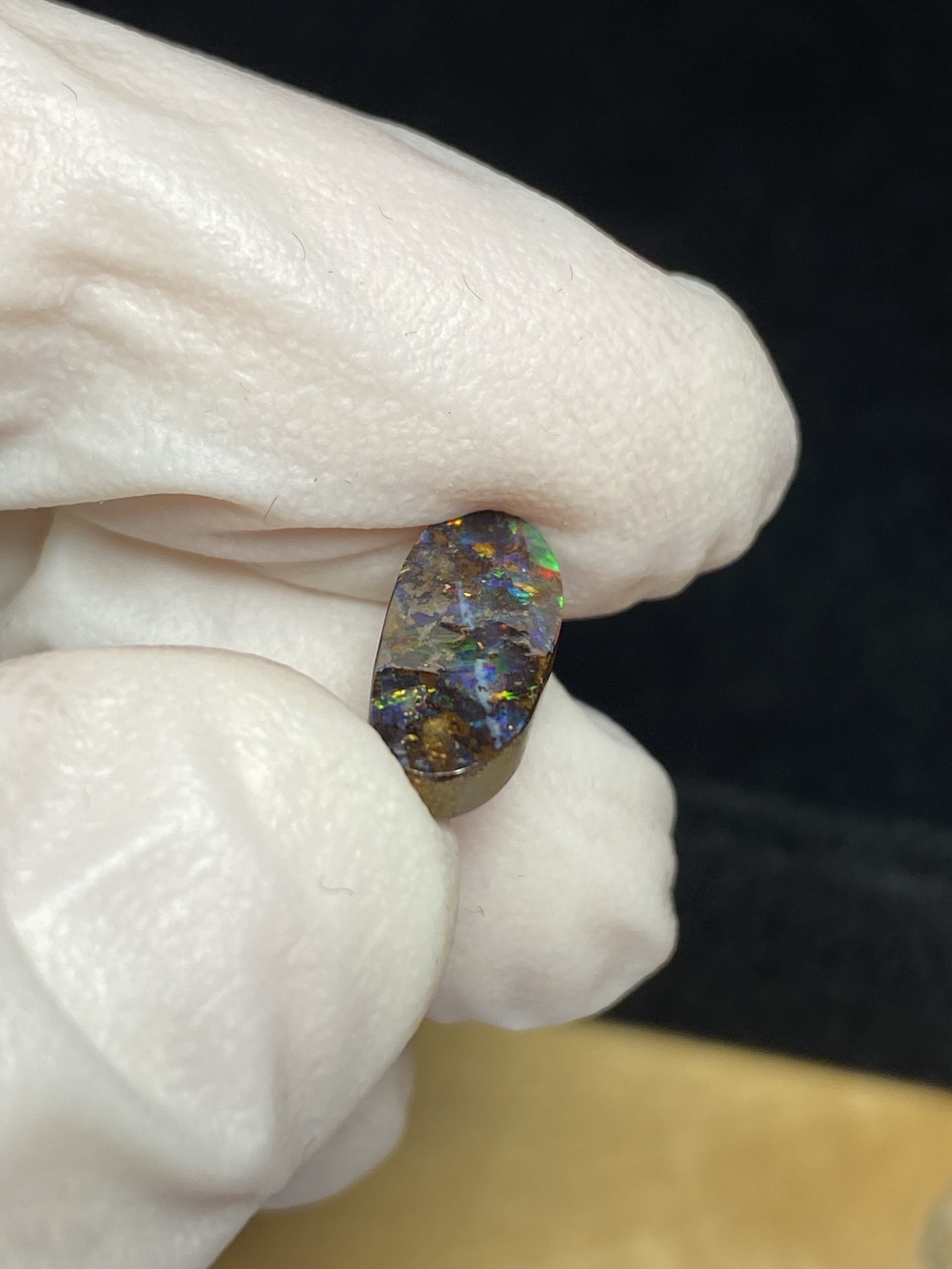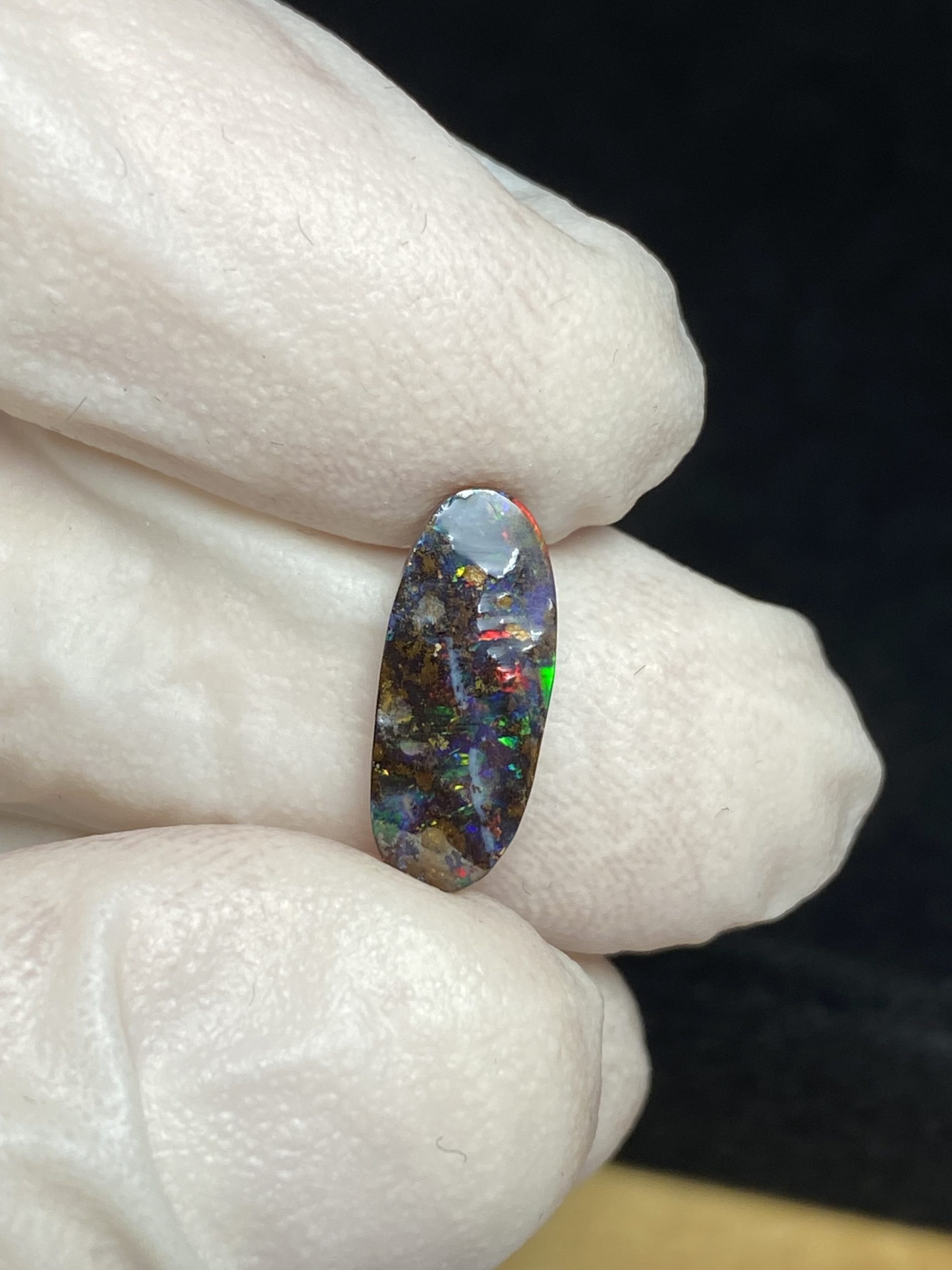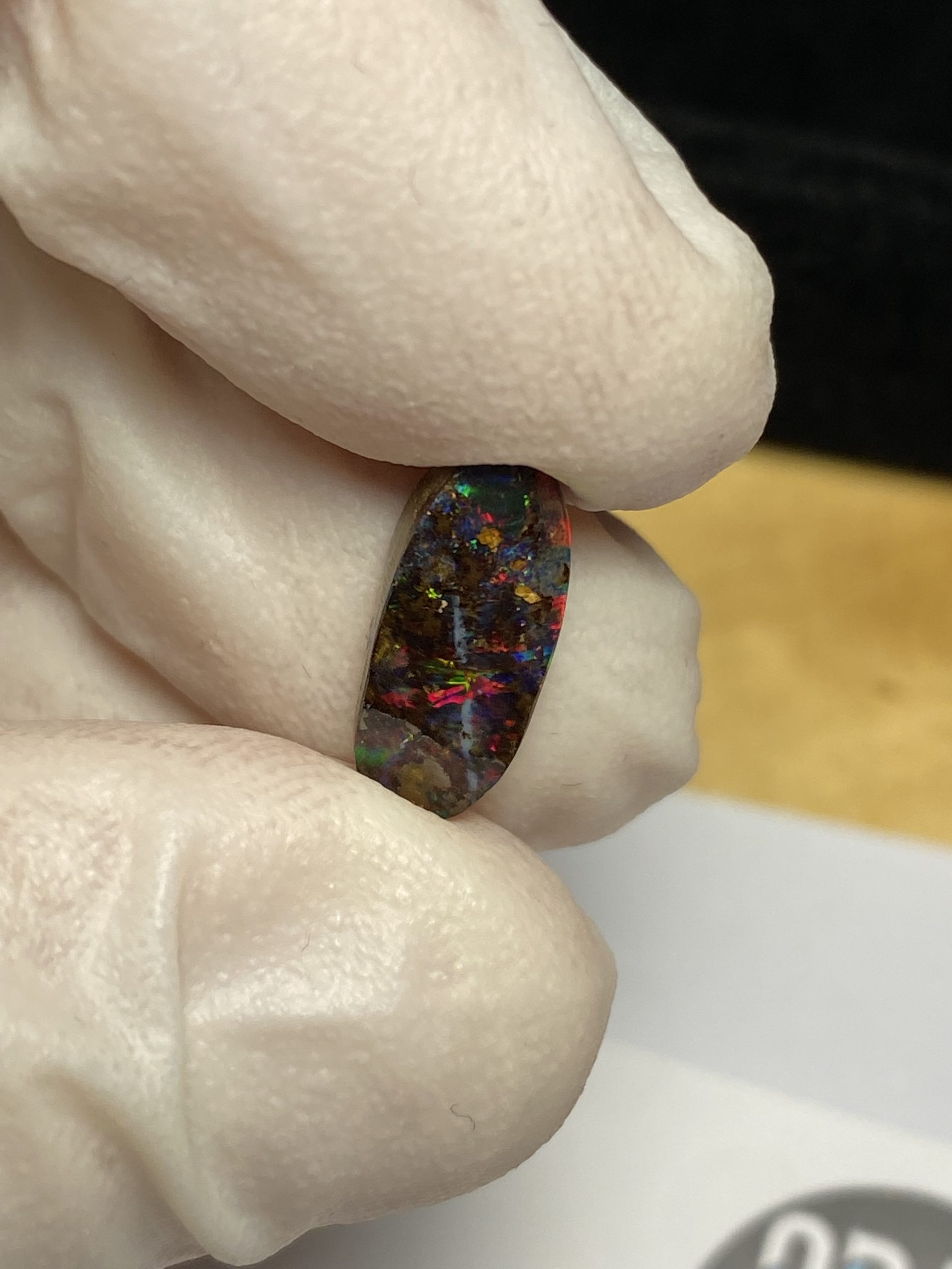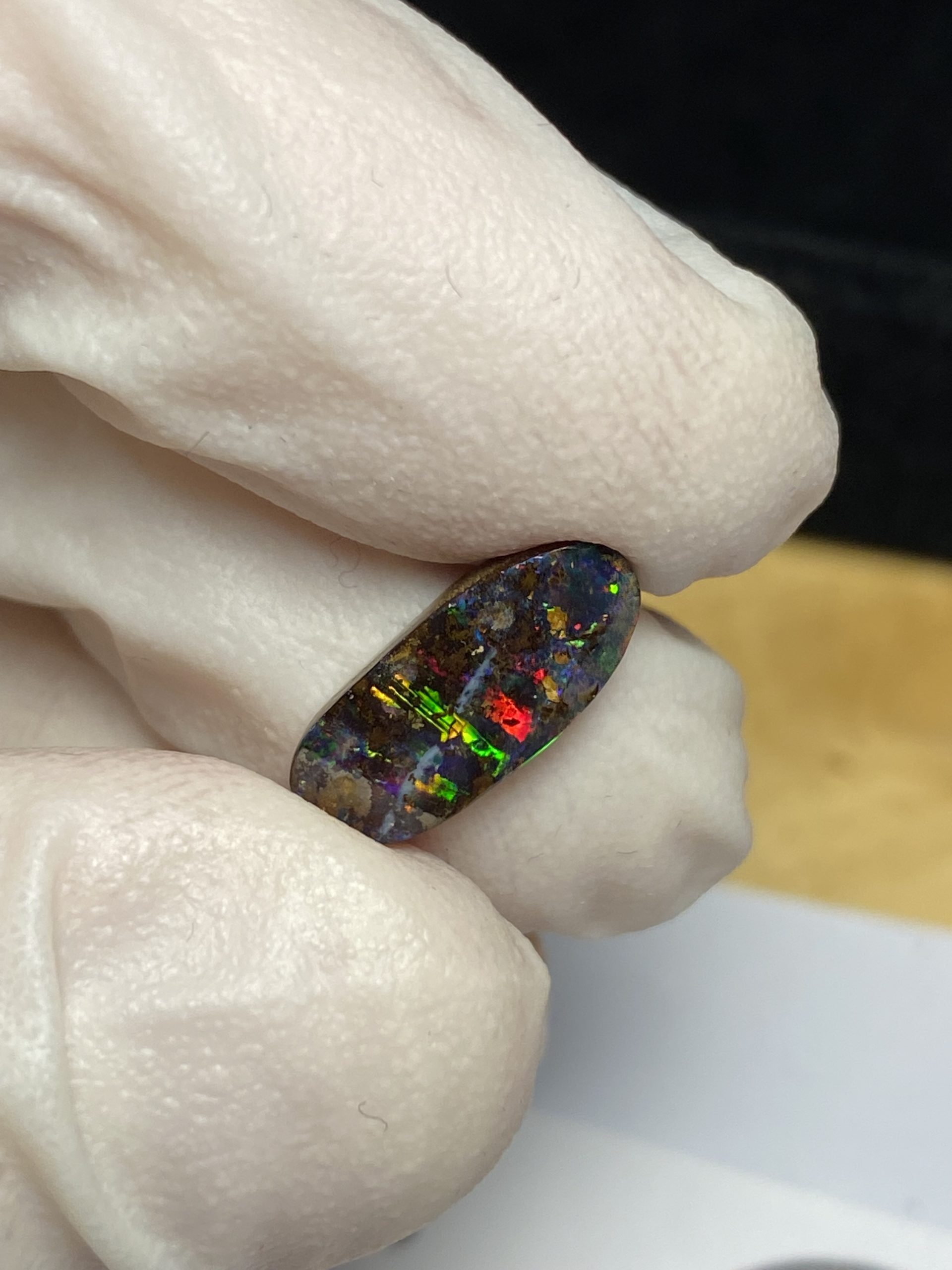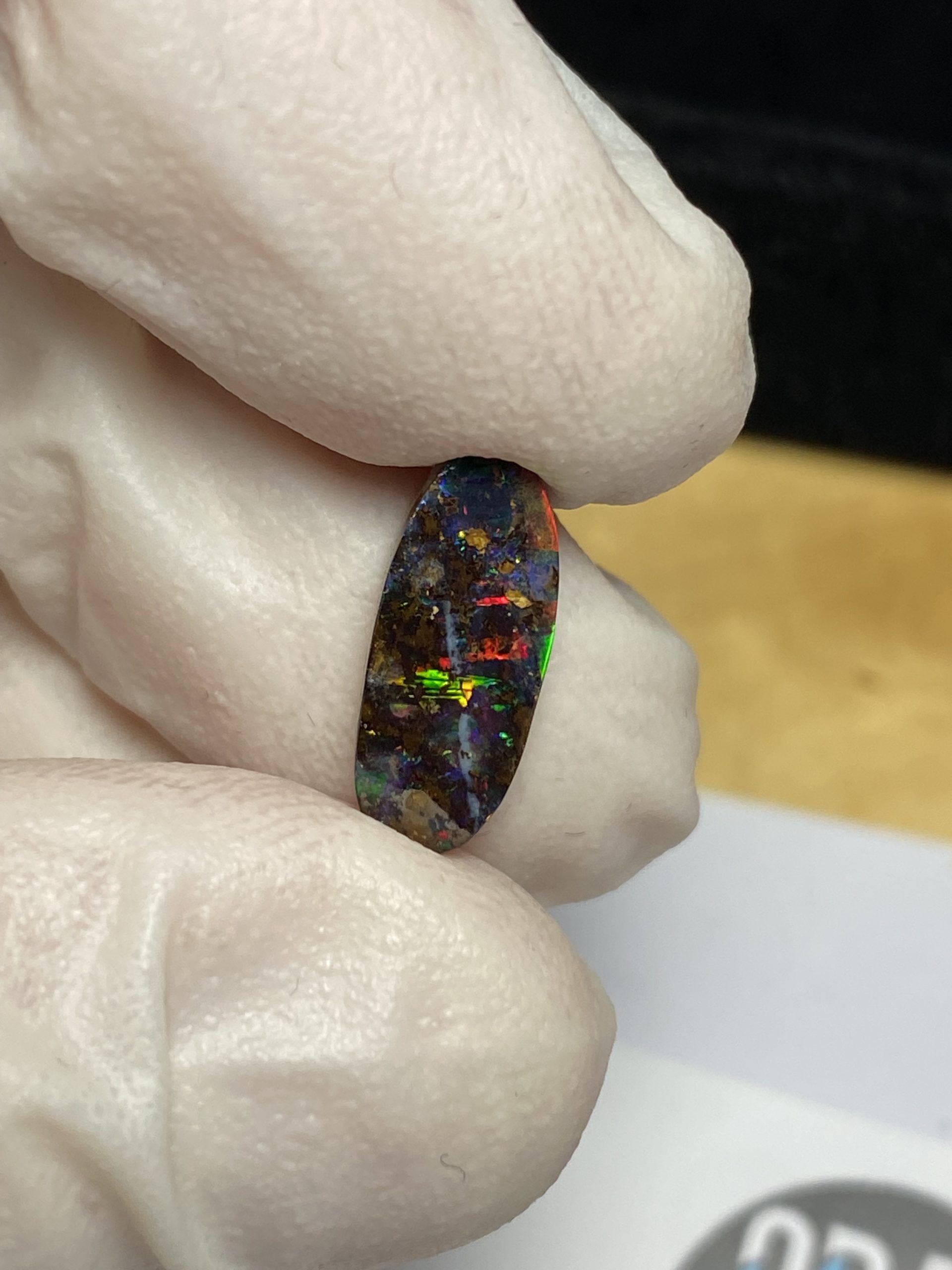 ECLAIRAGE ET COULEURS: Toutes les photos et vidéos ont été prises avec éclairage direct (sous lampe de bureau avec ampoule LED couleur « blanche froide »). Les feux de l’opale seront moins forts sans exposition au soleil ou éclairage direct. Les couleurs de l’opale varient également selon le type d’éclairage et le fond/arrière-plan. En général, le bleu sur les photos/vidéos, est plus proche du violet en réalité sous la plupart des d’éclairages.