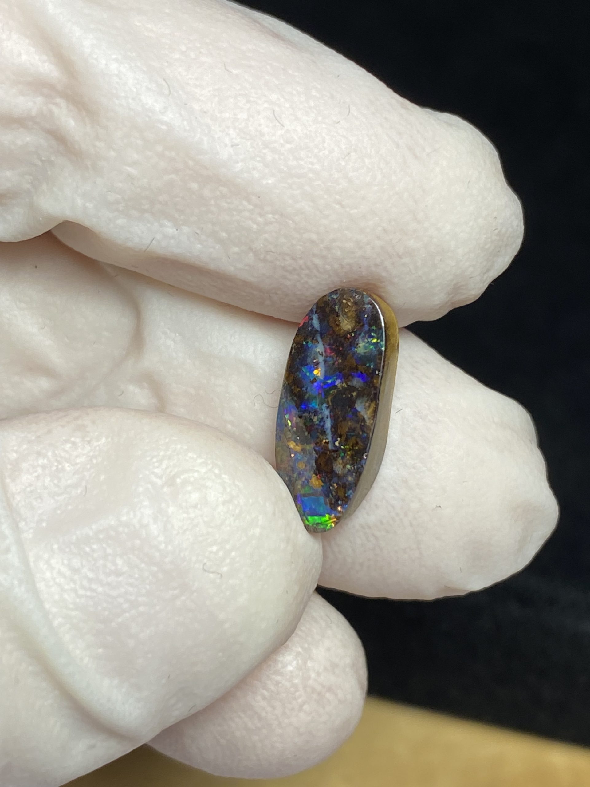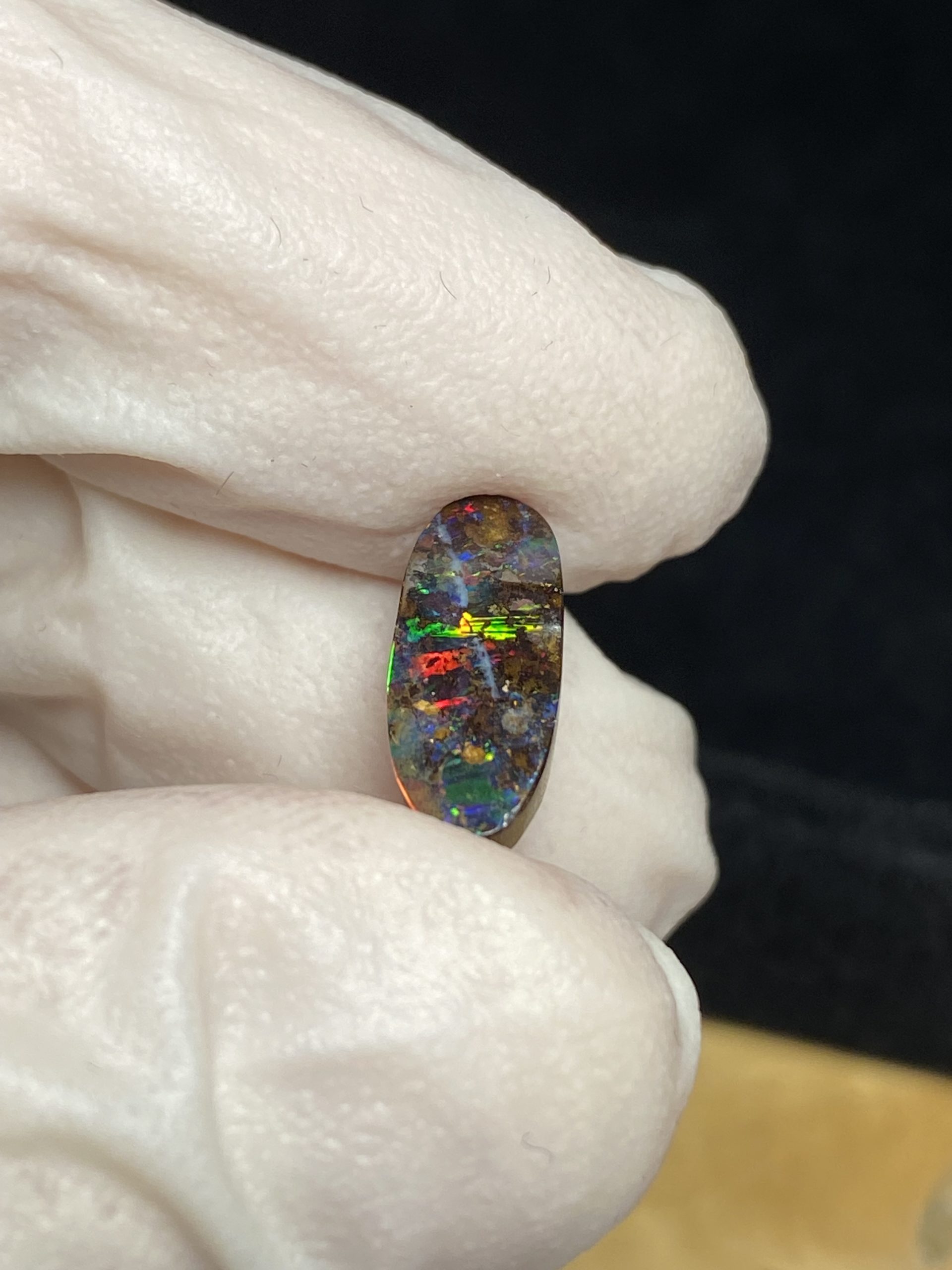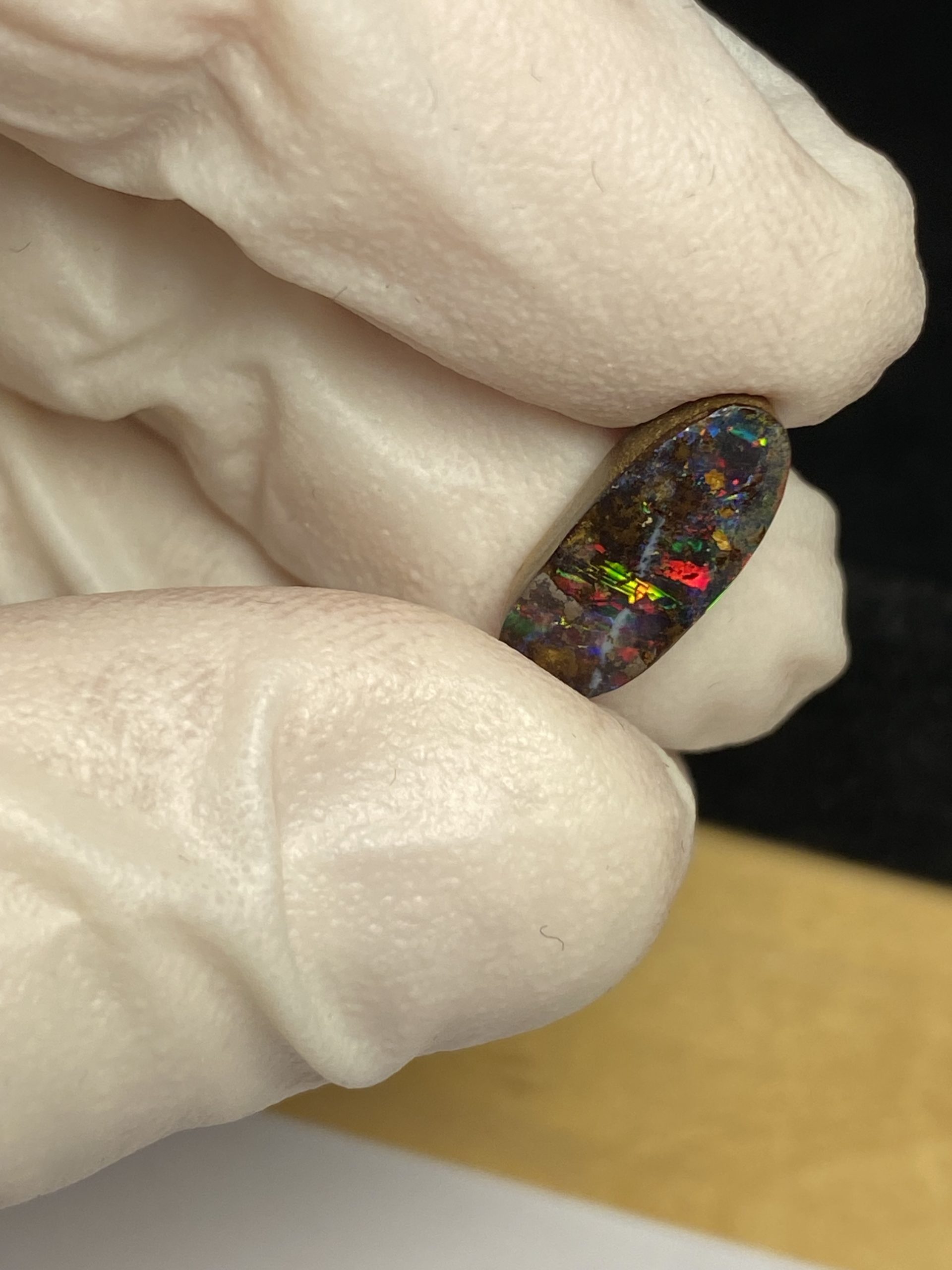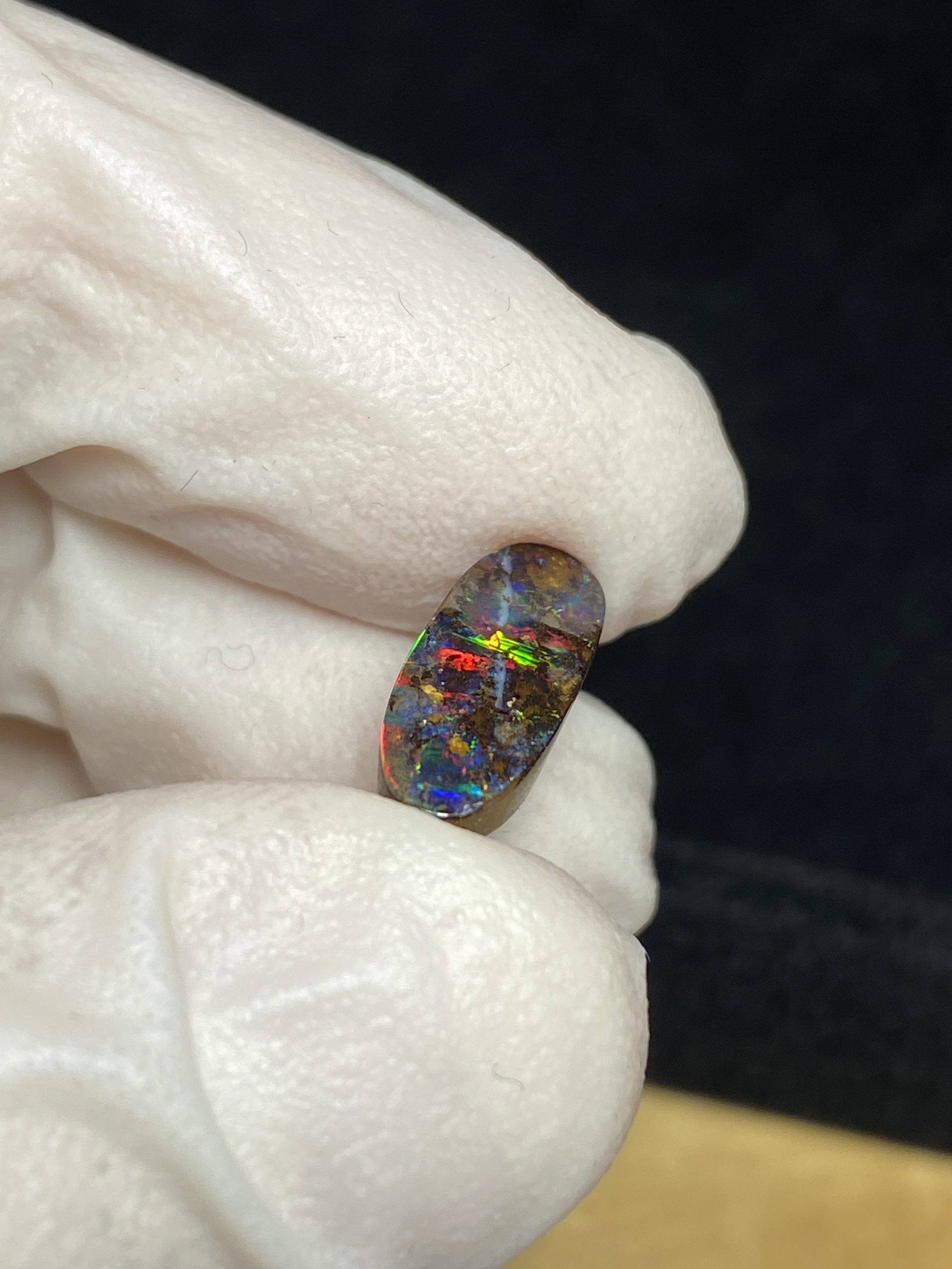 ECLAIRAGE ET COULEURS: Toutes les photos et vidéos ont été prises avec éclairage direct (sous lampe de bureau avec ampoule LED couleur « blanche froide »). Les feux de l’opale seront moins forts sans exposition au soleil ou éclairage direct. Les couleurs de l’opale varient également selon le type d’éclairage et le fond/arrière-plan. En général, le bleu sur les photos/vidéos, est plus proche du violet en réalité sous la plupart des d’éclairages.