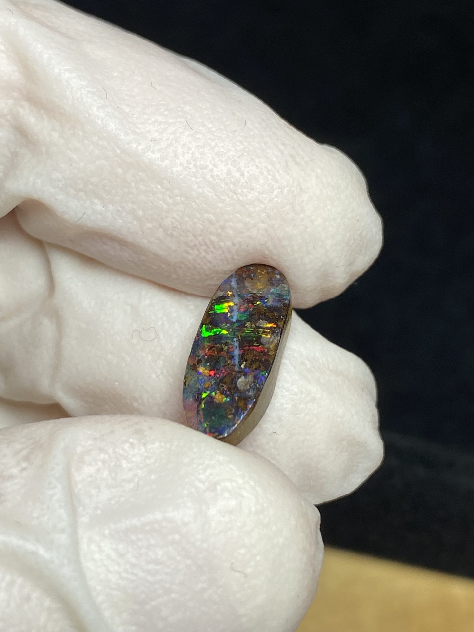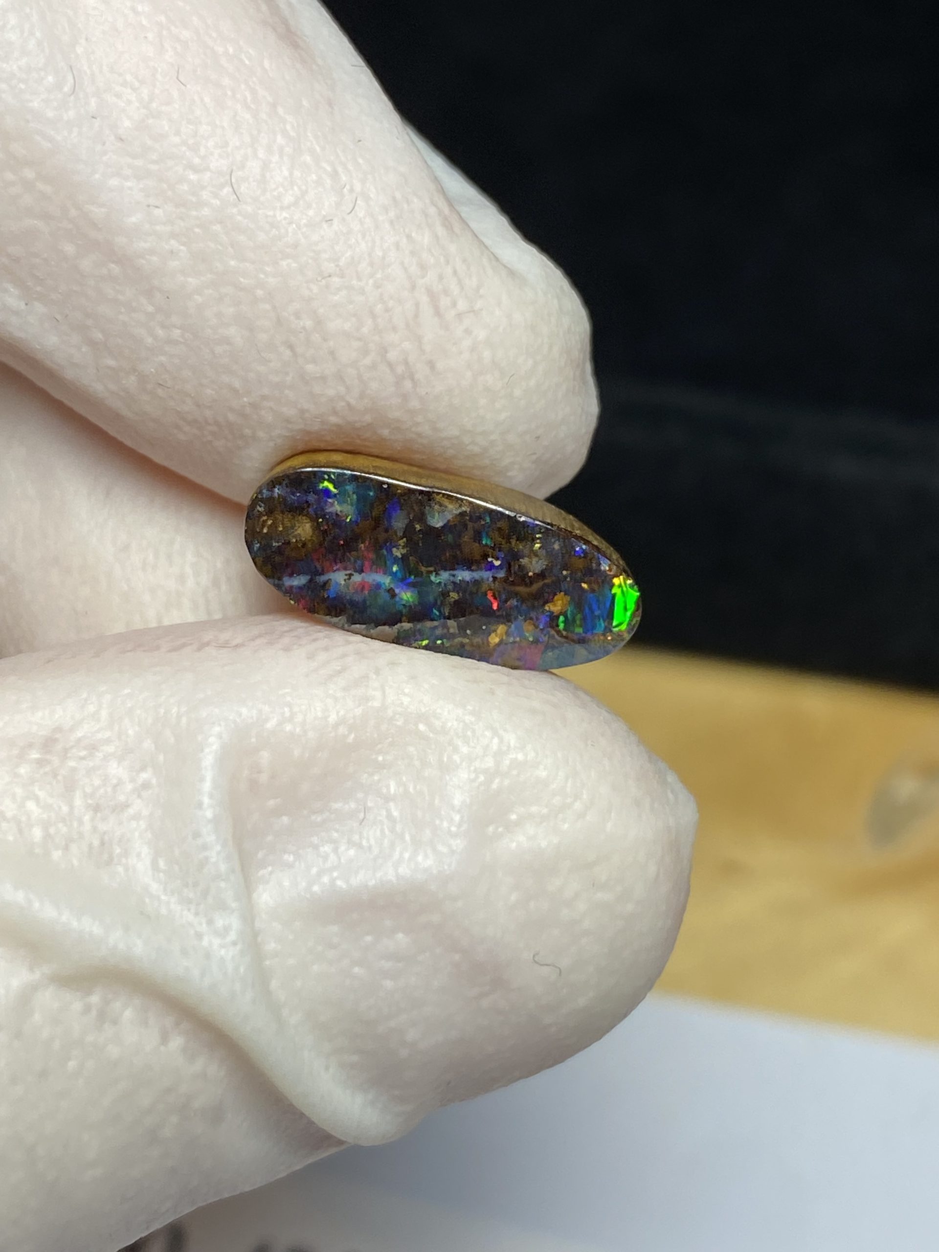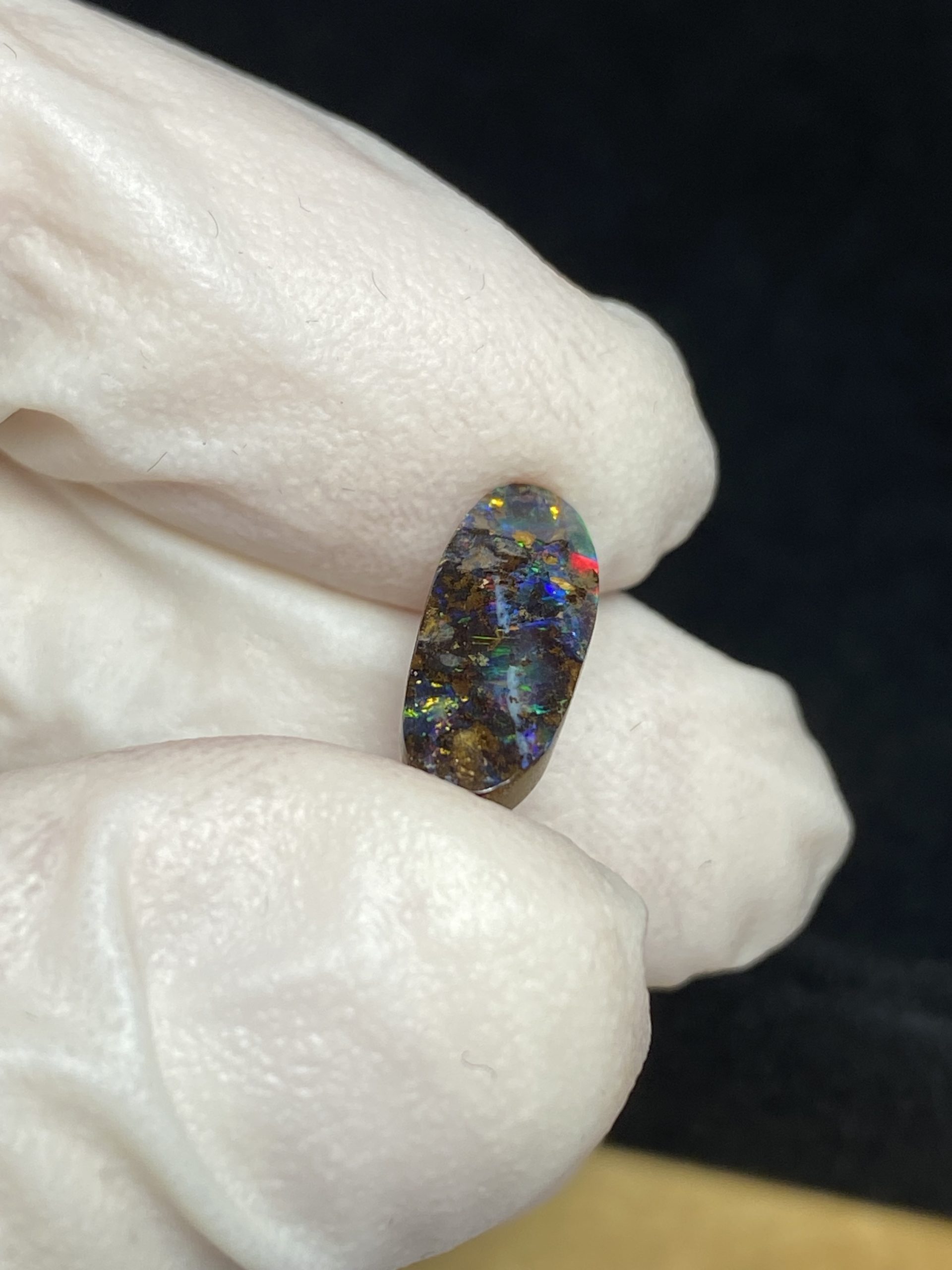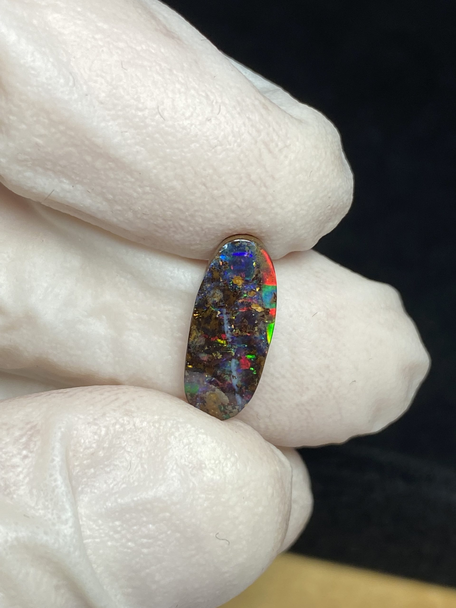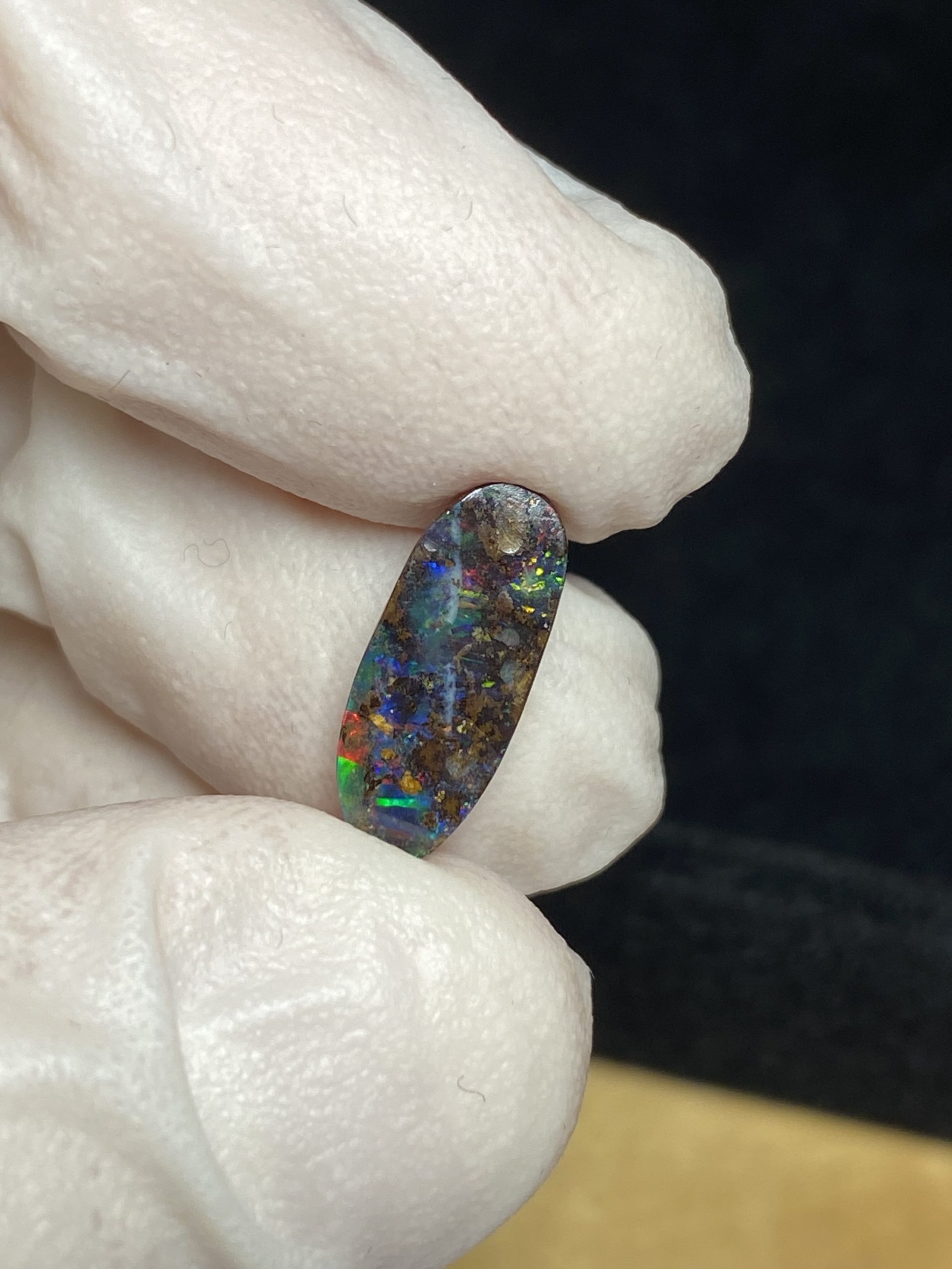 ECLAIRAGE ET COULEURS: Toutes les photos et vidéos ont été prises avec éclairage direct (sous lampe de bureau avec ampoule LED couleur « blanche froide »). Les feux de l’opale seront moins forts sans exposition au soleil ou éclairage direct. Les couleurs de l’opale varient également selon le type d’éclairage et le fond/arrière-plan. En général, le bleu sur les photos/vidéos, est plus proche du violet en réalité sous la plupart des d’éclairages.