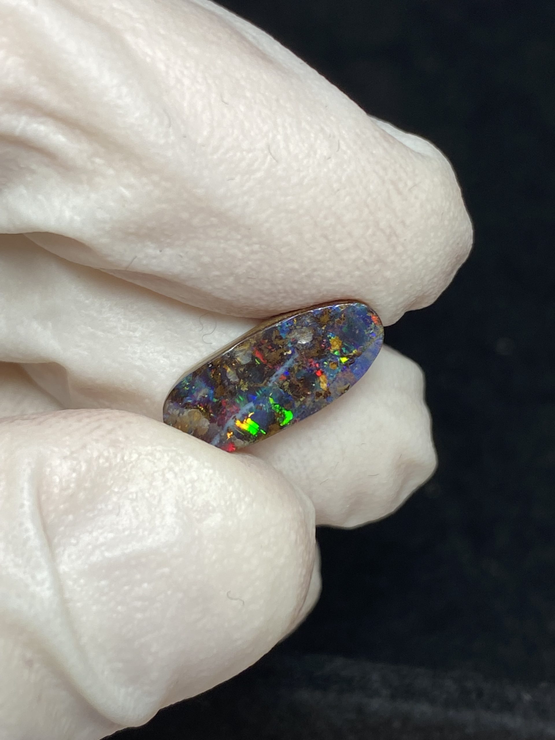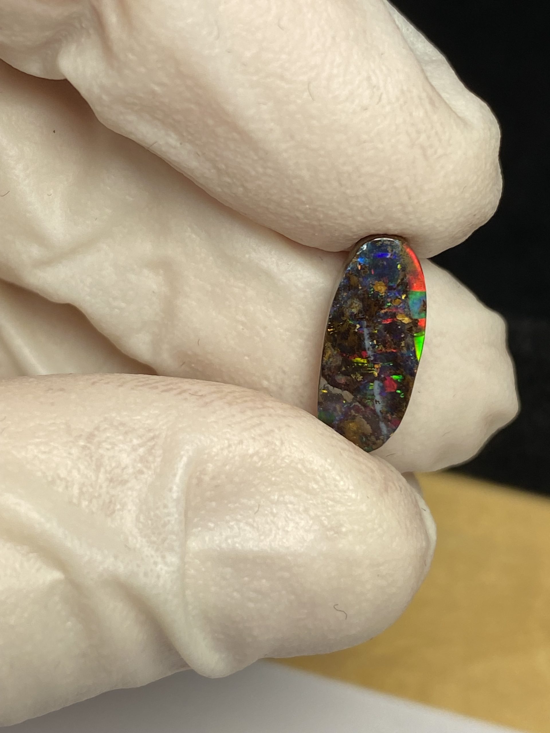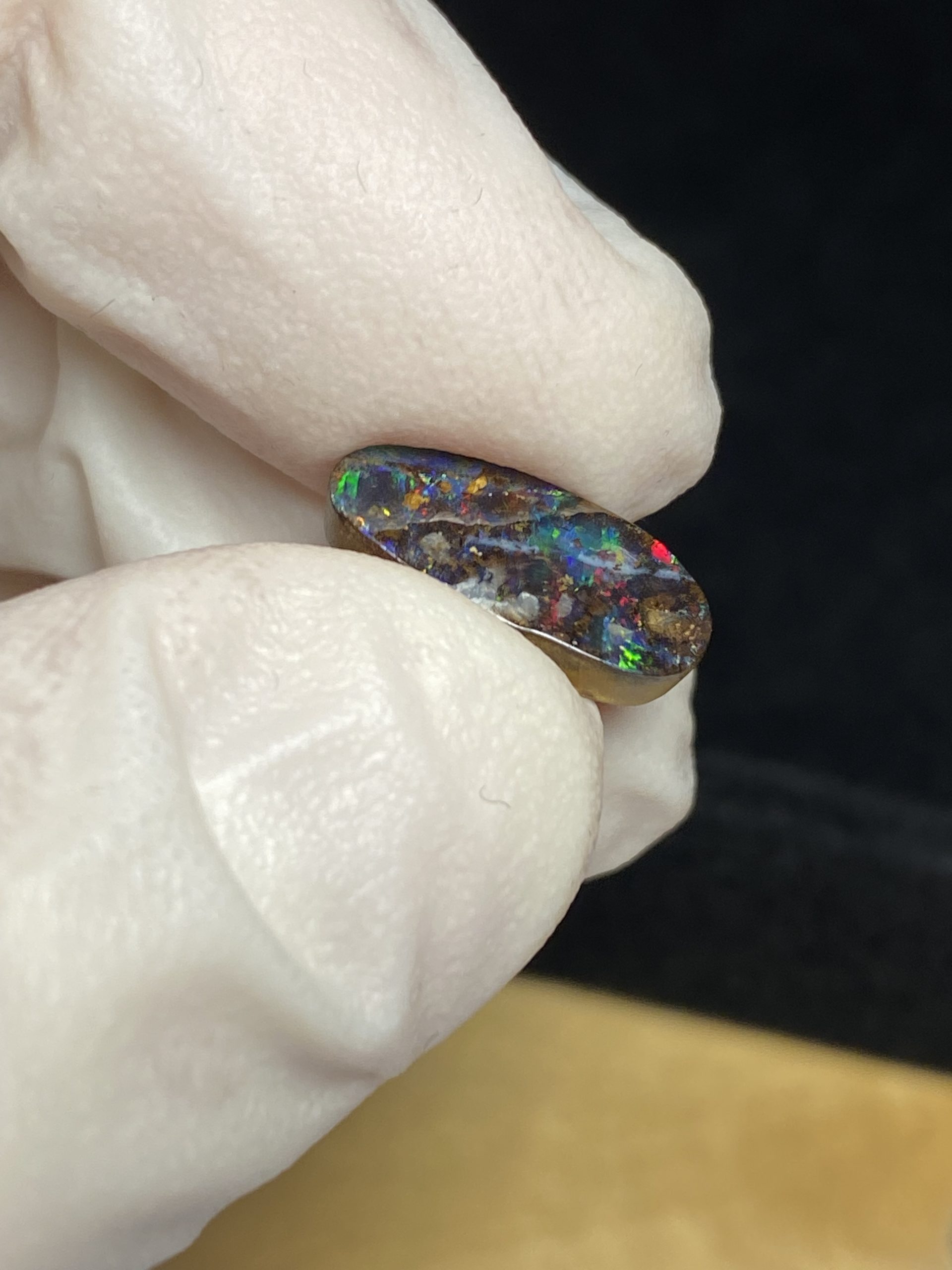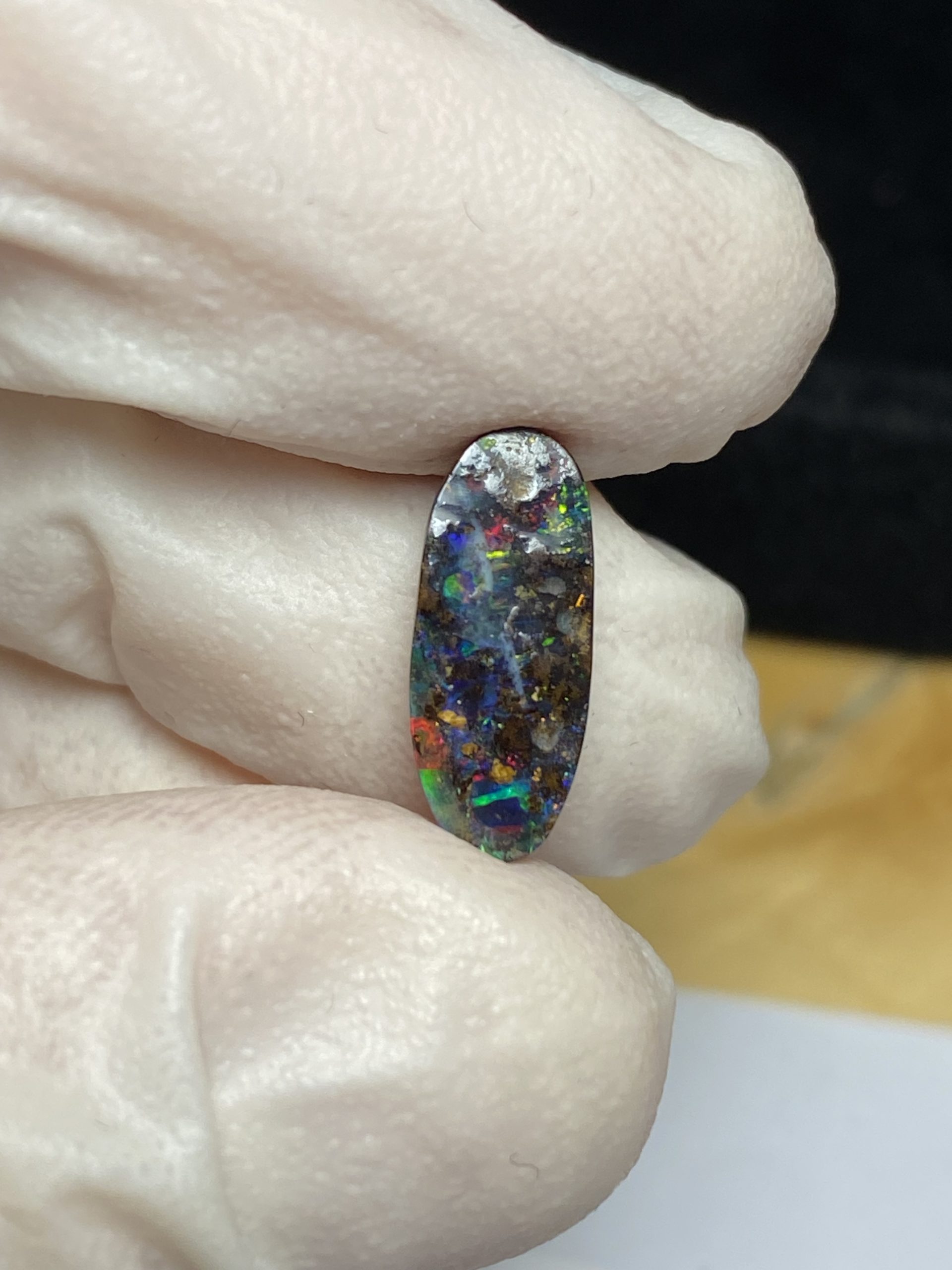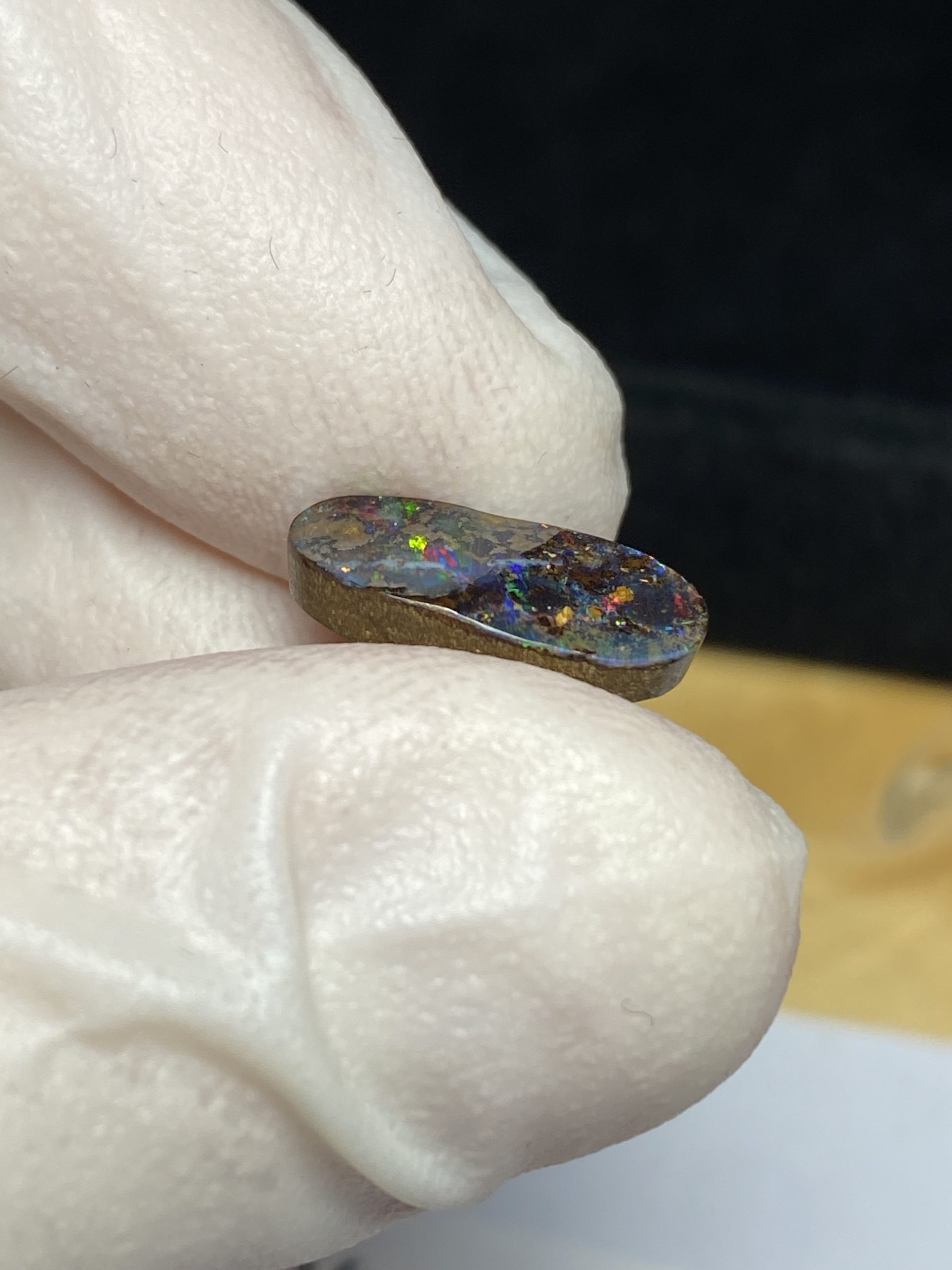 ECLAIRAGE ET COULEURS: Toutes les photos et vidéos ont été prises avec éclairage direct (sous lampe de bureau avec ampoule LED couleur « blanche froide »). Les feux de l’opale seront moins forts sans exposition au soleil ou éclairage direct. Les couleurs de l’opale varient également selon le type d’éclairage et le fond/arrière-plan. En général, le bleu sur les photos/vidéos, est plus proche du violet en réalité sous la plupart des d’éclairages.