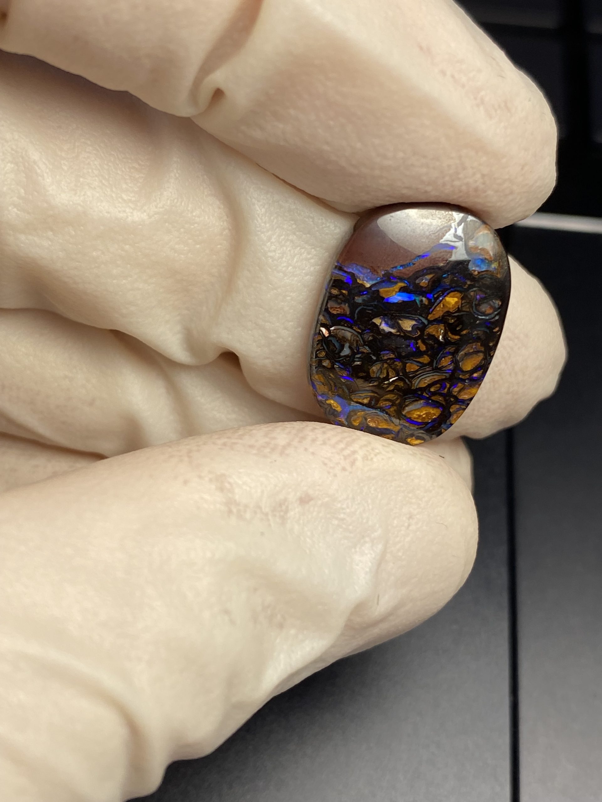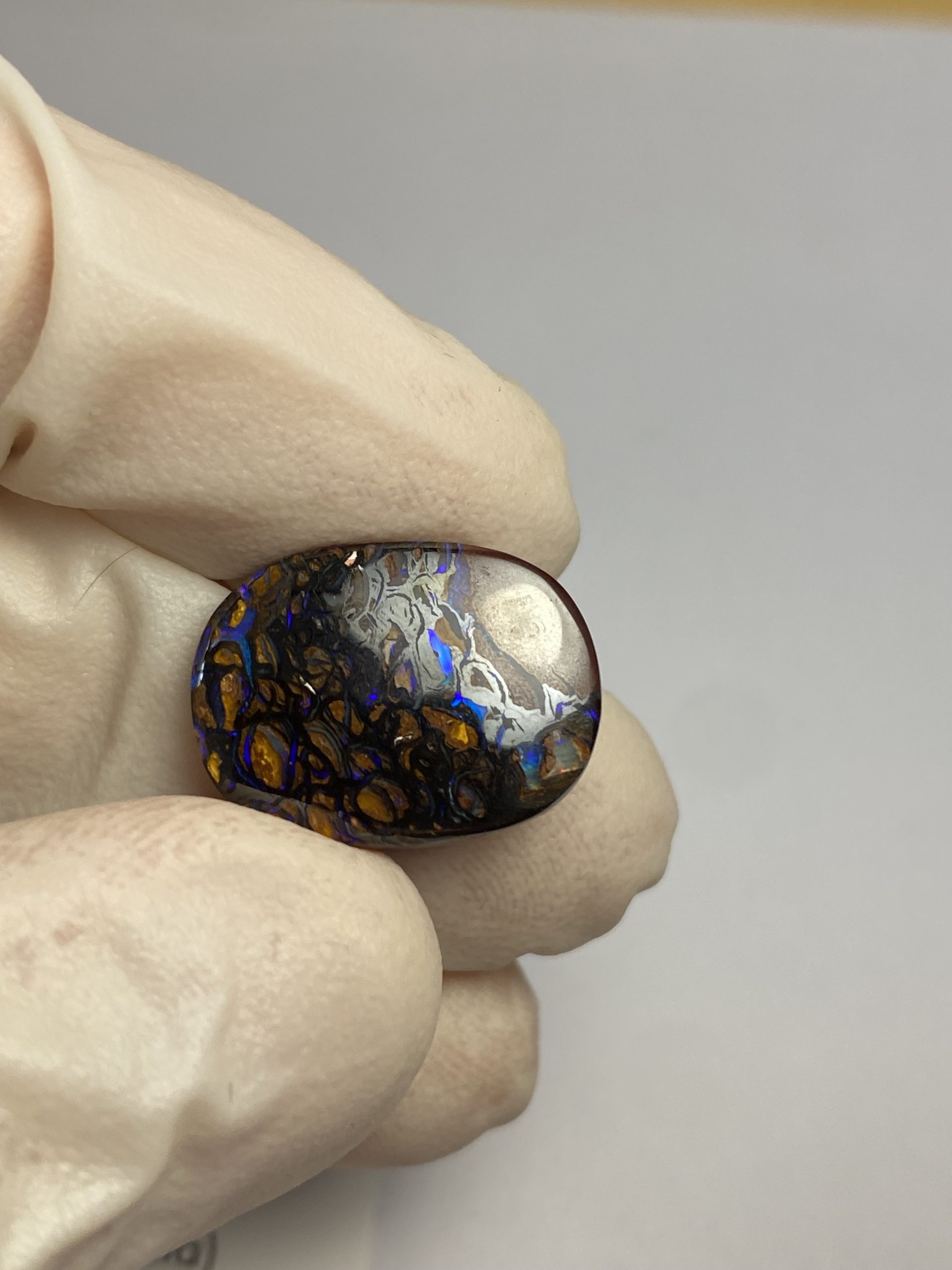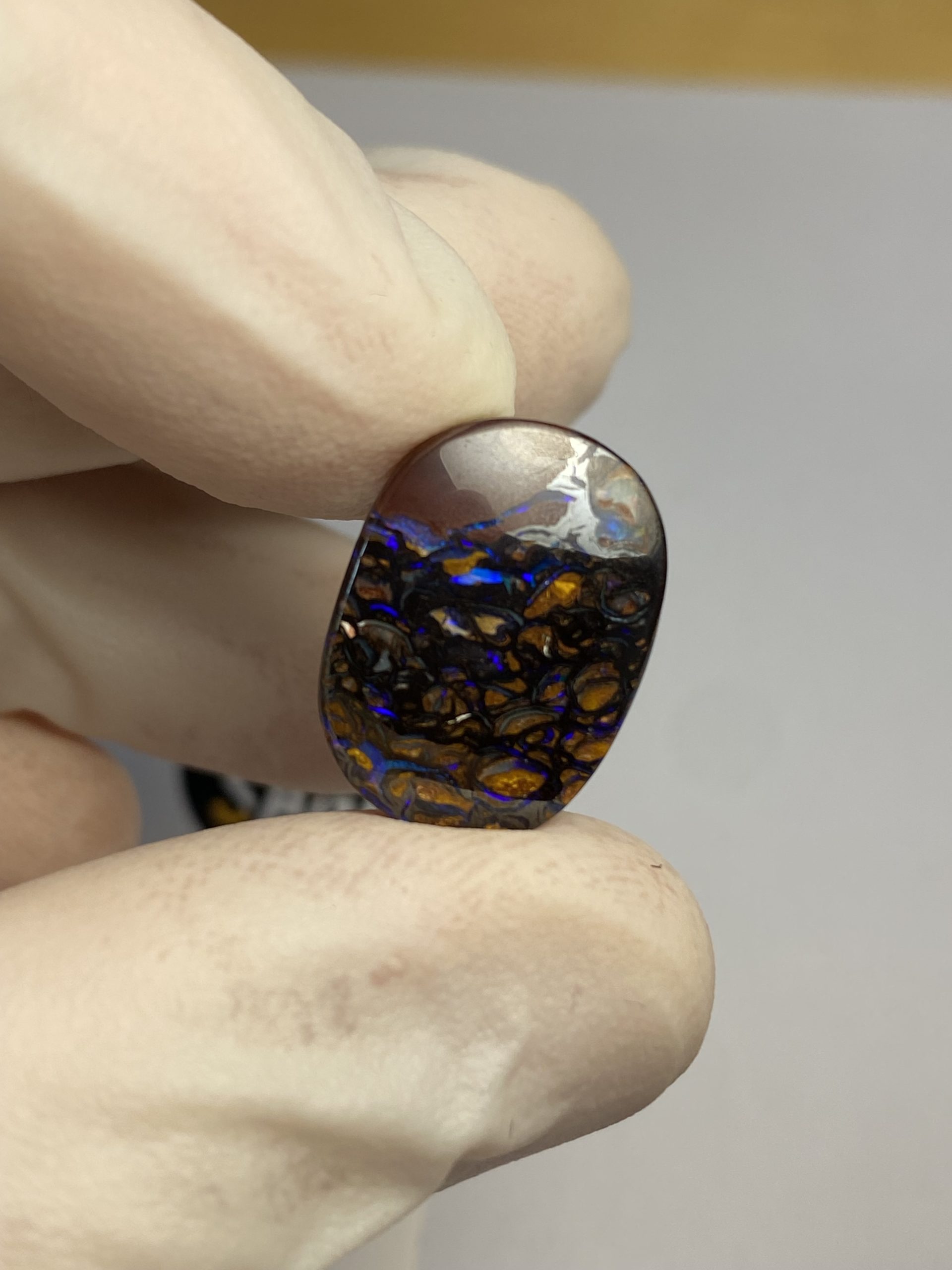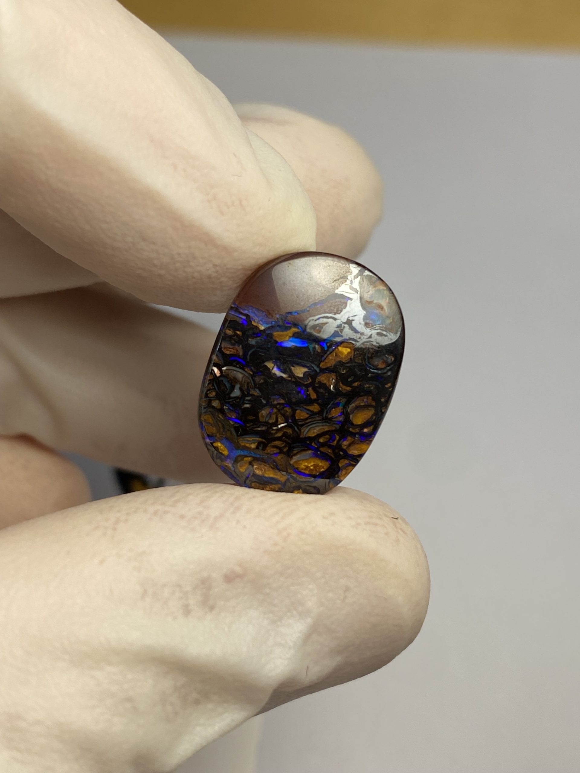 ECLAIRAGE ET COULEURS: Toutes les photos et vidéos ont été prises avec éclairage direct (sous lampe de bureau avec ampoule LED couleur « blanche froide »). Les feux de l’opale seront moins forts sans exposition au soleil ou éclairage direct. Les couleurs de l’opale varient également selon le type d’éclairage et le fond/arrière-plan. En général, le bleu sur les photos/vidéos, est plus proche du violet en réalité sous la plupart des d’éclairages.