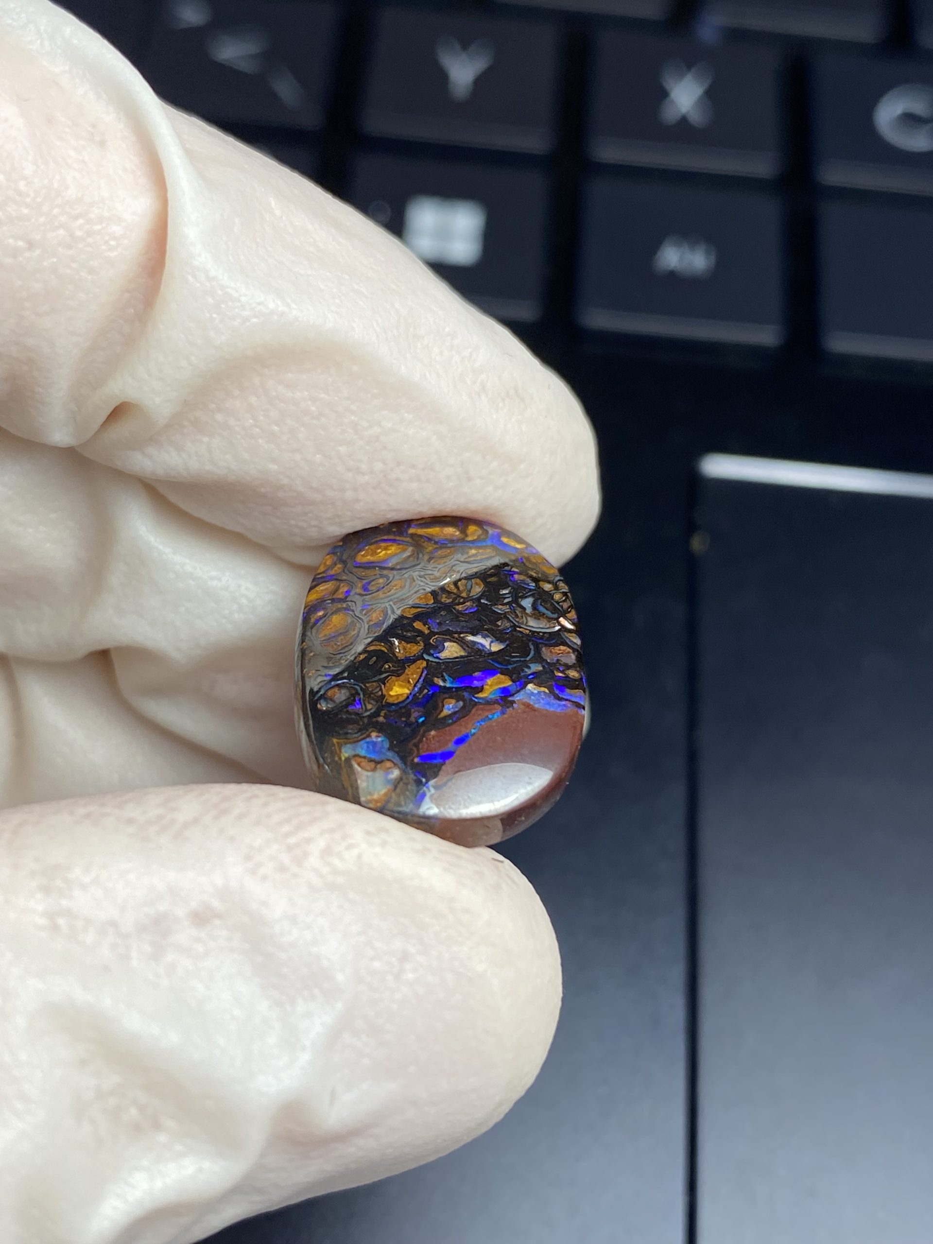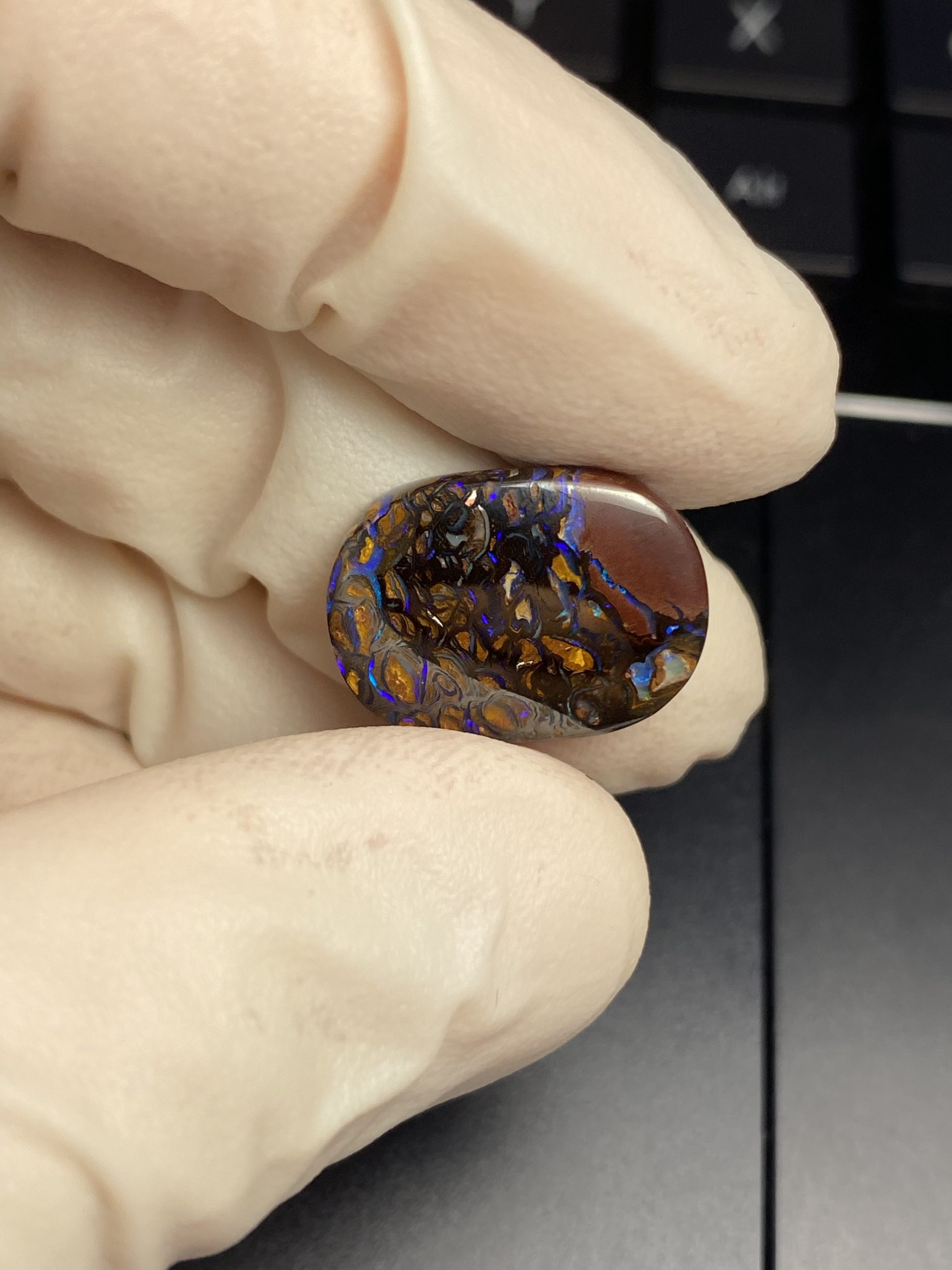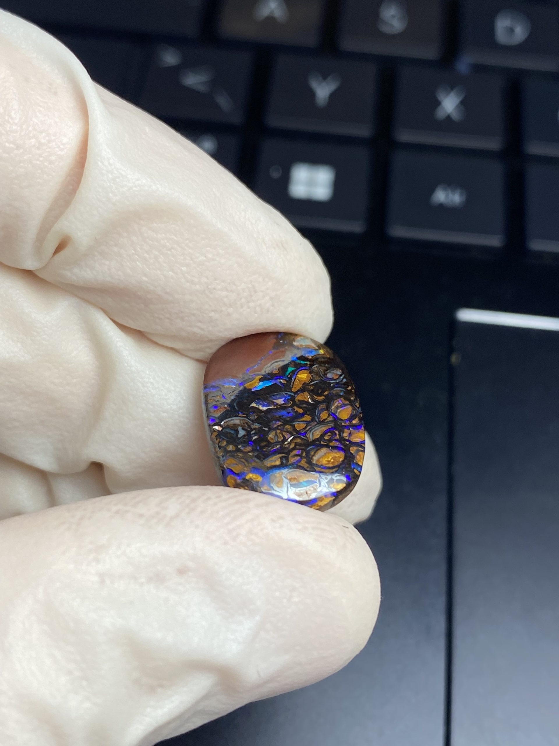 ECLAIRAGE ET COULEURS: Toutes les photos et vidéos ont été prises avec éclairage direct (sous lampe de bureau avec ampoule LED couleur « blanche froide »). Les feux de l’opale seront moins forts sans exposition au soleil ou éclairage direct. Les couleurs de l’opale varient également selon le type d’éclairage et le fond/arrière-plan. En général, le bleu sur les photos/vidéos, est plus proche du violet en réalité sous la plupart des d’éclairages.