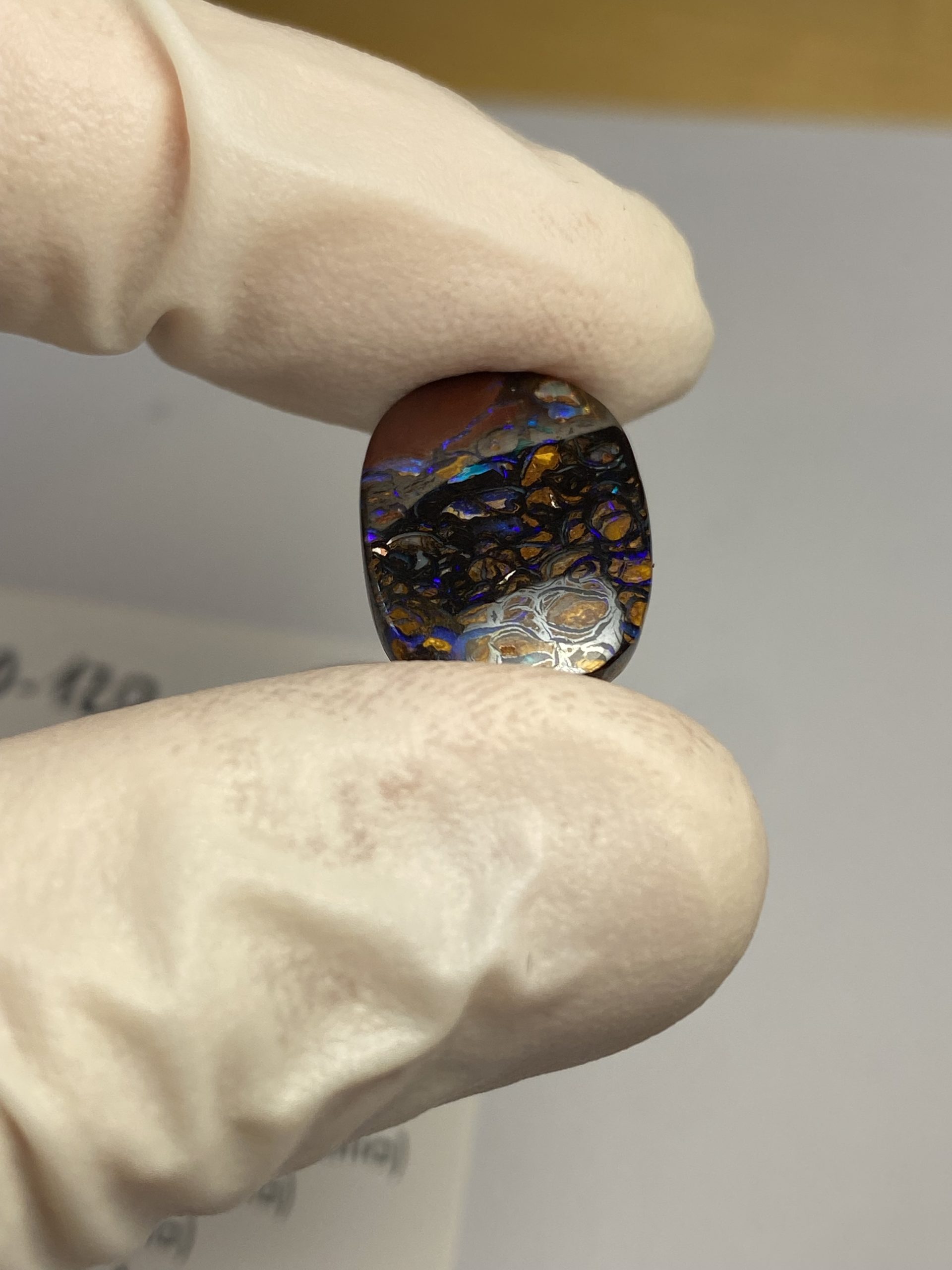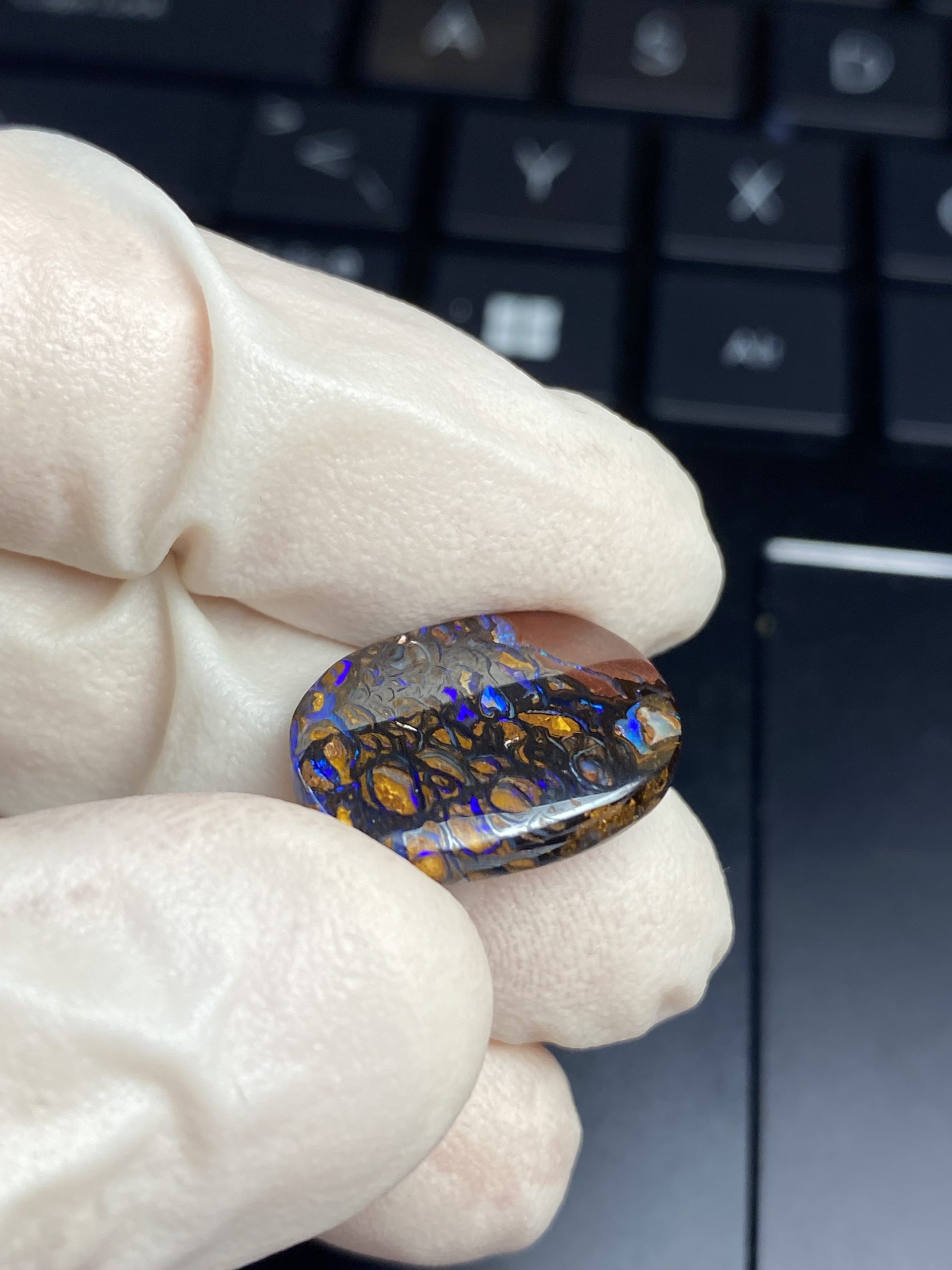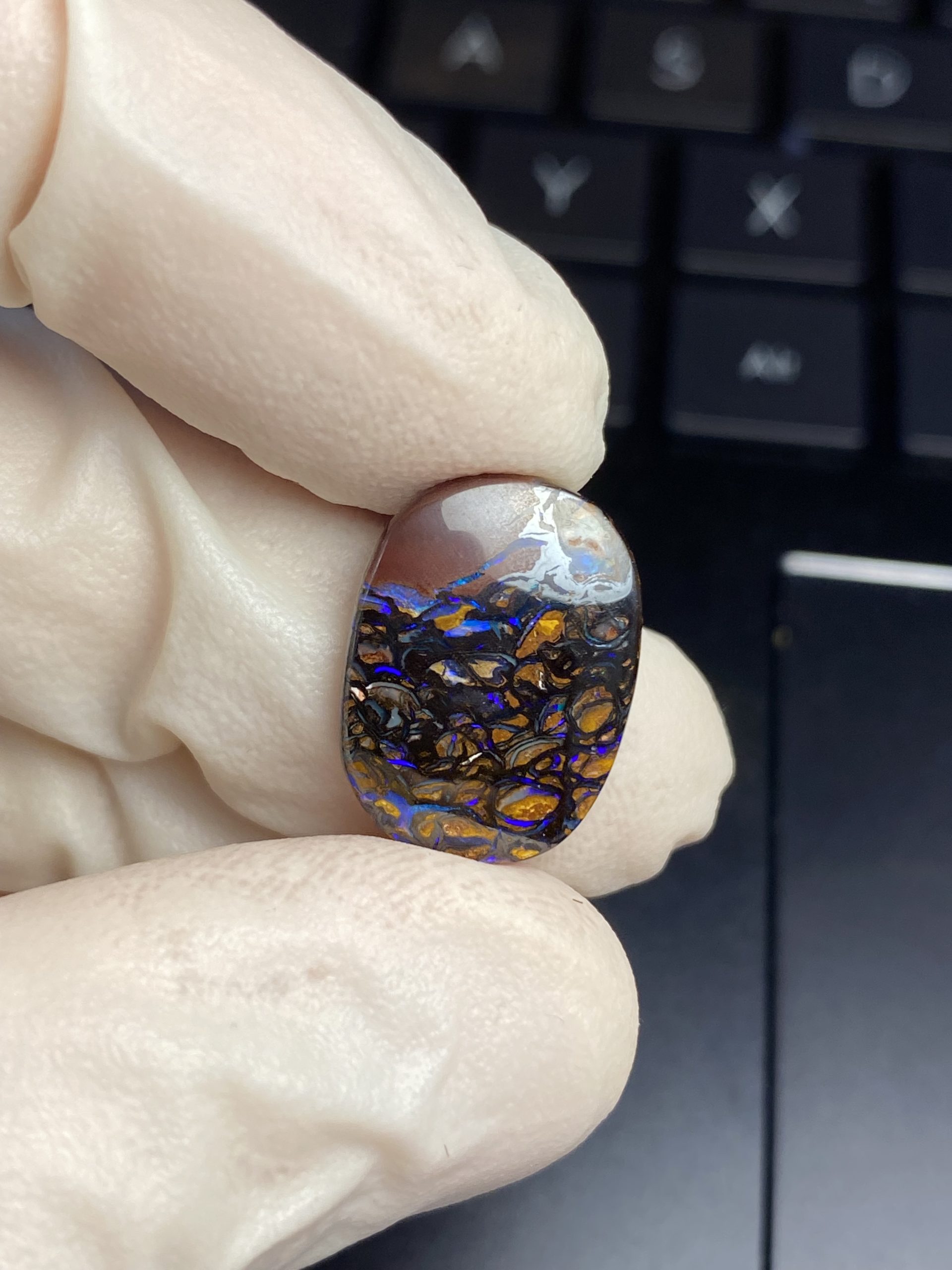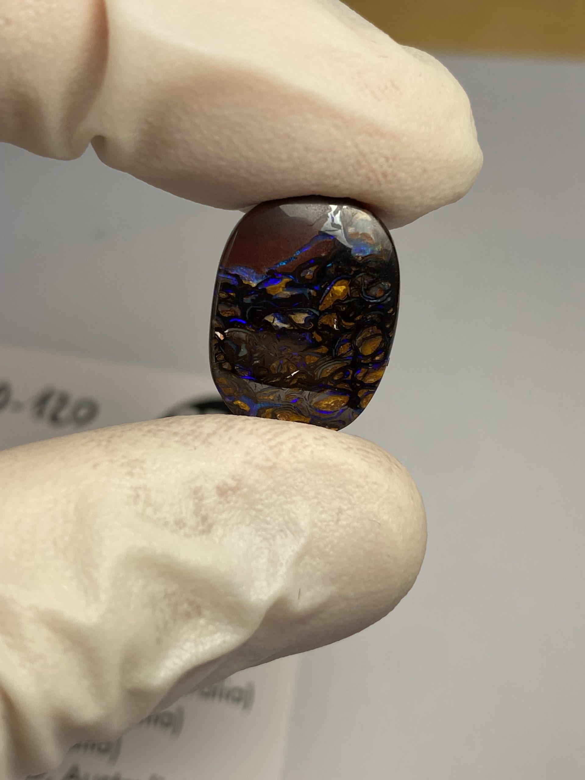 ECLAIRAGE ET COULEURS: Toutes les photos et vidéos ont été prises avec éclairage direct (sous lampe de bureau avec ampoule LED couleur « blanche froide »). Les feux de l’opale seront moins forts sans exposition au soleil ou éclairage direct. Les couleurs de l’opale varient également selon le type d’éclairage et le fond/arrière-plan. En général, le bleu sur les photos/vidéos, est plus proche du violet en réalité sous la plupart des d’éclairages.