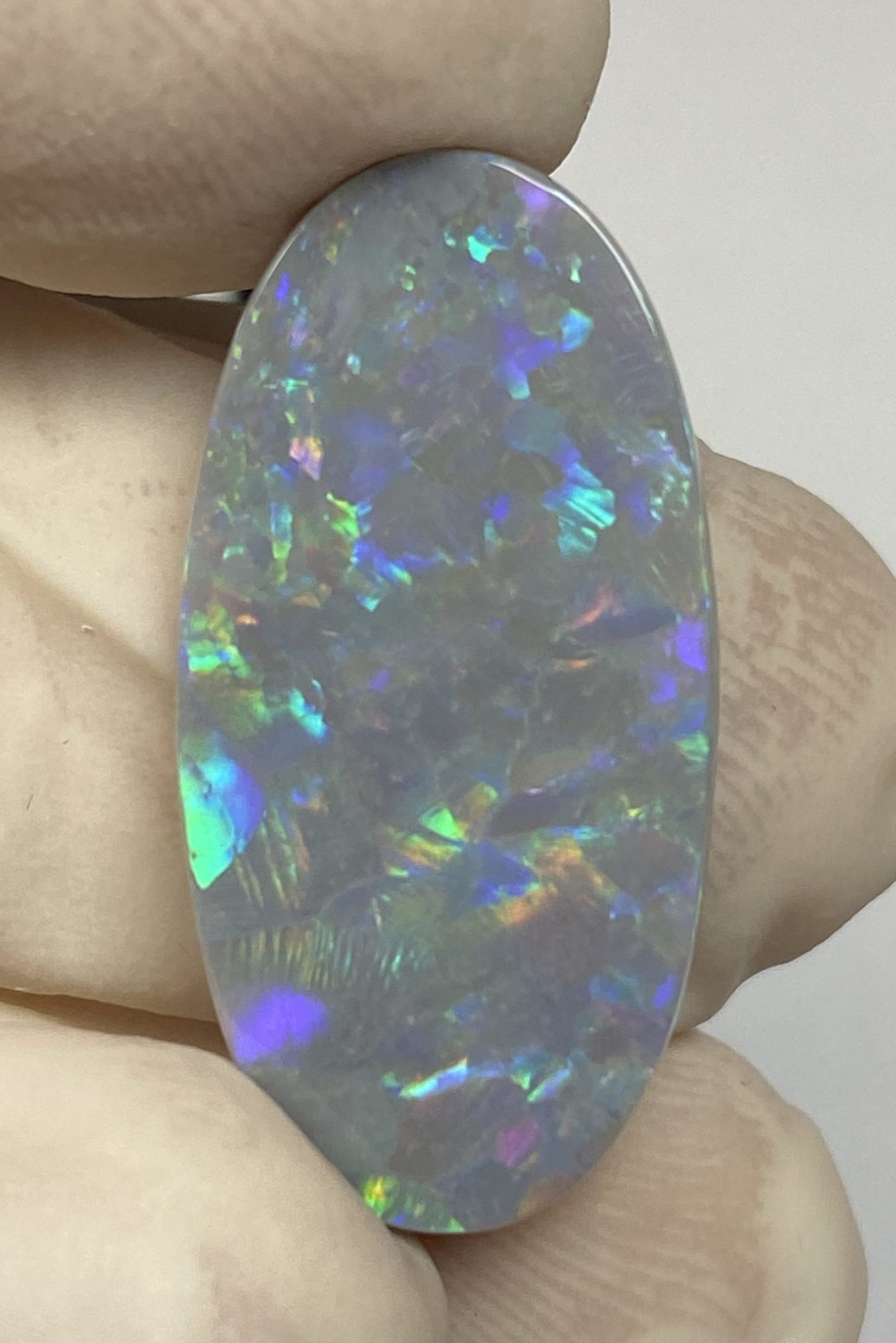 ECLAIRAGE ET COULEURS: Toutes les photos et vidéos ont été prises avec éclairage direct (sous lampe de bureau avec ampoule LED couleur « blanche froide »). Les feux de l’opale seront moins forts sans exposition au soleil ou éclairage direct. Les couleurs de l’opale varient également selon le type d’éclairage et le fond/arrière-plan. En général, le bleu sur les photos/vidéos, est plus proche du violet en réalité sous la plupart des d’éclairages.