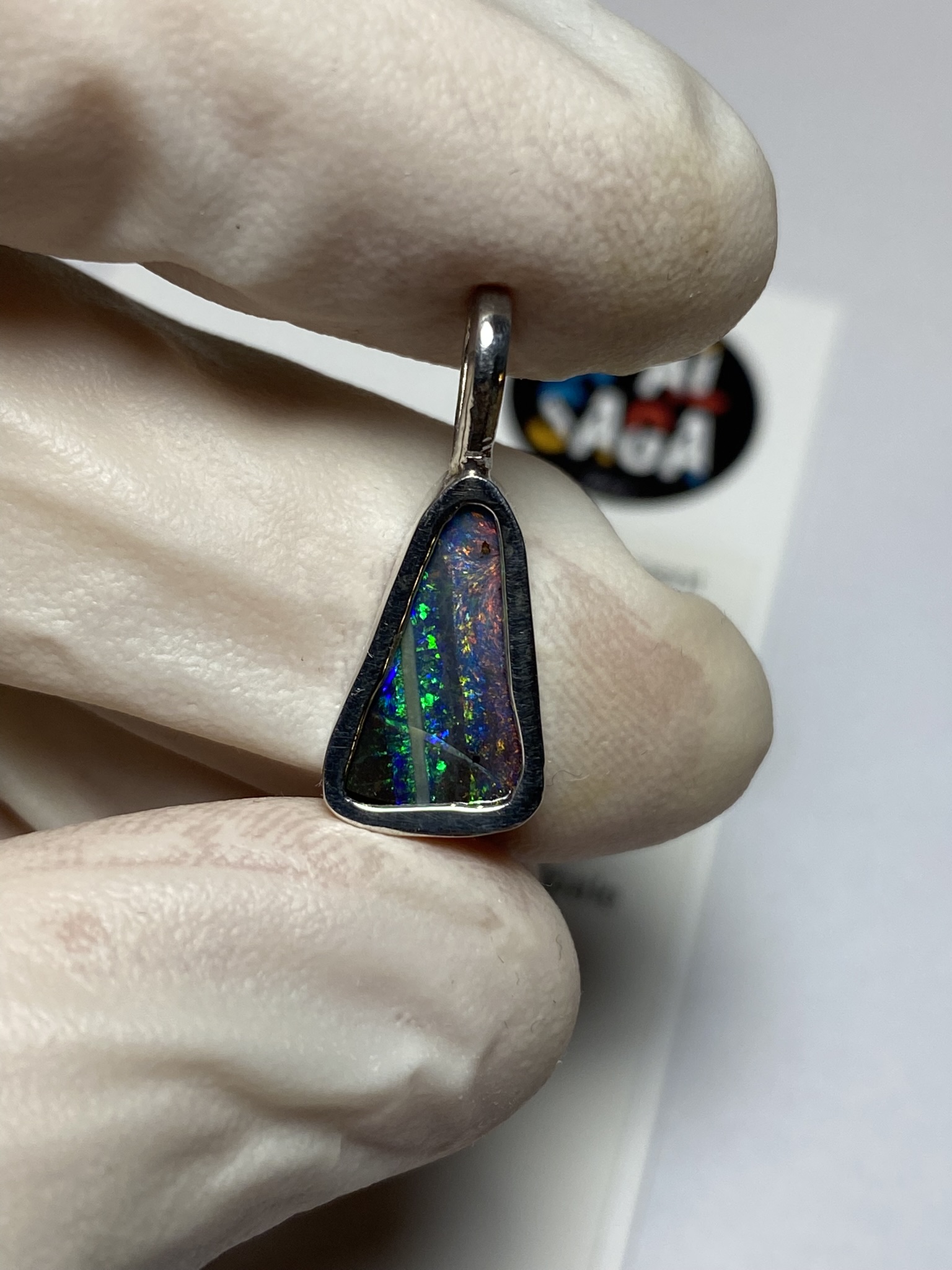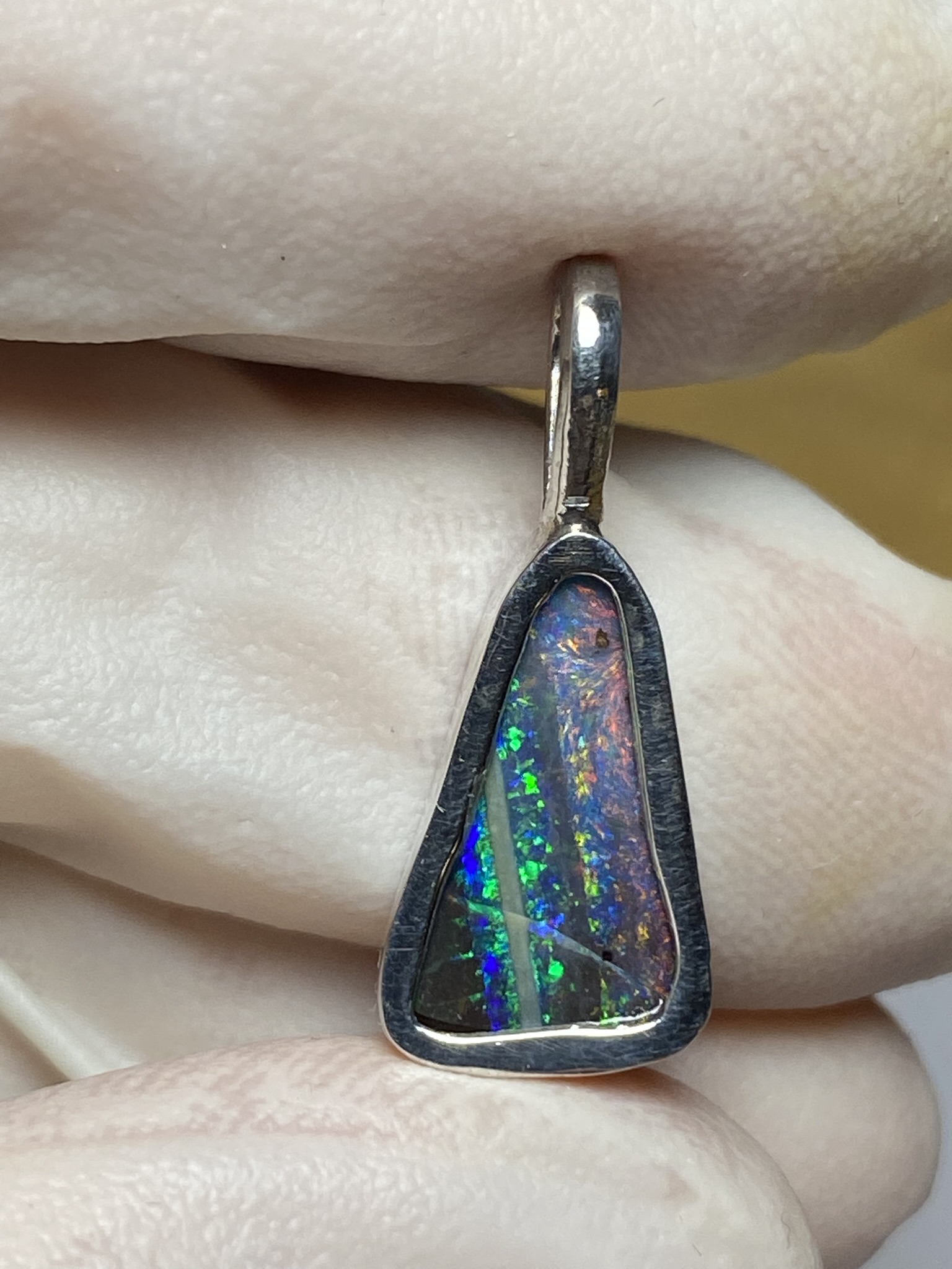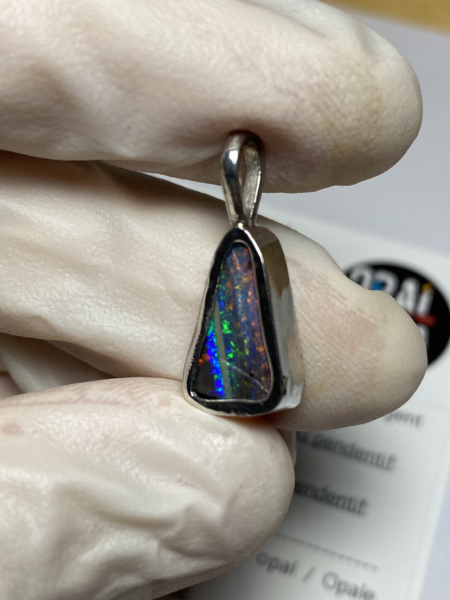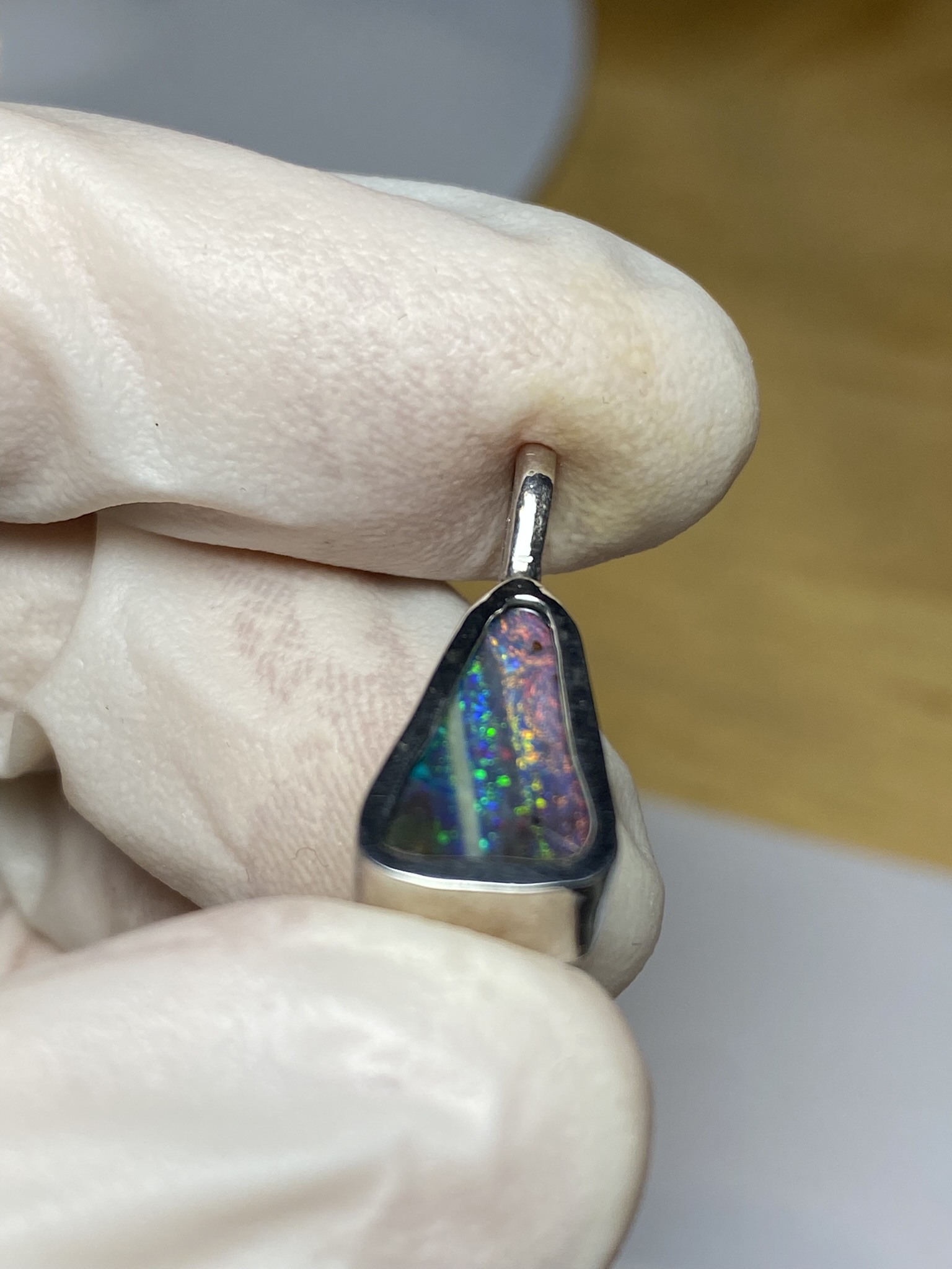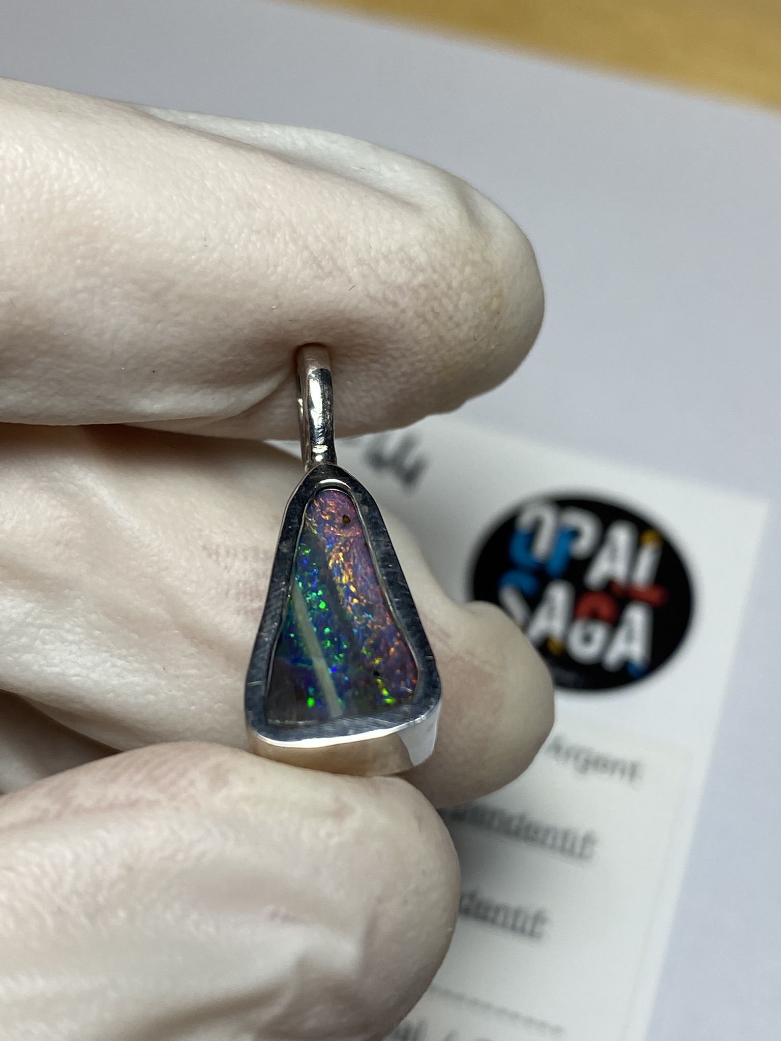 ECLAIRAGE ET COULEURS: Toutes les photos et vidéos ont été prises avec éclairage direct (sous lampe de bureau avec ampoule LED couleur « blanche froide »). Les feux de l’opale seront moins forts sans exposition au soleil ou éclairage direct. Les couleurs de l’opale varient également selon le type d’éclairage et le fond/arrière-plan. En général, le bleu sur les photos/vidéos, est plus proche du violet en réalité sous la plupart des d’éclairages.